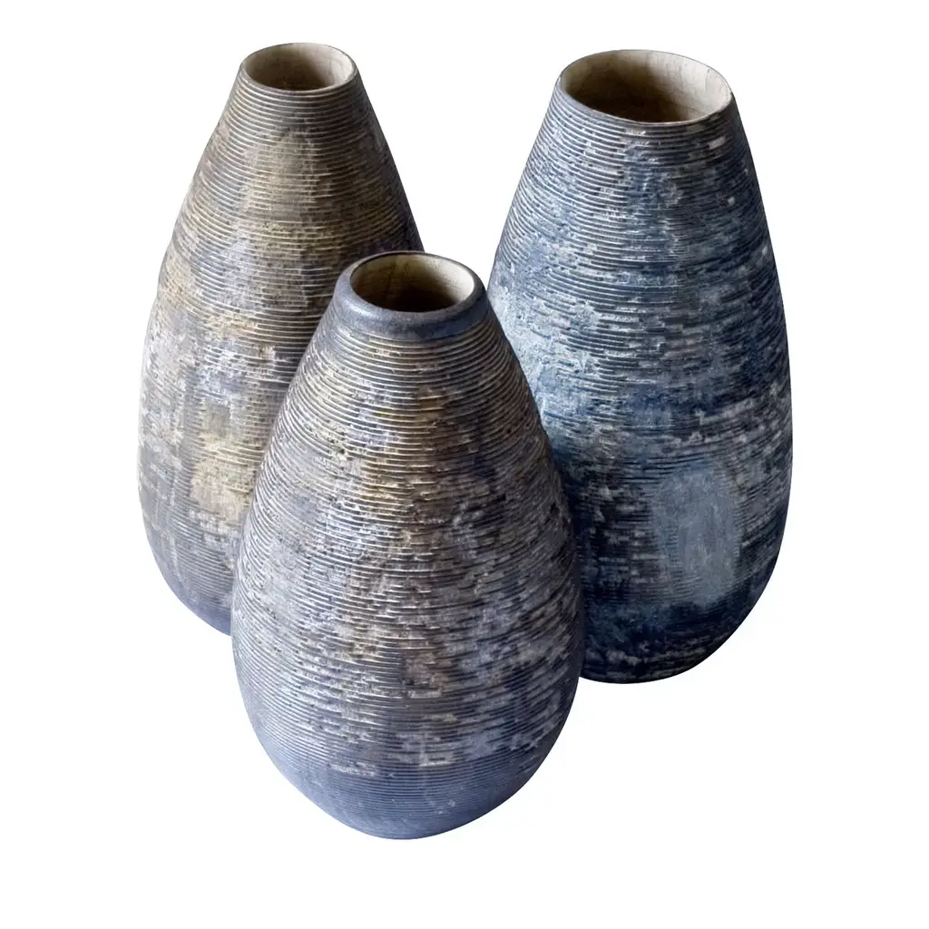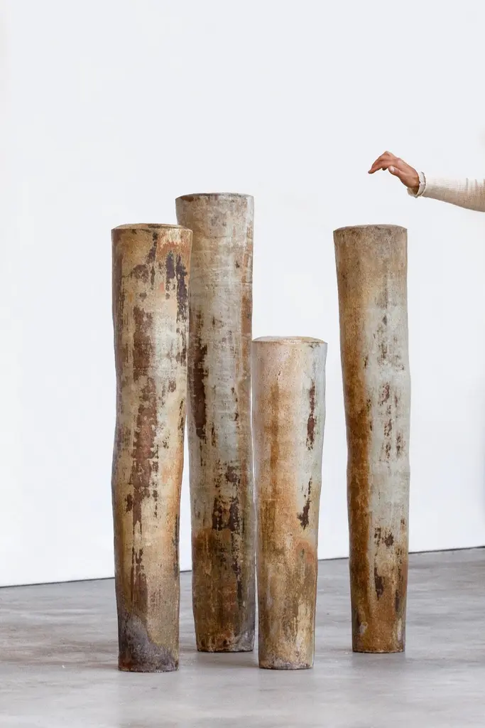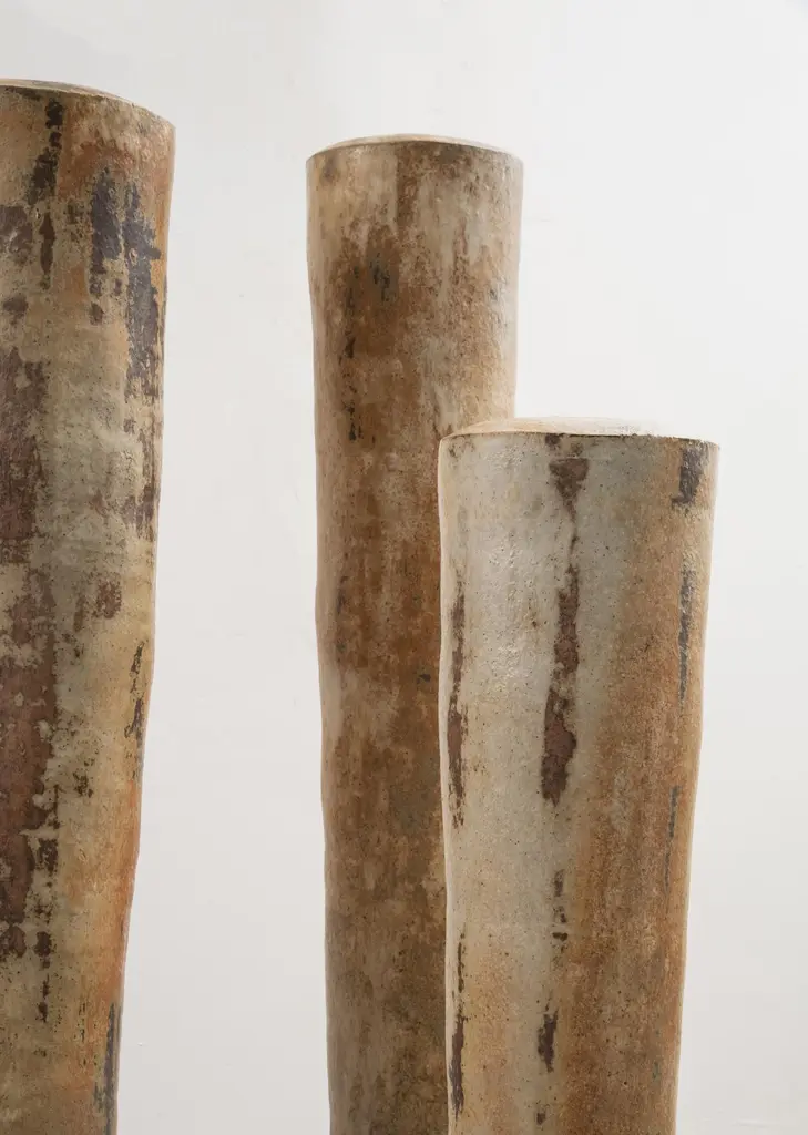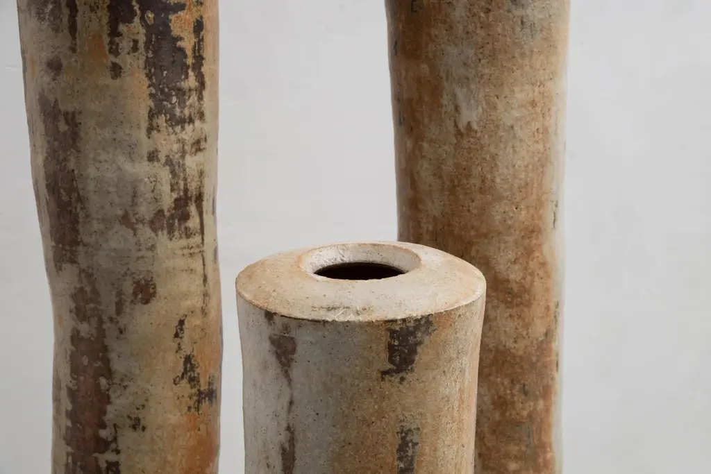 Contemporary abstract stoneware sculptures by Valéry Maillot, 2015.Uniques Pieces, La Borne, France._______Dimensions : (1) H 80 cm – (2) (3) H 112 cm – (4) H 123 cm_______Valéry Maillot's work consists in experimenting shapes and ways of firing his sculptures, which are sometimes shaped by the lathe, the plate or the columbine. Convinced that the project takes a more important part over the object, the construction of a wood-burning kiln (anagama type) in his workshop allows him to explore slow firing and the effect of the passage of flames on his stoneware ceramics. The artist reproduces the same forms, the same gestures to the point of obsession in order to observe the evolution of the technique until he is forgotten. What he’s looking for is to seek out the challenge that arises between the mechanics of shaping and the unknown of experience.
