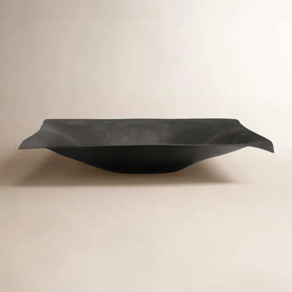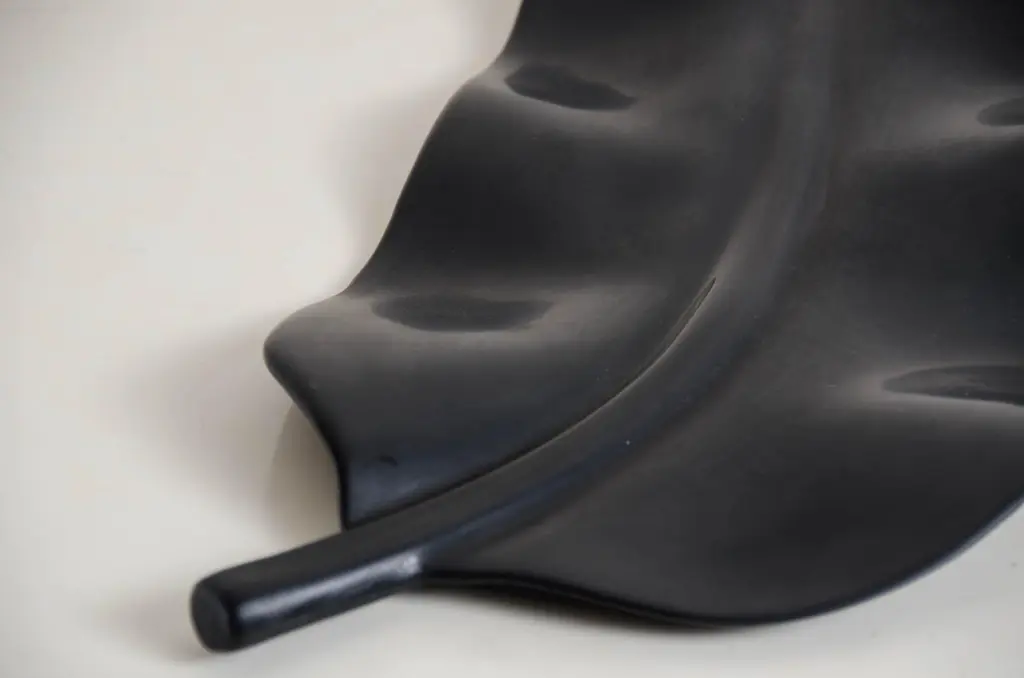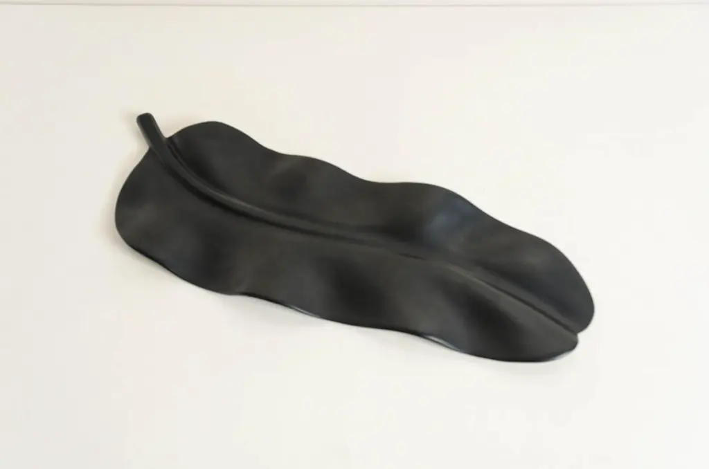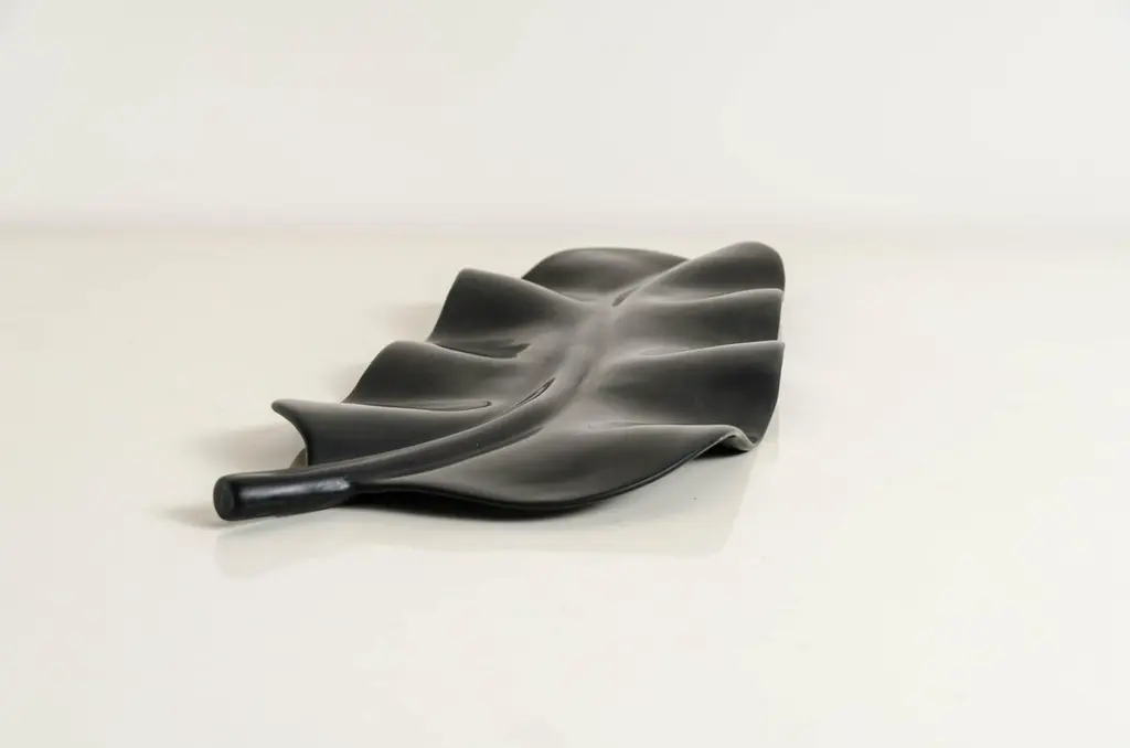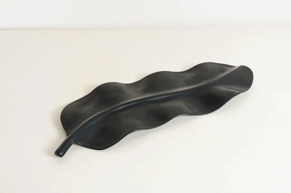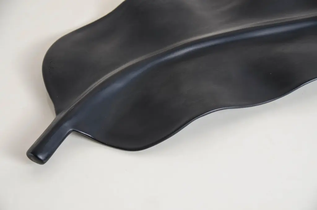 Banana Leaf Sculpture/ TrayBlack LacquerHand RepousséLimited EditionEach piece is individually crafted and is unique. Lacquer is a technique that dates back to the Shang dynasty, circa 1600-1100 B.C. These pieces are made with at least 60 coats of organic lacquer. Each layer of lacquer is applied with a curing period of 24 hours in between so that it can dry.