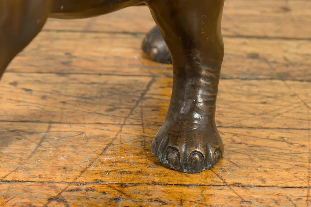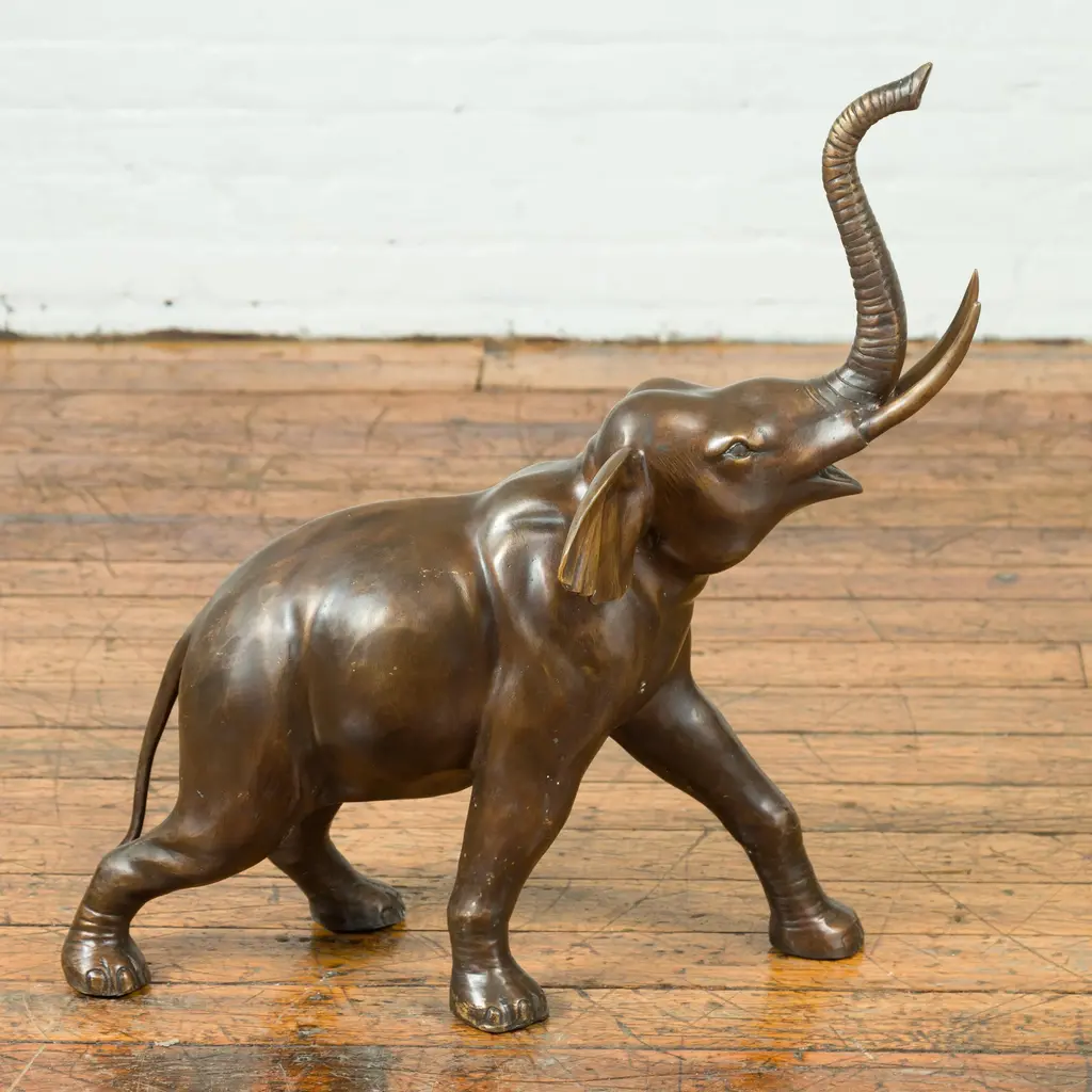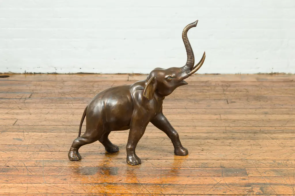 A contemporary bronze sculpture of a walking elephant with his trunk up. We have a pair available, with the elephants respectively facing left and right. Created with the traditional technique of the lost-wax (à la cire perdue) that allows a great precision and finesse in the details, this bronze sculpture charms is with its exquisite depiction of a trumpeting elephant. Represented walking, we feel like we can hear the sound coming out of its upward trunk. Placed anywhere in a garden, as a single or as a pair, this cast bronze elephant sculpture will bring a charismatic presence to any decor!
