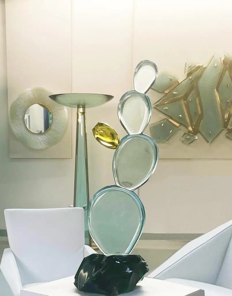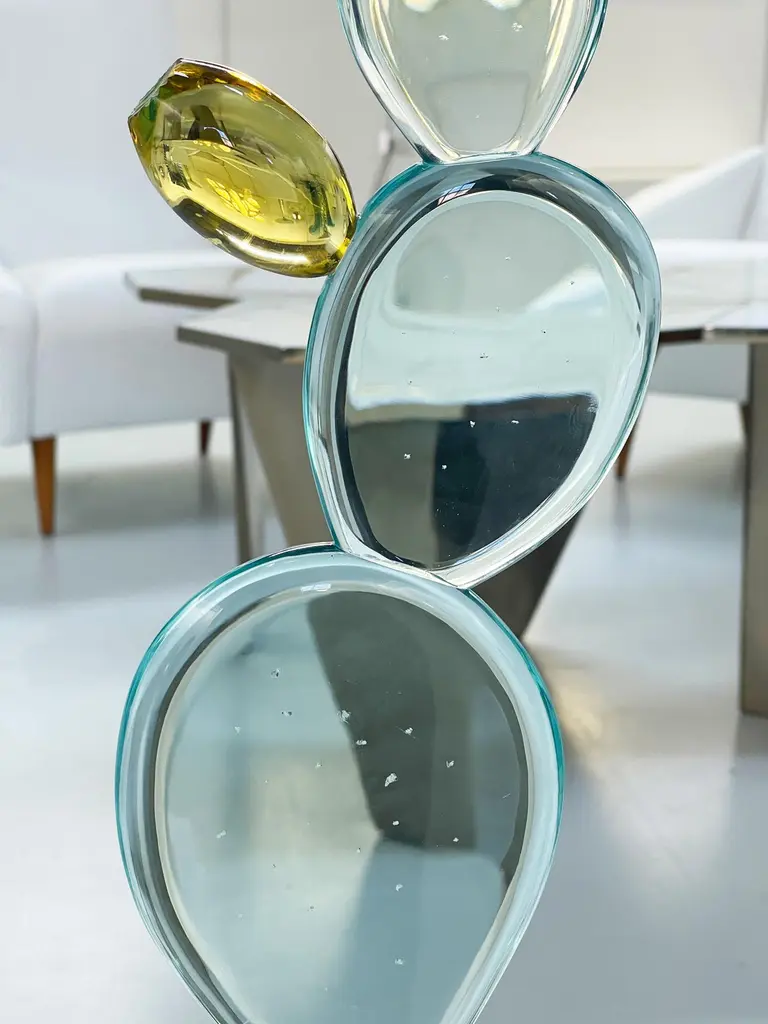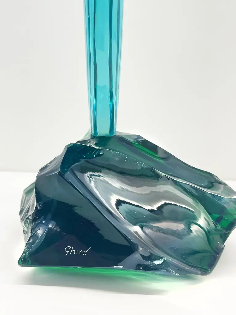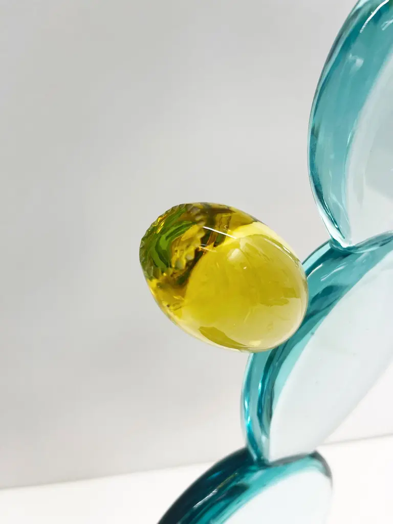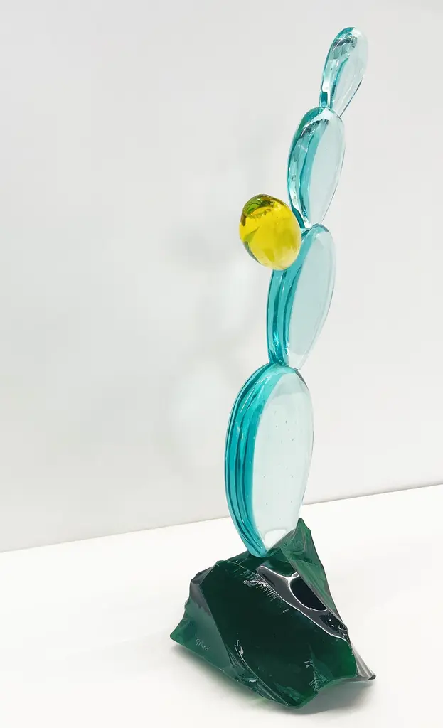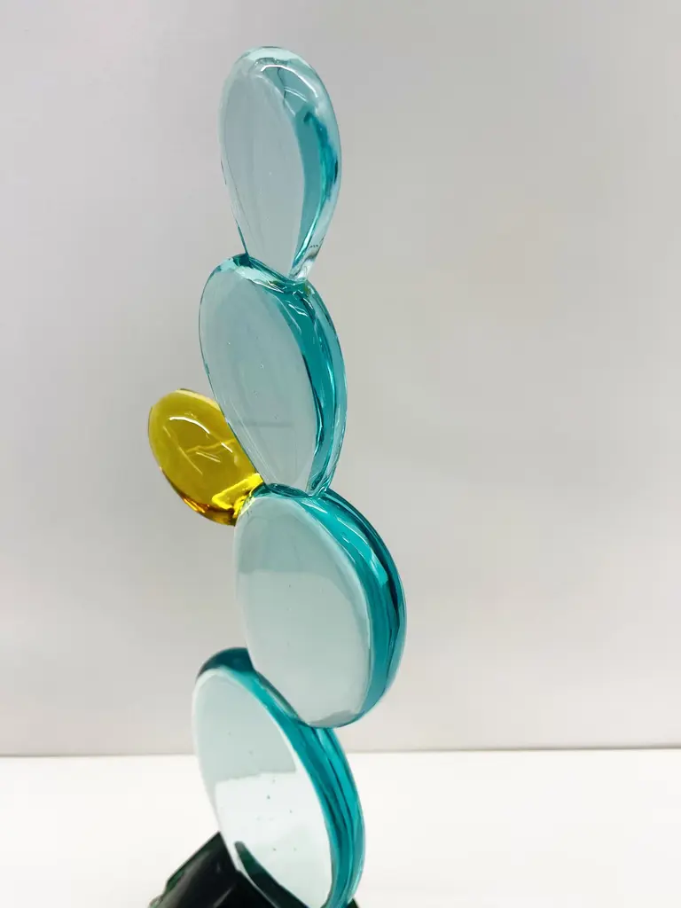 2021 Collection of handmade sculpture by Ghirò Studio.'Cactus with flower' sculpture was made by hand working the crystal with extreme care and attention.Each sculpture is unique and unrepeatable in fact it's impossible to create two perfectly identical.The crystal of the cactus is of high transparency aquamarine color, while the flower is made with amber yellow crystal. The leaves have been smoothed and have dots typical of this plant.The base of the sculpture is made up of a rough block of intense green natural crystal which gives a more naturalistic effect to this cactus.It's a decorative object that enhances any environment but it's also makes for special, refined and original gift!This object is new and in excellent condition.Every imperfection is to be considered a value and not a defect, a guarantee of the extreme naturalness and craftsmanship of our product.These items are handmade and will not be all exactly the same.