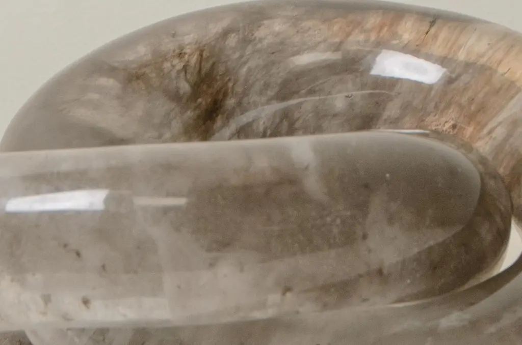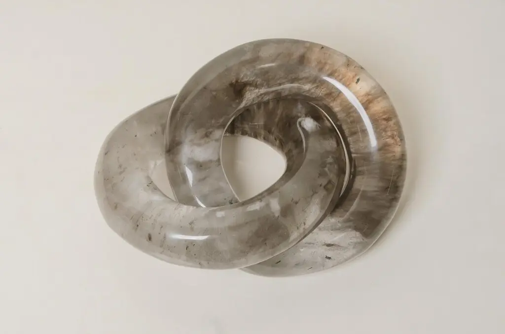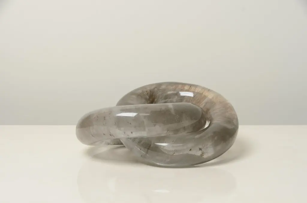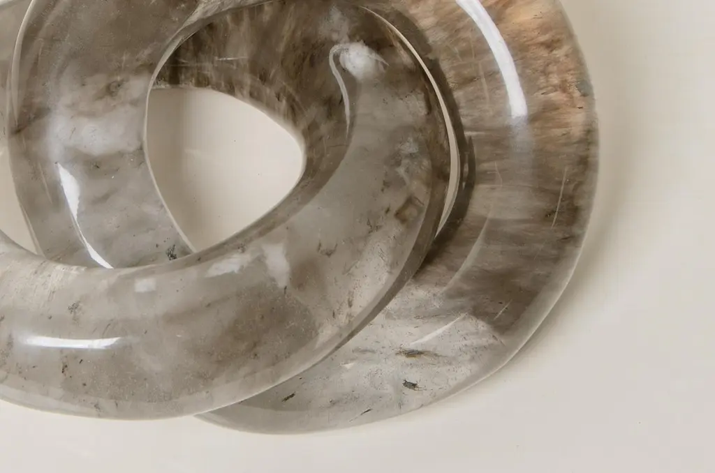 Double Ring Link SculptureSmoke CrystalHand CarvedLimited EditionCrystal Inclusions varyCarved using jade carving techniques. Each piece is individually crafted and is unique.