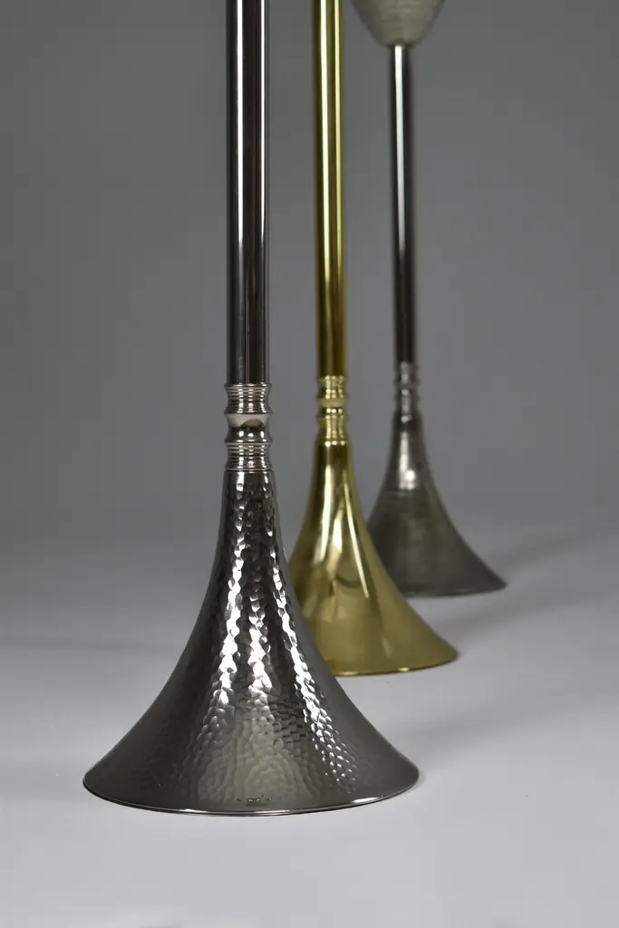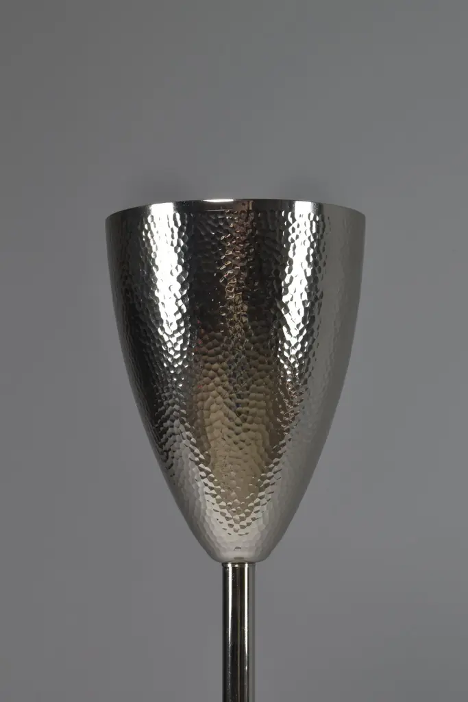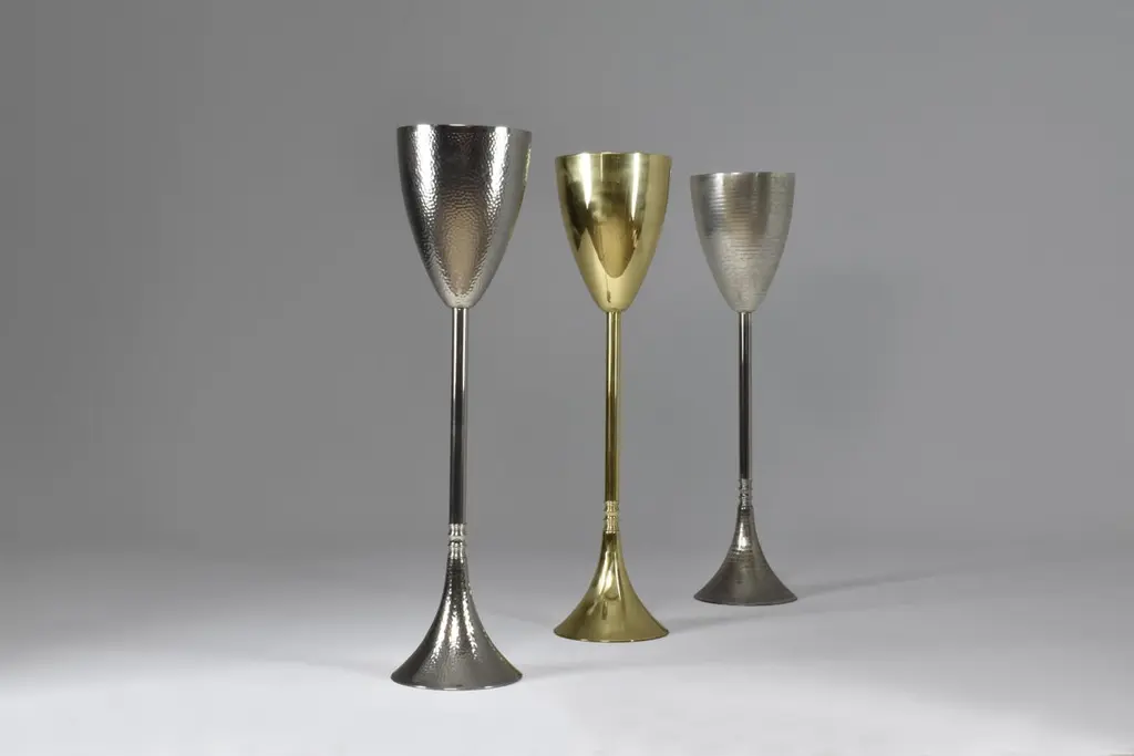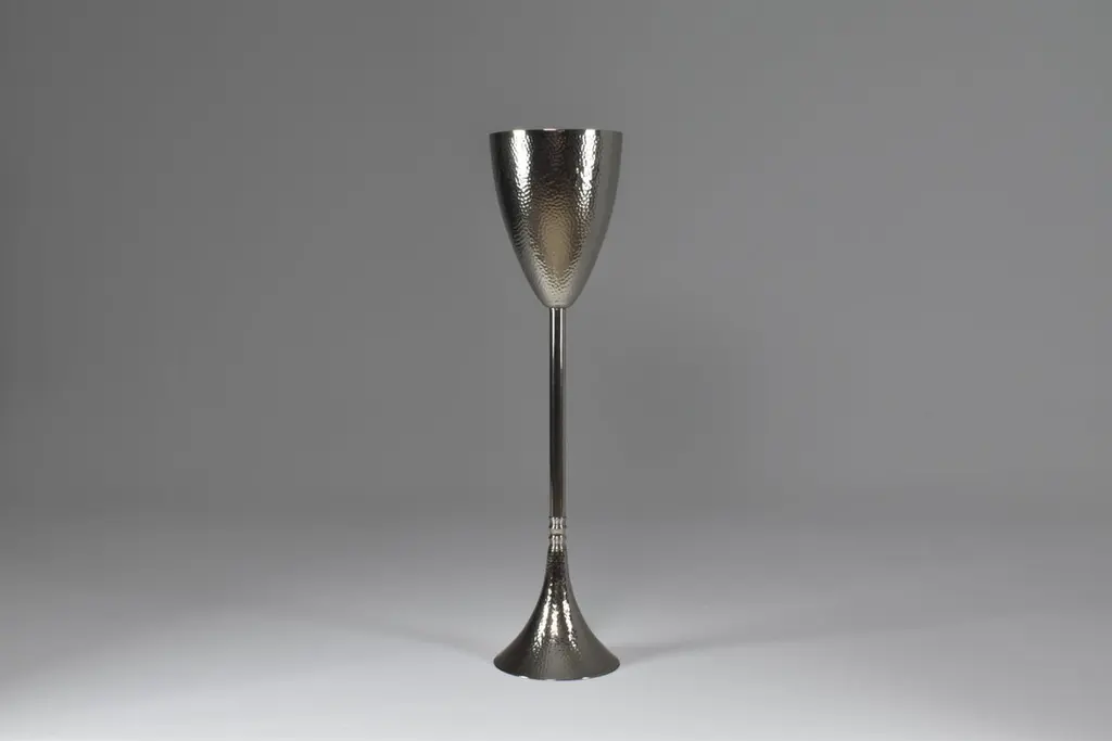 Contemporary made-to-measure handcrafted nickel-plated brass champagne or wine bucket stand with skillfully sculpted and handmade hammered details.Designed by Jonathan Amar, handcrafted at his atelier in Rabat. A standout accessory for high-end events, exclusive gatherings, esteemed restaurants, luxury hotels, and upscale dining venues, for individuals who appreciate hosting guests in style, exclusive lounges and bars or as a luxury gift. This champagne bucket stand is meticulously handmade, reflecting the skilled craftsmanship of artisans. As brass is a natural material, slight variations in finish, texture, or color may occur, adding to the unique character and charm of each individual piece. Embracing these subtle differences contributes to the authenticity of this handcrafted item.We are an exhibition space and an online destination established by the passionate art director behind Jonathan Amar Studio. Our gallery presents a harmonious mix of iconic and engaging 20th century pieces and bespoke contemporary lighting. With a strong focus on Italian mid-century designs, his success strives from sourcing designs with striking shapes, creative techniques and interesting materials that cross the concept of time in the same way a Spirit does. Our 350 square meter workspace includes a luminous gallery, a restoration atelier where our expert artisans in metalwork, woodwork, upholstery, and electrics; restore each piece with the mission to honor a balance between restoration and preservation. There may be light age-related wear but no hard damages or structural issues. Since the launch of our gallery in late 2017, we have exported over 1100 items to buyers in 21 countries located in all four corners of the world from Europe and North America to Asia and Australia. In the United-States alone, we have ensured the delivery of over 150 pieces of all sizes (from massive dining tables to small decorative objects) in 23 states.We take the utmost attention to our packaging by building robust made to measure boxes in our atelier with the aim of providing safe and cost-effective delivery prices for every client. Most deliveries arrive smoothly in less than 8 days. We are located both in Paris and Rabat. FYI the Morocco Free Trade Agreement (MAFTA) went into effect on January 1, 2006. Under the agreement, most Moroccan goods enter the United States duty-free. Contact us for more information