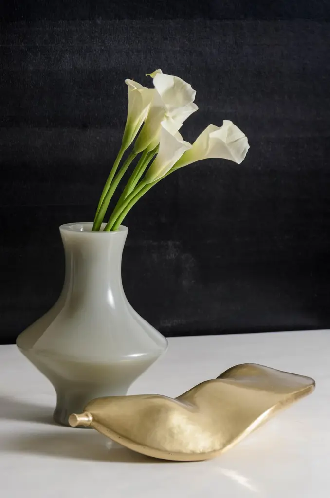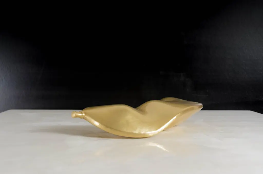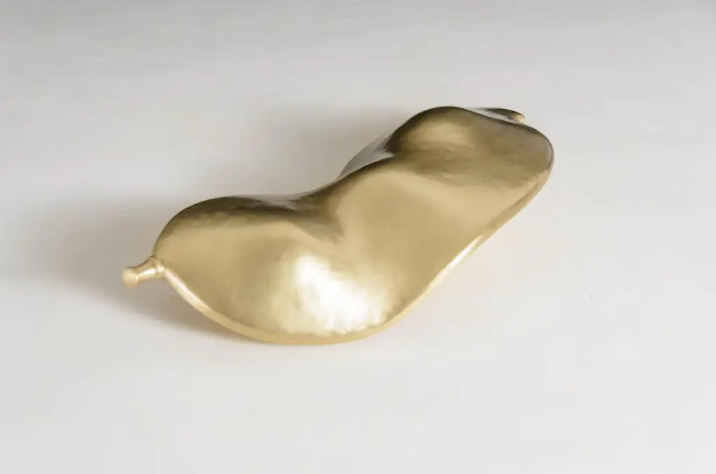 Lima bean sculptureBrassHand RepousséLimited editionRepoussé is the traditional art of hand-hammering decorative relief onto sheet metal. The technique originated around 800 BC between Asia and Europe and in Chinese historical context, it began early as the Han Dynasty (206BC-AD220). The technique involves using a hammer and various shaping tools.