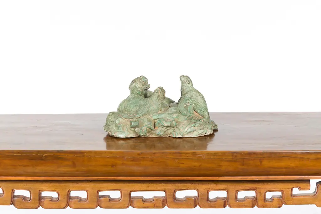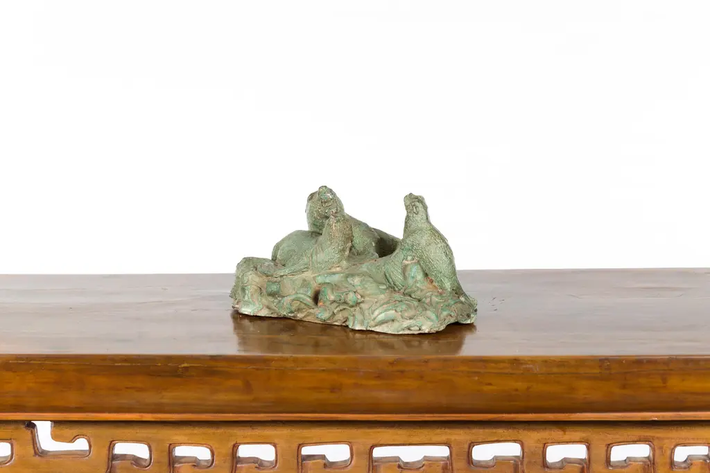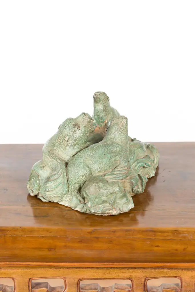 A contemporary lost wax cast bronze sea lion group sculpture with verde patina. We have several available, priced and sold $450 each. Created with the traditional technique of the lost-wax (à la cire perdue) which allows for great precision and finesse in the details, this bronze sculpture depicts a group of three sea lions reclining on a rocky ground. Very lively, particularly in the expression of the seal on the left, we can almost hear their vocal exchange. Boasting a verde patina, this contemporary bronze sea lion sculpture will be a lovely addition to any shelf or table top.