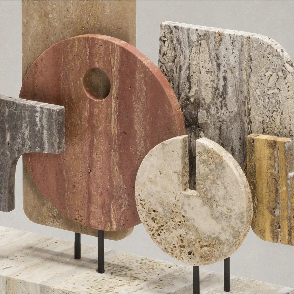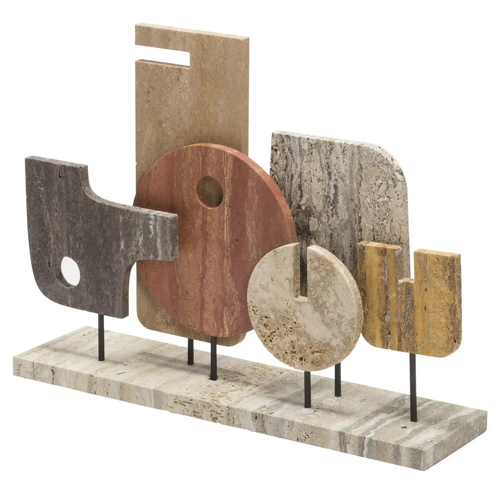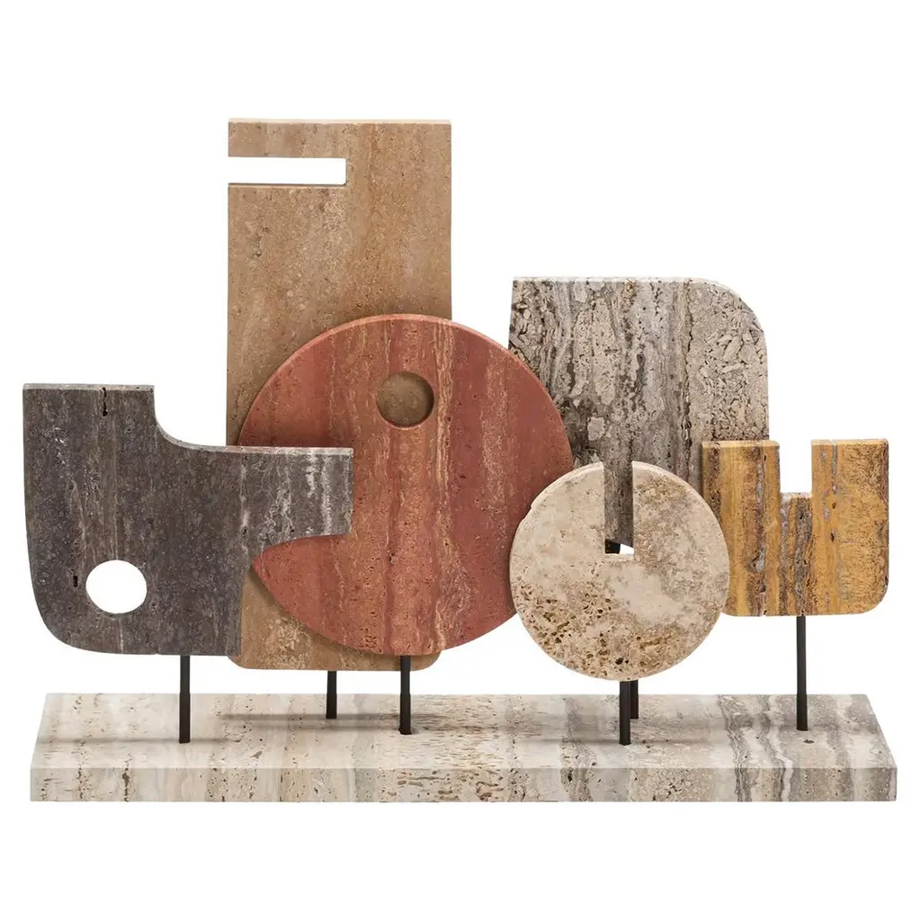 Contemporary marble sculpture - Tabou 5 by Stephane Parmentier for Giobagnara.Providing any room of a contemporary or minimalist interior with a balanced and plush presence, this floor sculpture is part of an exclusive series by Giobagnara, inspired by atomic-age design and tribal art. Resting on six bronze stems rising from a marble base, it comprises six different types of Travertine marble shaped in abstract and extremely original silhouettes that merge creating a one-of-a-kind visually striking composition.Design: Stéphane ParmentierMaterial: Marble, BronzeDimensions (in): W 28.35 x D 7.09 x H 21.26Dimensions (cm): W 72 x D 18 x H 54Made by hand, in Italy.This item is made to order.