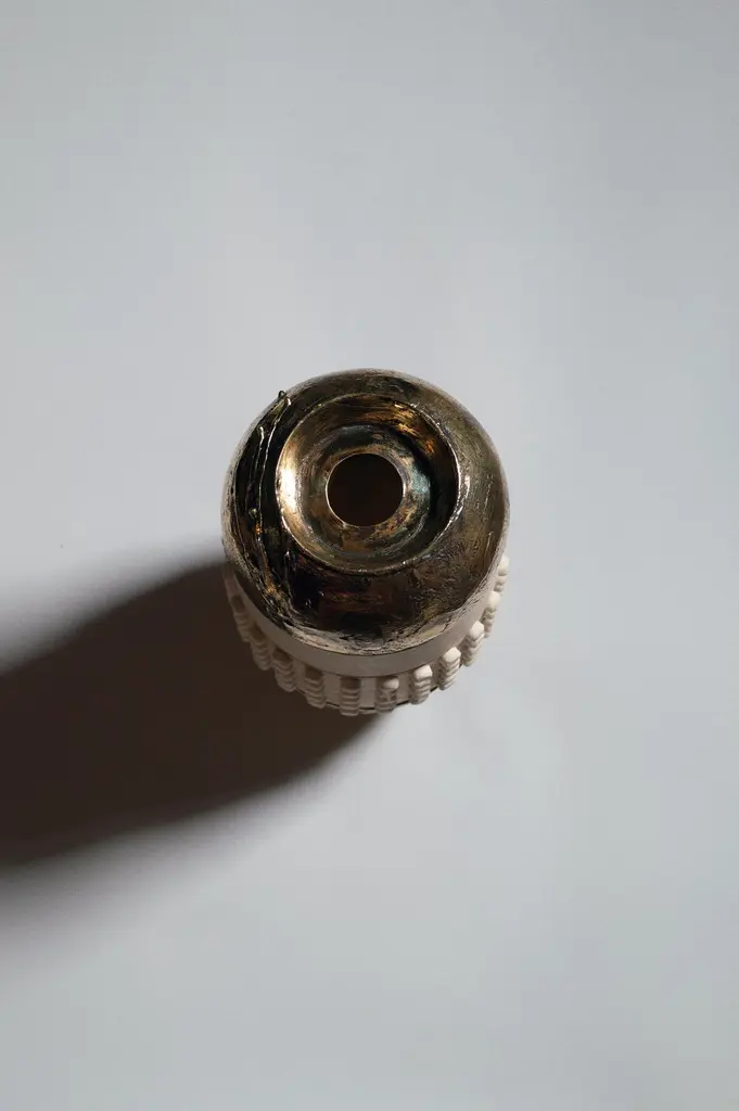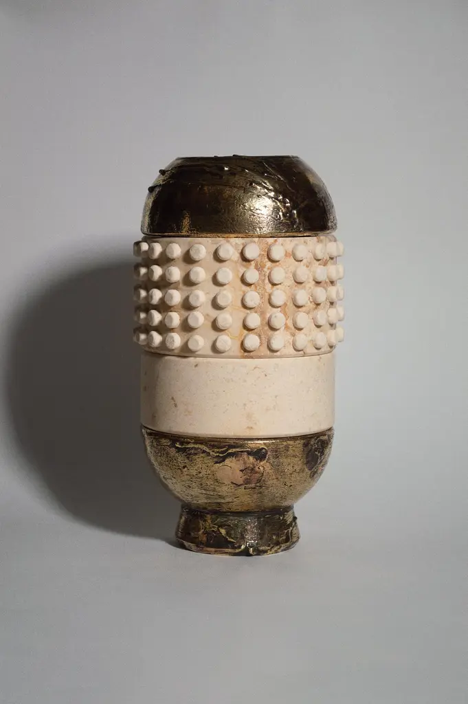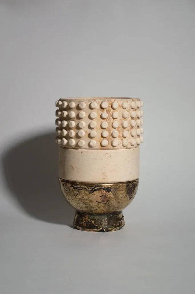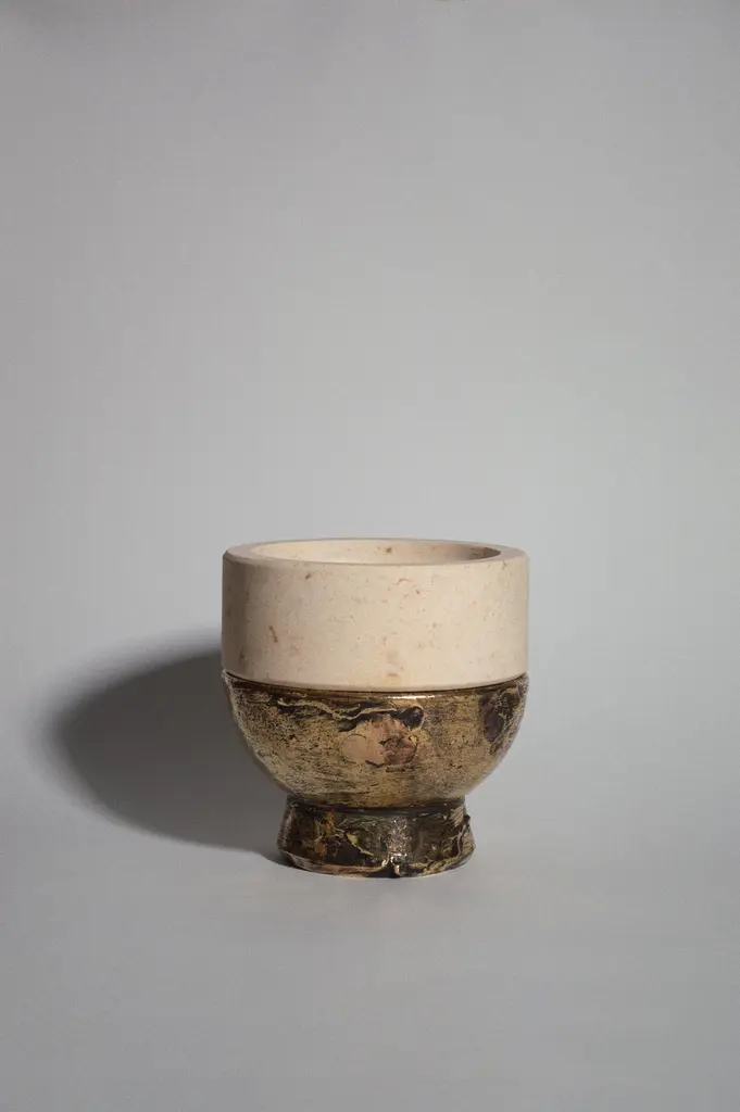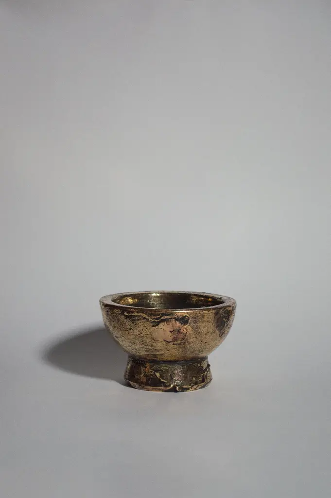 Kernos (plural kernoi), a very peculiar form of compound vessel or, simply put, «a plurality of bowls,» that was utilized for ceremonial purposes from as early as the Neolithic period. It may have been part of the rites and offerings to goddesses like Demeter, Kore, and Attis; but there are those who believe it was nothing more than table dishes.The two crema maya vessels, and the two bronze sculptures that form Kernos para Antonio are no less ambiguous: it may or may not be or have been a censer, a ceremonial cup, a container of domestic use, a vase for a family heirloom, or none of the above.
