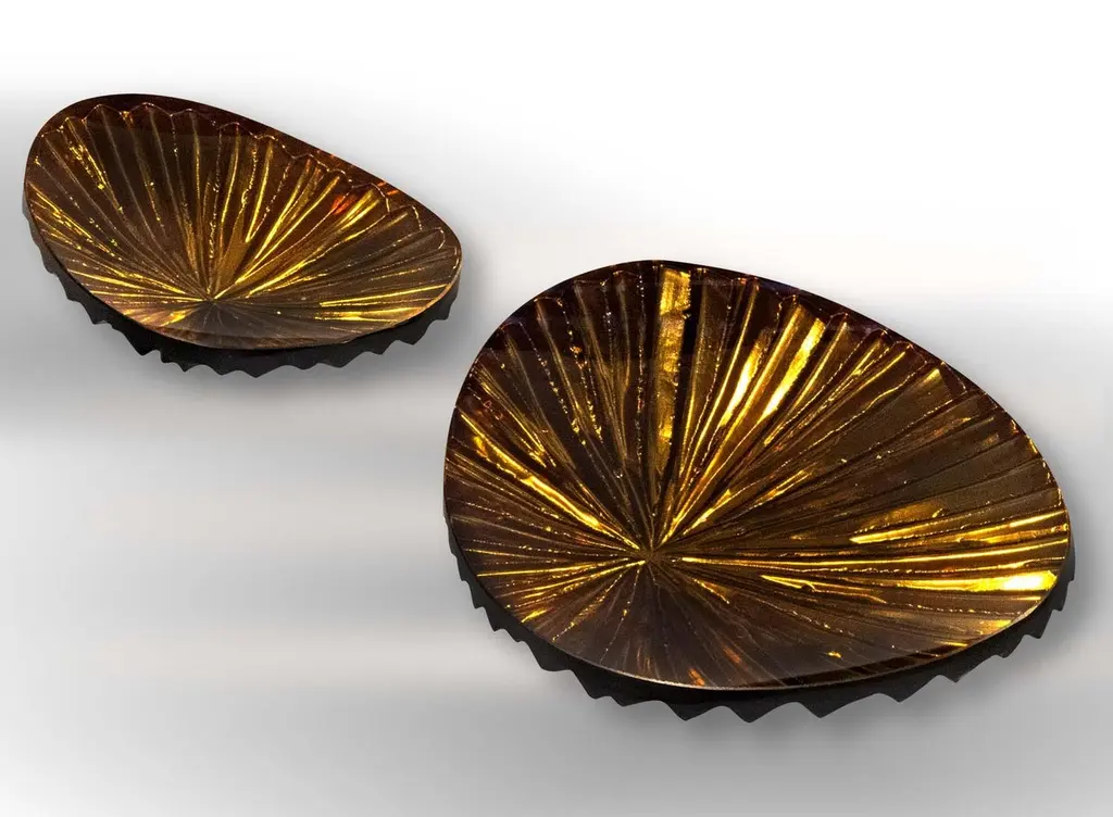 Each bowl have contemporary design ideal for giving an unmistakable style to any environment. The rounded triangle shape gives sobriety and elegance while the warm intense amber color embellished with golden reflections makes them even more refined. Each element is a true sculpture as it has been curved, cut and sculpted by hand. The processing is visible at the bottom where the various engravings are present.This bowl is newis new and in excellent condition.Every imperfection is to be considered a value and not a defect, a guarantee of the extreme naturalness and craftsmanship of our product.These items are handmade and will not be all exactly the same.