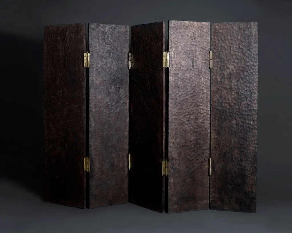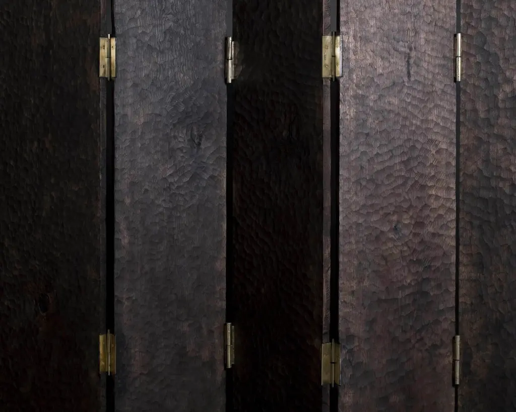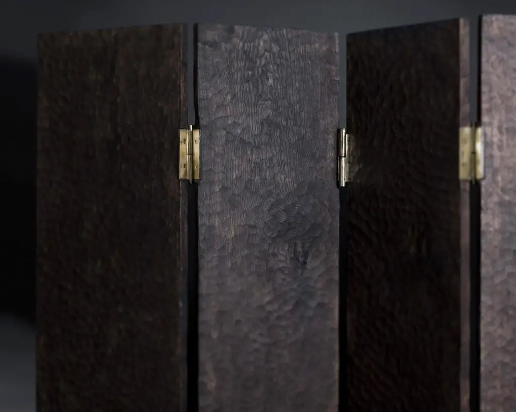 Screen made of solid oak (+ linseed oil)Measures: 150 x 190 x 3 cmSÓHA design studio conceives and produces furniture design and decorative objects in solid oak in an authentic style. Inspiration to create all these items comes from the Russian North aesthetics with its severe nature, log huts black from time and climate and scant patterns. Wood is masterfully hand processed with chainsaw or chisel, whereby producing beautiful surface patterns. The wood is soaked in boiling baths of linseed oil, creating this special patina and making each creation a very unique piece. Reacting with tanning substances under high temperature, oil gives the objects expressive and natural colours, from light brown to charcoal-black. SÓHA offers a vast array of neo-primitivist interior objects. Our kitchen utensil, wall panels, sculptures and furniture solutions are executed in one unique style and will organically fit into the interior of your home. Each piece is one-of-a-kind handmade product.
