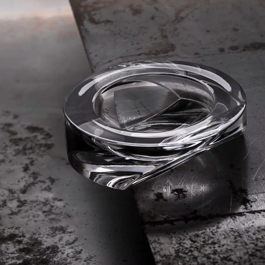 Timeless and refined, this ashtray was designed by Enzo Mari in 1999 and is part of the Conversazione Collection. This superb object of functional decor is first and foremost a sculpture, whose symmetrical volumes are enhanced by the reflexes that the transparent crystal produces with the surrounding light. Its contained size allows it to be displayed anywhere in the house.
