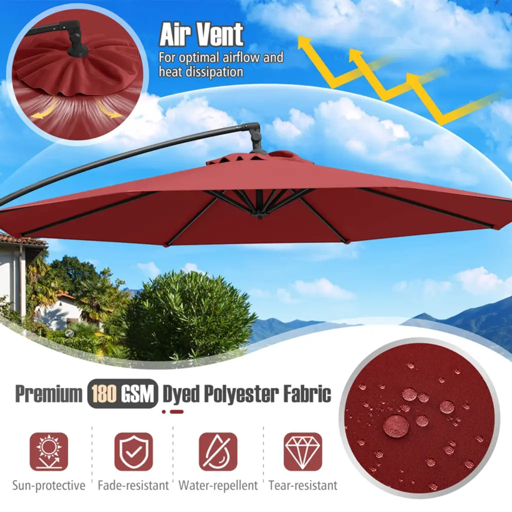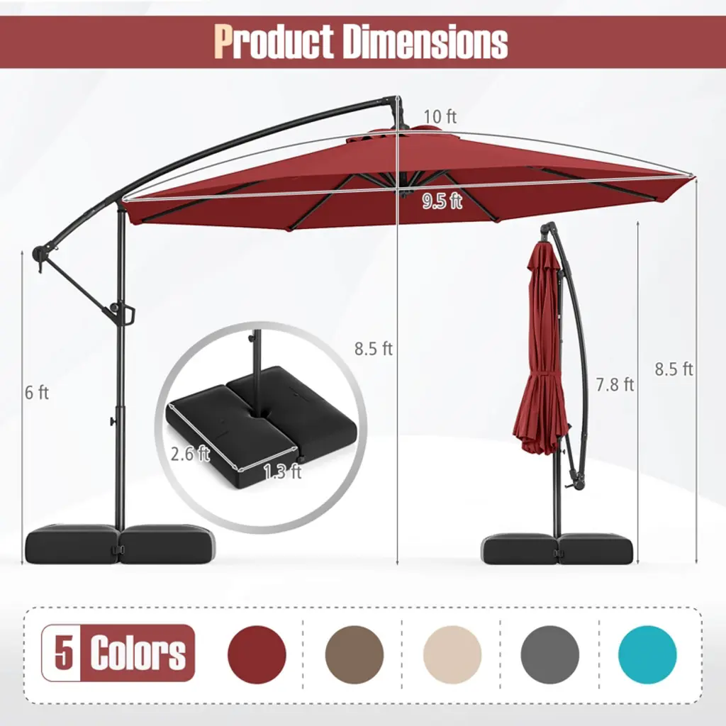Create a Comfortable and Shaded Oasis in Your Outdoor Space and Enjoy the Outdoors in Style! Our 10 ft offset hanging umbrella with a base is a perfect shading solution for your patios, gardens, poolside areas, outdoor events, or even commercial areas, offering a generous shade coverage for various outdoor activities. Thanks to the umbrella’s seamless ability to tilt and rotate 360°, customize your shade is a breeze, while the locking mechanism allows for easy operation. Built with a focus on stability and safety, it is equipped with an additional fixing strap, robust connectors, self-locking hinges, and 8 heavy-duty metal ribs, ensuring a secure and wobble-free structure. Moreover, crafted from 180 GSM dyed polyester canopy with a vented top, this hanging umbrella not only offers superior protection from outdoor elements but also enhances airflow for utmost relaxation. When not in use, we recommend closing the umbrella through a hassle-free crank handle, so as to extend its lifespan.FeaturesIncludes a base, comes with 2 sandbags that could withstand a weight of 220 lbs The infinite tilt and 360° rotation allow you to block the sun from different directions Easy to tilt, loosen the locking mechanism and then move the handle up and down How to rotate, loosen the locking mechanism, rotate the canopy, and then lock Equipped with an additional fixing strap, enhance overall wind resistance The top connector adopts a self-locking hinge, prevent the canopy from swaying The top connector is fully enclosed, prevent water seepage and internal rusting Equipped with protective rib pockets, prevent the canopy from tearing The canopy is sun-protective, fade-resistant, water-repellent, tear-resistant Supported by 8 robust metal ribs, ensure excellent stability and wind resistance Adopts a crank handle with silent operation, easy and effortless to open or close the umbrellaColor: Brown/Turquoise/Beige/Gray/Red Material: Dyed Polyester Fabric, Metal Product Dimensions: 10 x 8.5 ft (Dia. x H) Ground Clearance: 6.4 ft Folding Size: 2.6 x 2.6 x 7.8 ft (L x W x H) Net Weight: 28.5 lbs Package Includes: 1 x Patio Offset Umbrella 1 x User’s Manual