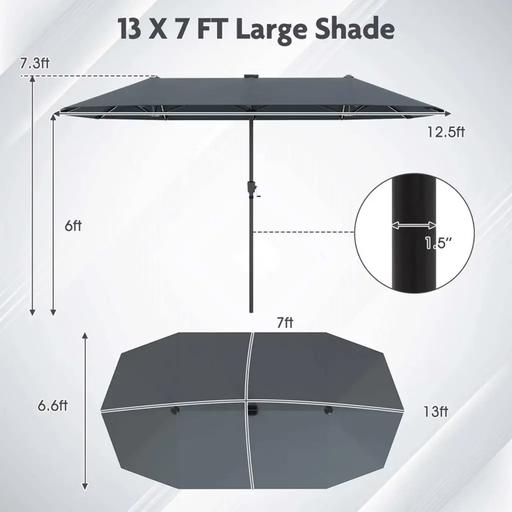 Transform Your Outdoor Space into a Cozy and Illuminated Retract! This 13 x 7 ft double-sided patio umbrella provides an extra large shading coverage, ideal for a variety of settings, from a lively backyard barbecue to tranquil poolside lounging. Not only offering unparalleled shade, it could also create a charming ambiance for your evenings with the built-in LED lights, which are powered by a solar panel, providing warm and inviting illumination for 6-8 hours. Crafted with a premium polyester canopy and supported by 5+2+5 sturdy metal umbrella ribs, the umbrella offers not only effective sun protection but also reliable use season after season. Furthermore, it features a convenient 2-section design and a hassle-free crank handle, allowing for effortless assembly and storage. Whether day or night, our solar-light patio umbrella is designed to create the perfect outdoor sanctuary where you can relax, entertain, and enjoy the outdoor moments of life. Note: we recommend turning off the power during the day to for better charging.FeaturesThe 13 ft patio umbrella features a double-sided design for larger shade coverage Crafted of 180 GSM polyester fabric, fade-resistant, water-repellent, and reliable Equipped with 108 LED lights, emit a cozy yellow lighting, enhance night ambiance The LED lights are controlled by a handy switch on the pole, easy to operate The lights are powered by a solar panel, provide 6-8 H illumination after a full charge The top solar panel efficiently converts sunlight into electricity, save energy The crank handle makes it easy and effortless to open or close the umbrella The umbrella can be effortlessly detached into 2 sections for space-saving storage Equipped with protective rib pockets, prevent the canopy from tearing Constructed from powder-coated metal tubes, provide strong and reliable support Supported by 12 robust metal ribs, ensure excellent stability and wind resistance Require assemblyColor: Beige/Brown/Gray/Navy/Orange/Wine Material: Polyester Fabric, Metal Product Dimensions: 13 x 7 x 7.3 ft (L x W x H) Ground Clearance: 6 ft Net Weight: 22.5 lbs Package Includes: 1 x Double-Sided Patio Umbrella 1 x User’s Manual