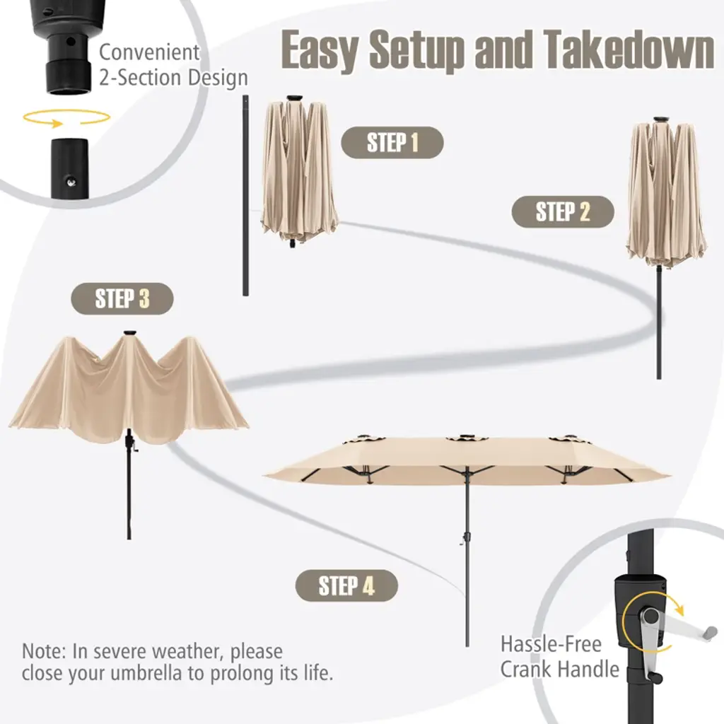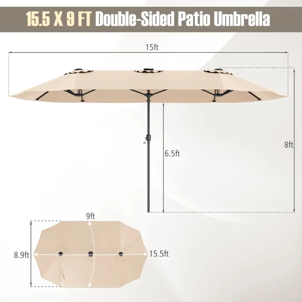 Transform Your Outdoor Space into a Cozy and Illuminated Retract! This 15.5 x 9 ft double-sided patio umbrella provides an extra large shading coverage, ideal for a variety of settings, from a lively backyard barbecue to tranquil poolside lounging. Not only offering unparalleled shade, it could also create a charming ambiance for your evenings with the built-in LED lights, which are powered by a solar panel, providing warm and inviting illumination for 6-8 hours. Crafted with a premium polyester canopy and supported by 5+2+5 sturdy metal umbrella ribs, the umbrella offers not only effective sun protection but also reliable use season after season. And there is an air vent on the top that further enhances overall stability while promoting ventilation. Furthermore, it adopts a convenient 2-section design and a hassle-free crank handle, allowing for effortless assembly and storage. Whether day or night, our solar-light patio umbrella is designed to create the perfect outdoor sanctuary where you can relax, entertain, and enjoy the outdoor moments of life. Note: we recommend turning off the power during the day for better charging. FeaturesThe 15.5 ft patio umbrella features a double-sided design for larger shade coverage Crafted of 180 GSM polyester fabric, fade-resistant, water-repellent, and reliable The top air vent helps maintain air circulation while reducing wind pressure Equipped with 144 LED lights, emit a cozy yellow lighting, enhance night ambiance The LED lights are controlled by a handy switch on the pole, easy to operate The lights are powered by a solar panel, provide 6-8 H illumination after a full charge The top solar panel efficiently converts sunlight into electricity, save energy The crank handle makes it easy and effortless to open or close the umbrella The umbrella can be effortlessly detached into 2 sections for space-saving storage Equipped with protective rib pockets, prevent the canopy from tearing Supported by 12 robust metal ribs, ensure excellent stability and wind resistance Require assemblyColor:Beige/Orange/Brown/Gray/Navy/Red Material: Polyester Fabric, Metal Product Dimensions: 15.5 x 9 x 8 ft (L x W x H) Ground Clearance: 6.5 ft Net Weight: 30 lbs Package Includes: 1 x Double-Sided Patio Umbrella 1 x User’s Manual