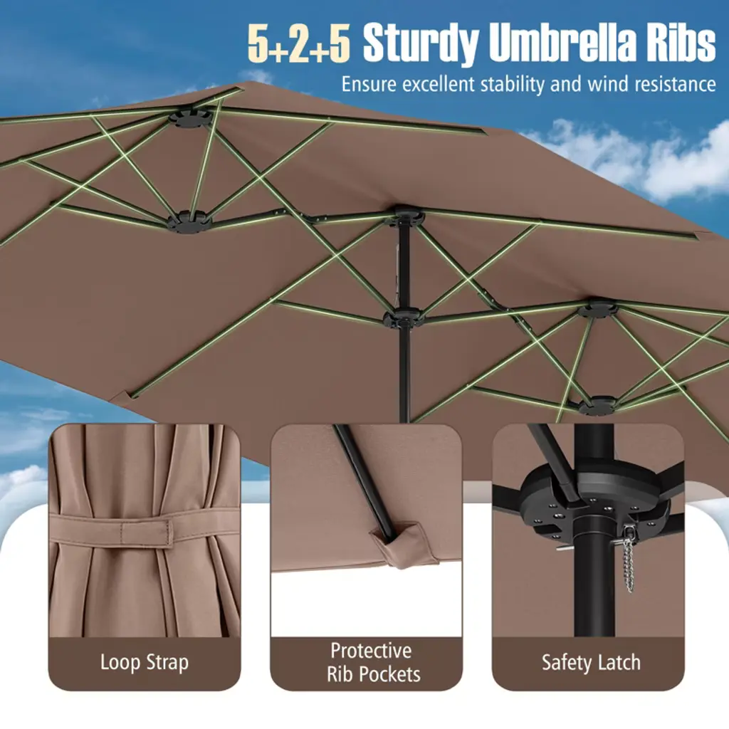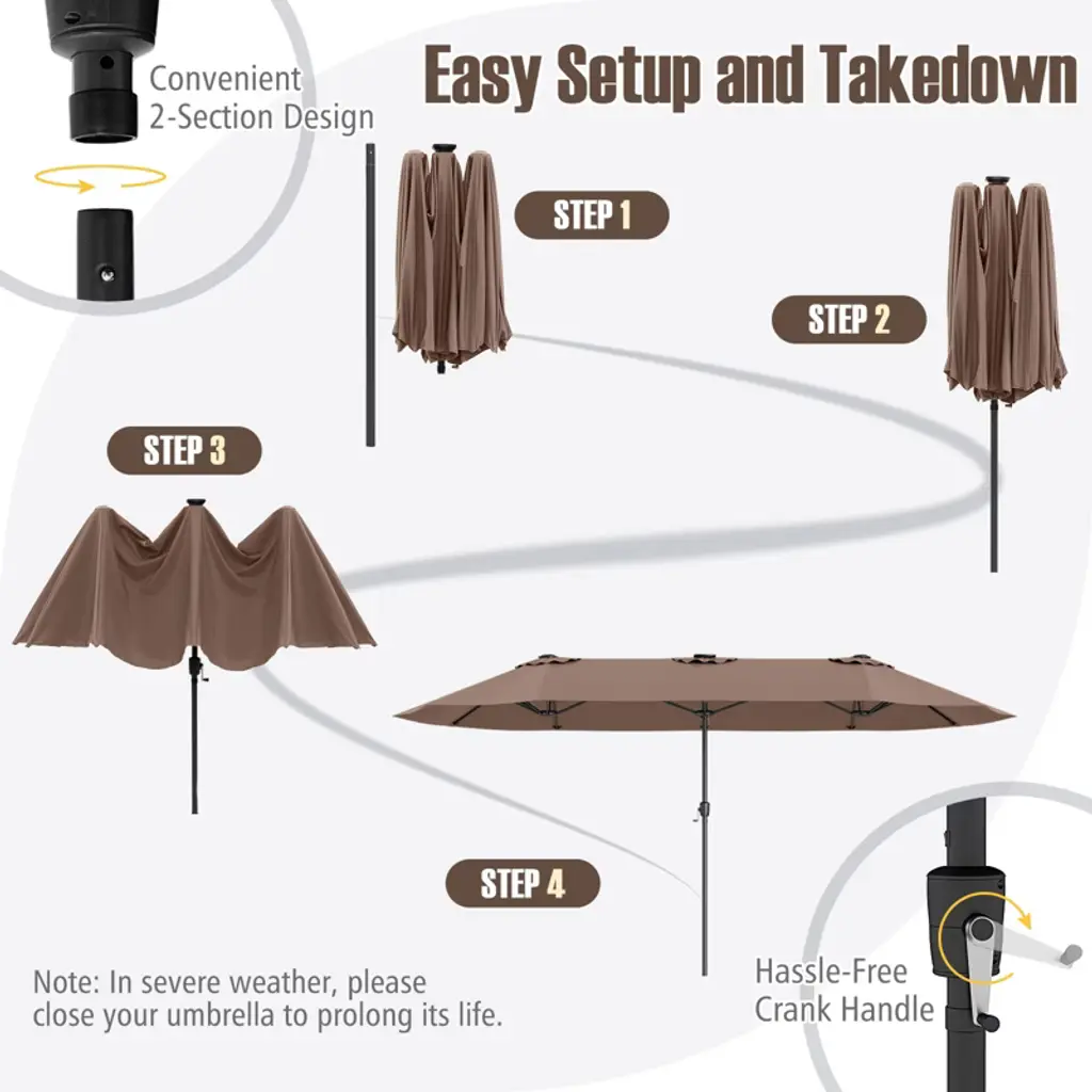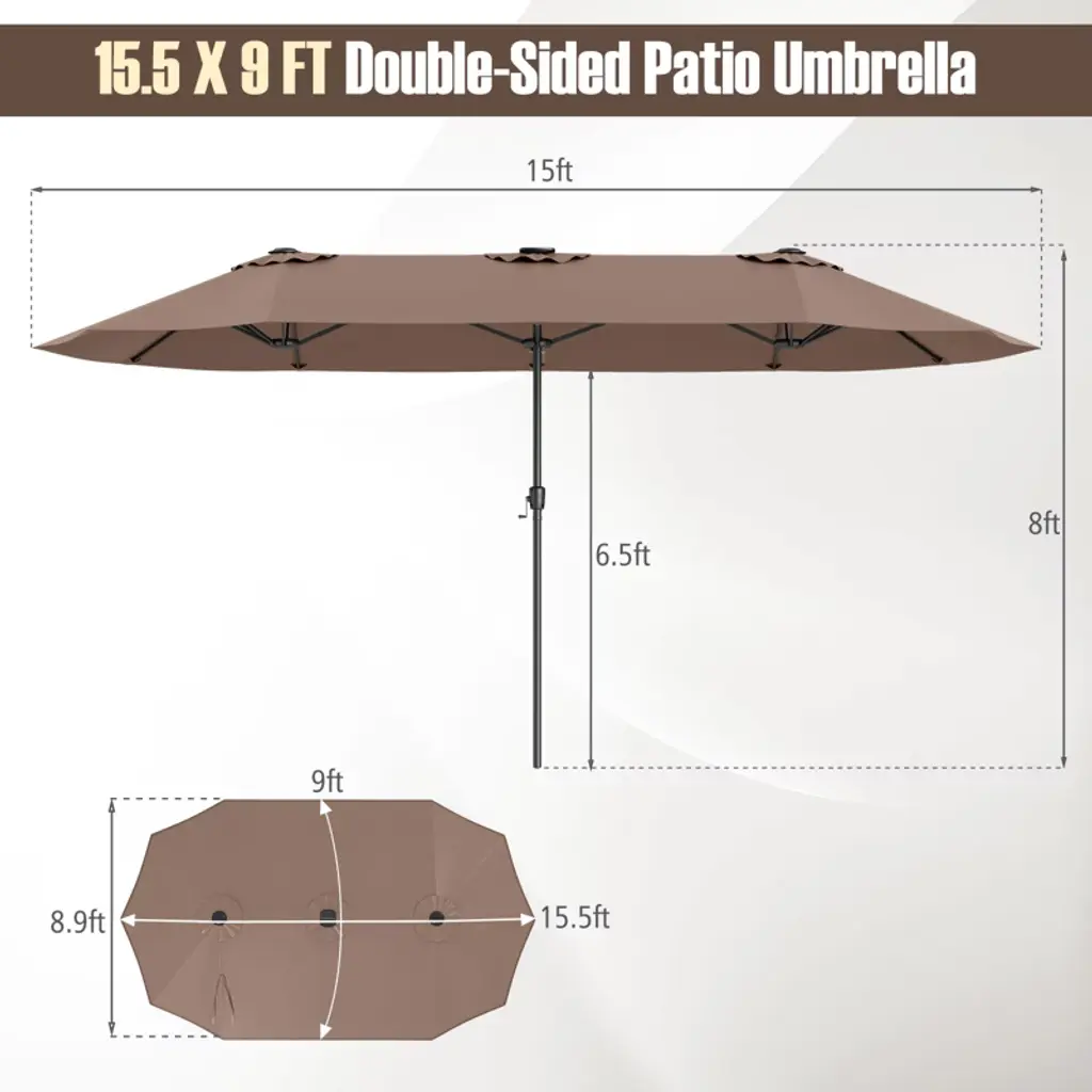 Transform Your Outdoor Space into a Cozy and Illuminated Retract! This 15.5 x 9 ft double-sided patio umbrella provides an extra large shading coverage, ideal for a variety of settings, from a lively backyard barbecue to tranquil poolside lounging. Not only offering unparalleled shade, it could also create a charming ambiance for your evenings with the built-in LED lights, which are powered by a solar panel, providing warm and inviting illumination for 6-8 hours. Crafted with a premium polyester canopy and supported by 5+2+5 sturdy metal umbrella ribs, the umbrella offers not only effective sun protection but also reliable use season after season. And there is an air vent on the top that further enhances overall stability while promoting ventilation. Furthermore, it adopts a convenient 2-section design and a hassle-free crank handle, allowing for effortless assembly and storage. Whether day or night, our solar-light patio umbrella is designed to create the perfect outdoor sanctuary where you can relax, entertain, and enjoy the outdoor moments of life. Note: we recommend turning off the power during the day for better charging. FeaturesThe 15.5 ft patio umbrella features a double-sided design for larger shade coverage Crafted of 180 GSM polyester fabric, fade-resistant, water-repellent, and reliable The top air vent helps maintain air circulation while reducing wind pressure Equipped with 144 LED lights, emit a cozy yellow lighting, enhance night ambiance The LED lights are controlled by a handy switch on the pole, easy to operate The lights are powered by a solar panel, provide 6-8 H illumination after a full charge The top solar panel efficiently converts sunlight into electricity, save energy The crank handle makes it easy and effortless to open or close the umbrella The umbrella can be effortlessly detached into 2 sections for space-saving storage Equipped with protective rib pockets, prevent the canopy from tearing Supported by 12 robust metal ribs, ensure excellent stability and wind resistance Require assemblyColor:Beige/Orange/Brown/Gray/Navy/Red Material: Polyester Fabric, Metal Product Dimensions: 15.5 x 9 x 8 ft (L x W x H) Ground Clearance: 6.5 ft Net Weight: 30 lbs Package Includes: 1 x Double-Sided Patio Umbrella 1 x User’s Manual