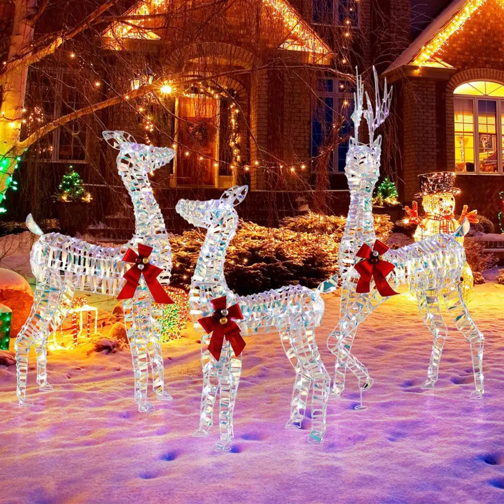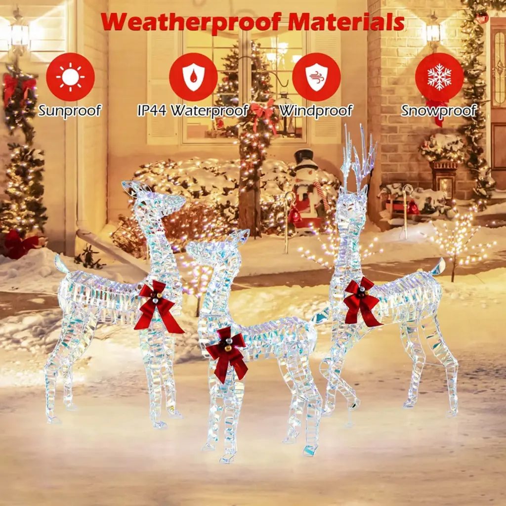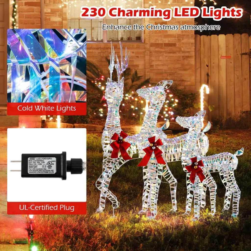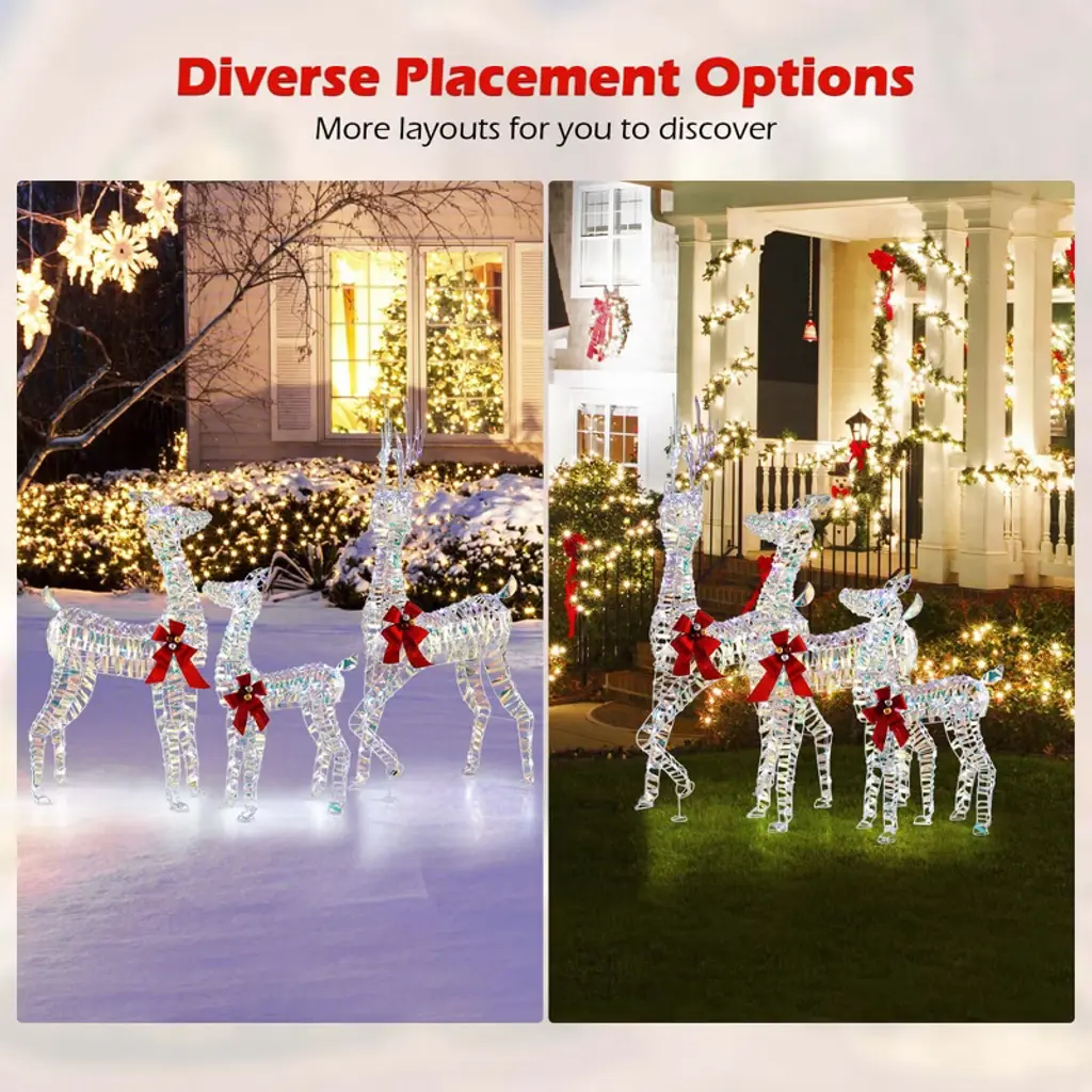 Spread joy and cheer with our 3-piece lighted reindeer family set! Featuring a spectacular 3D design and bright LED lights, this outdoor deer set is sure to be the centerpiece of your yard. Crafted from weather-resistant materials, these pre-lit reindeers are built to stand the test of time. The versatile display options of the buck, doe, and fawn allow for endless arrangements, perfect for any indoor or outdoor space. Setting up this elegant decoration is a breeze with the included zip ties and metal ground stakes. Additionally, the red bows that add a touch of sophistication to your Christmas decorations.Features230 cold white LED lights for better night viewing UL-certified plug ensure simple and secure lighting IP44 waterproof materials for long-lasting service Sturdy metal frame boasts exceptional stability Robust zip ties for firm attachment within parts Keep the deer firmly in place with metal ground stakes 5 ft buck, 4 ft doe and 3 ft fawn for diverse placement options Beautiful bows help enhance the Christmas atmosphere Great decoration for indoor displace, as well as lawn and gardenColor of LED Light: Cold White Materials: PVC, Metal Dimensions of Buck: 2.8 x 1 x 5 ft (L x W x H) Dimensions of Doe: 2.3 x 0.9 x 4 ft (L x W x H) Dimensions of Fawn: 2.4 x 0.9 x 3 ft(L x W x H) Net Weight: 12 lbs Number of LED Lights: 230 Package Includes: 1 x Buck 1 x Doe 1 x Fawn 12 x Ground Stakes 30 x Zip Ties 1 x Adapter 1 x Instruction