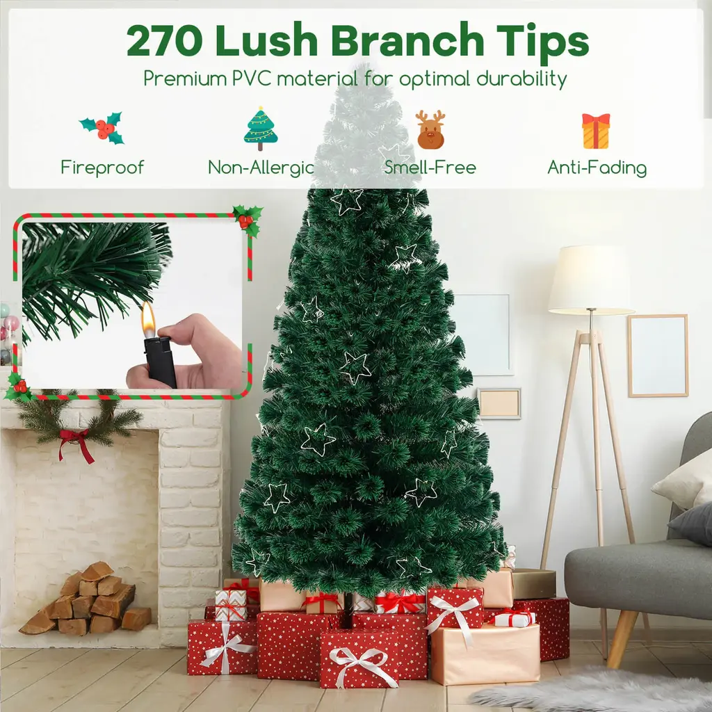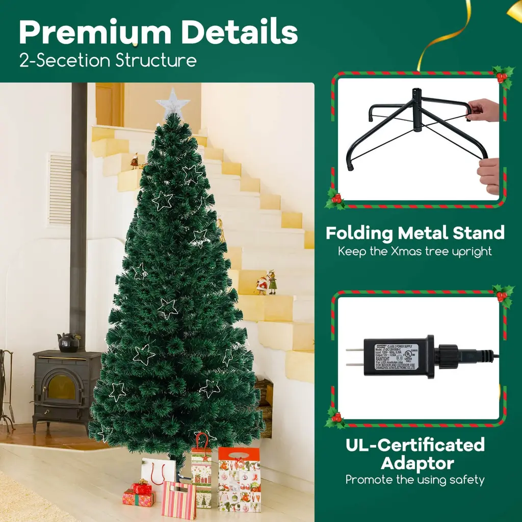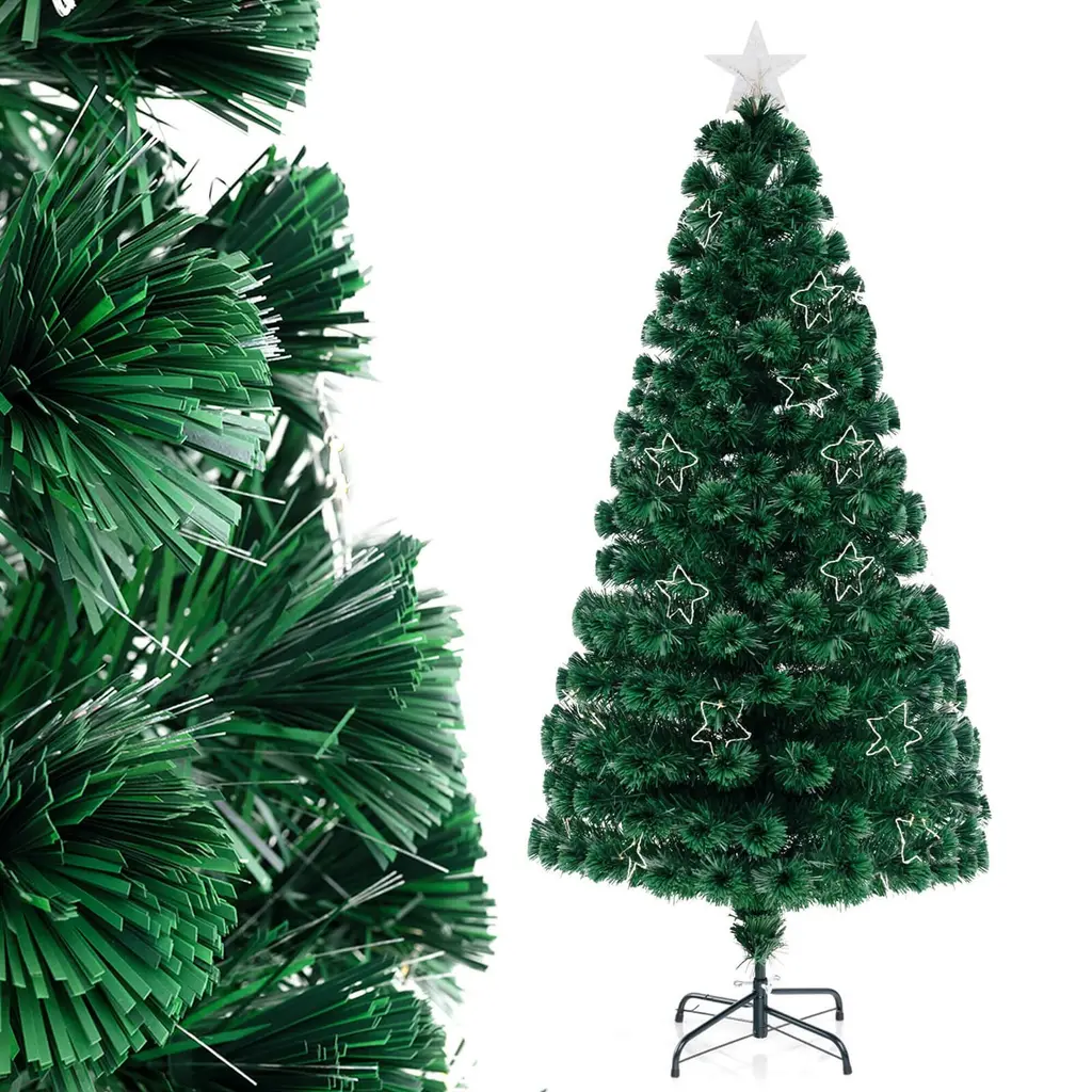 The 4/5/6/7 ft Xmas tree comes with 197/257/389/509 warm white LED lights and vibrant fiber optics, tailoring the tree for every festive function. Crafted from premium PVC, the 130/170/230/270 lush branches are fireproof, non-allergic, and fade-resistant. Customizable with adjustable star decorations, this Christmas tree offers a personalized touch to your holiday display. Complete with a sturdy metal stand and a safe UL-certified adaptor, this Xmas tree provides stability and security. This versatile tree can transform any area into a festive wonderland, whether in a cozy corner, bustling lobby, or commercial setting. Merry Christmas!Feature130/170/230/270 lush branch tips are made of premium PVC material for optimal durability Illumination elegance is ensured by the 197/257/389/509 LED lights and the top star LED light Adorned with 18 star decorations that allow for customized shapes Boasts colorful fiber optics, illuminating the season with a spectrum of wonder The UL-certificated adaptor is included to promote the using safety Comes with a folding metal stand to keep the Xmas tree upright Features a 1/2-section structure, simplifying storage when not in use Festive flexibility for decorations in your office, shop, school, carnival, etcSpecificationColor: Green Material: PVC, Metal Tree Height: 4/5/6/7 ft Tree Width: 2/2.5/3.5 ft Diameter of Stand: 12/14/16/18" Number of Branch Tips: 130/170/230/270 Number of LED Lights: 197/257/389/509 Number of Star Decorations: 18/24/36/48 Number of Sections: 1/2 Net Weight: 6/8.5/12.5/14.5 lbs Package Includes: 1 x Christmas Tree 1 x User Guide