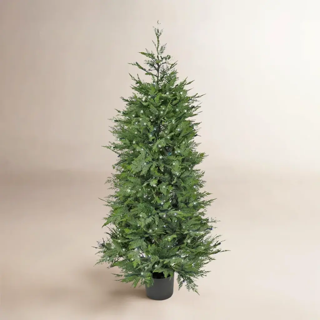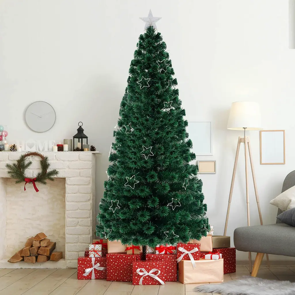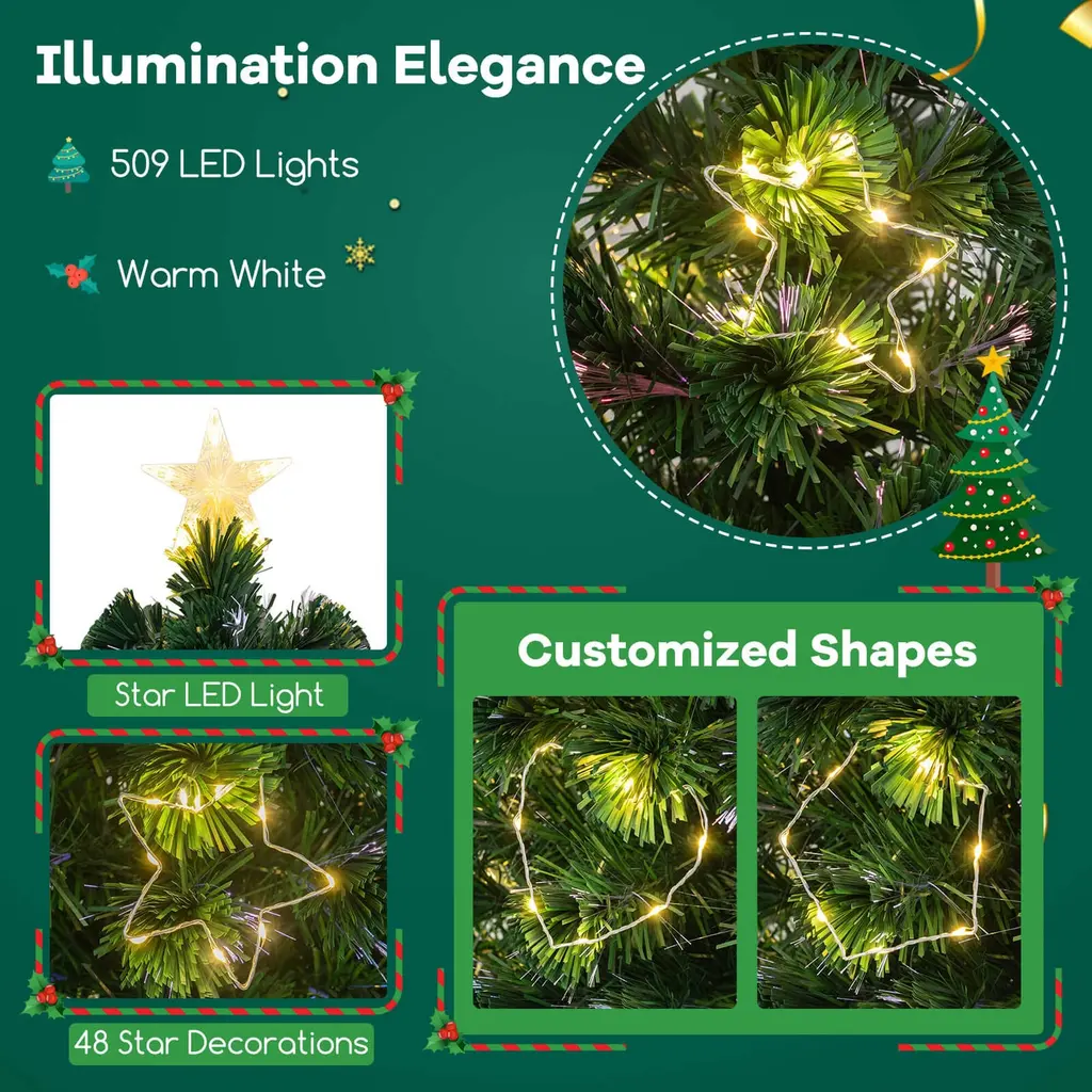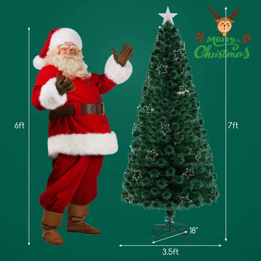 The 4/5/6/7 ft Xmas tree comes with 197/257/389/509 warm white LED lights and vibrant fiber optics, tailoring the tree for every festive function. Crafted from premium PVC, the 130/170/230/270 lush branches are fireproof, non-allergic, and fade-resistant. Customizable with adjustable star decorations, this Christmas tree offers a personalized touch to your holiday display. Complete with a sturdy metal stand and a safe UL-certified adaptor, this Xmas tree provides stability and security. This versatile tree can transform any area into a festive wonderland, whether in a cozy corner, bustling lobby, or commercial setting. Merry Christmas!Feature130/170/230/270 lush branch tips are made of premium PVC material for optimal durability Illumination elegance is ensured by the 197/257/389/509 LED lights and the top star LED light Adorned with 18 star decorations that allow for customized shapes Boasts colorful fiber optics, illuminating the season with a spectrum of wonder The UL-certificated adaptor is included to promote the using safety Comes with a folding metal stand to keep the Xmas tree upright Features a 1/2-section structure, simplifying storage when not in use Festive flexibility for decorations in your office, shop, school, carnival, etcSpecificationColor: Green Material: PVC, Metal Tree Height: 4/5/6/7 ft Tree Width: 2/2.5/3.5 ft Diameter of Stand: 12/14/16/18" Number of Branch Tips: 130/170/230/270 Number of LED Lights: 197/257/389/509 Number of Star Decorations: 18/24/36/48 Number of Sections: 1/2 Net Weight: 6/8.5/12.5/14.5 lbs Package Includes: 1 x Christmas Tree 1 x User Guide