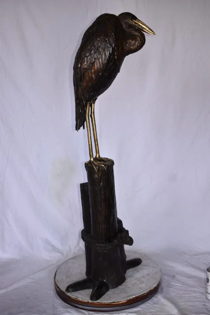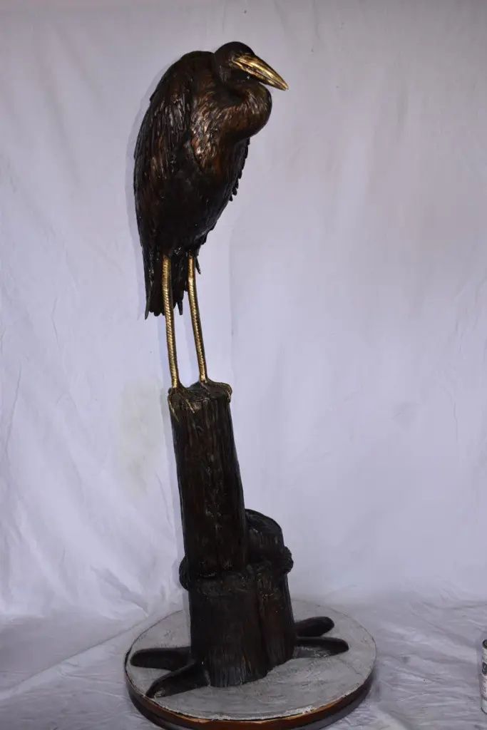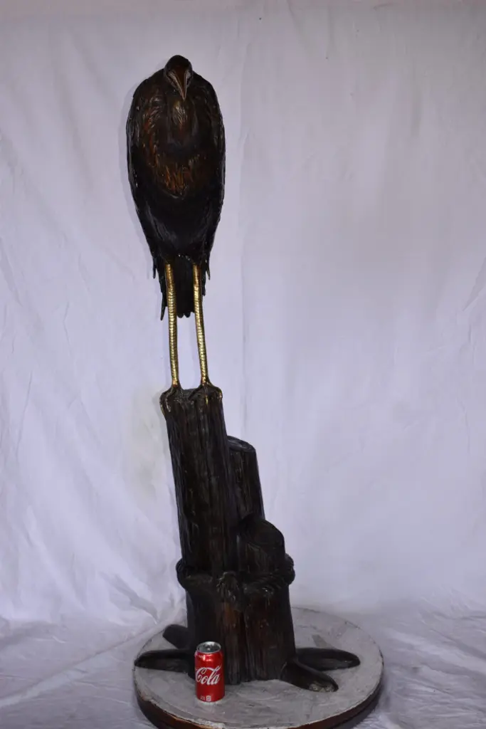 Crane Head Down Standing On A Tree Stump Bronze Statue Size: 23" X 16" X 55"h
