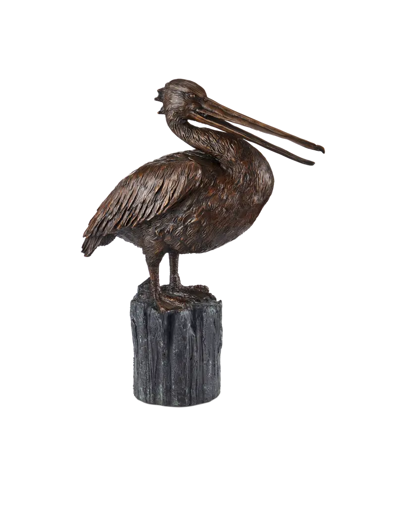 Bronze Crane standing on a Tree Stump with his head down, just like those seen in traditional English gardens, is an Asian symbol of peace. This bronze handmade sculpture was cast using the Lost Wax Method and finished with different tones of brown patina. The statue is a one-of-a-kind art piece, made to give your home style and personality. Get one for yourself or surprise a friend with an unforgettable gift! Size: 23"L x 16"W x 55"H. Weight is: 56Lb