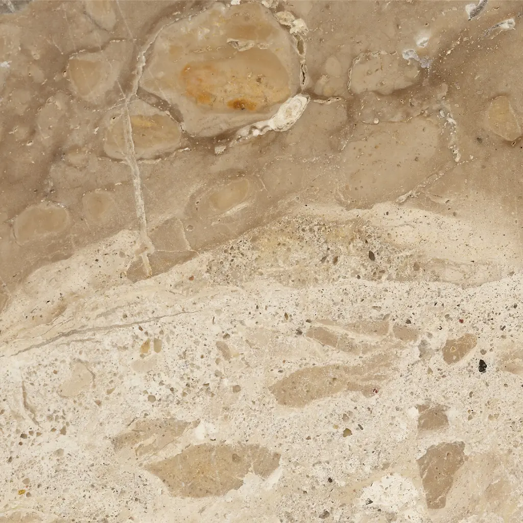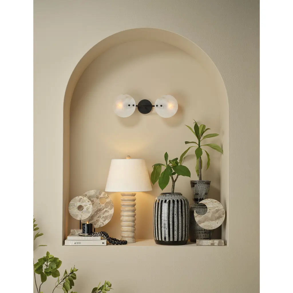 This dramatic sculpture uses cream colored marble to reflect and respect the beauty of celestial objects. The intrinsic veining and shading of the natural stone nods to the rocky formations of our constant companions in the sky. They are sized to make a strong visual impact, and are a wonderful way to add height to any tabletop display. No two will be identical.