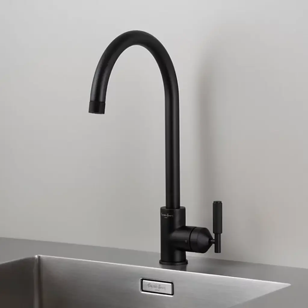 The Cross Dual-Spray Mixer Pull-Out Kitchen Faucet from Buster + Punch is a streamlined faucet that features a cane-shaped framework crafted from durable brass, combining transitional style with exceptional durability. It effortlessly mixes hot and cold water lines to provide the right temperature for your needs. It comes with a cross-knurled lever and aerator cap, adding a touch of sophistication to your kitchen décor. With a 360-degree spout movement, it offers flexibility and convenience, allowing you to reach every corner of your sink effortlessly.