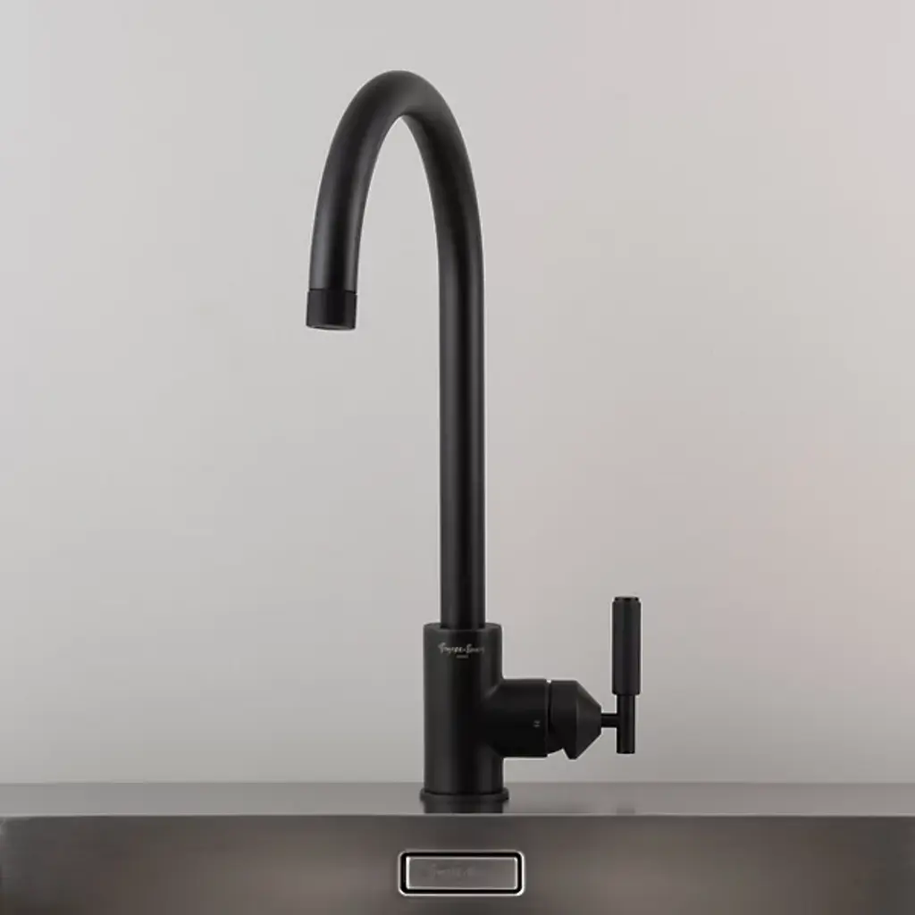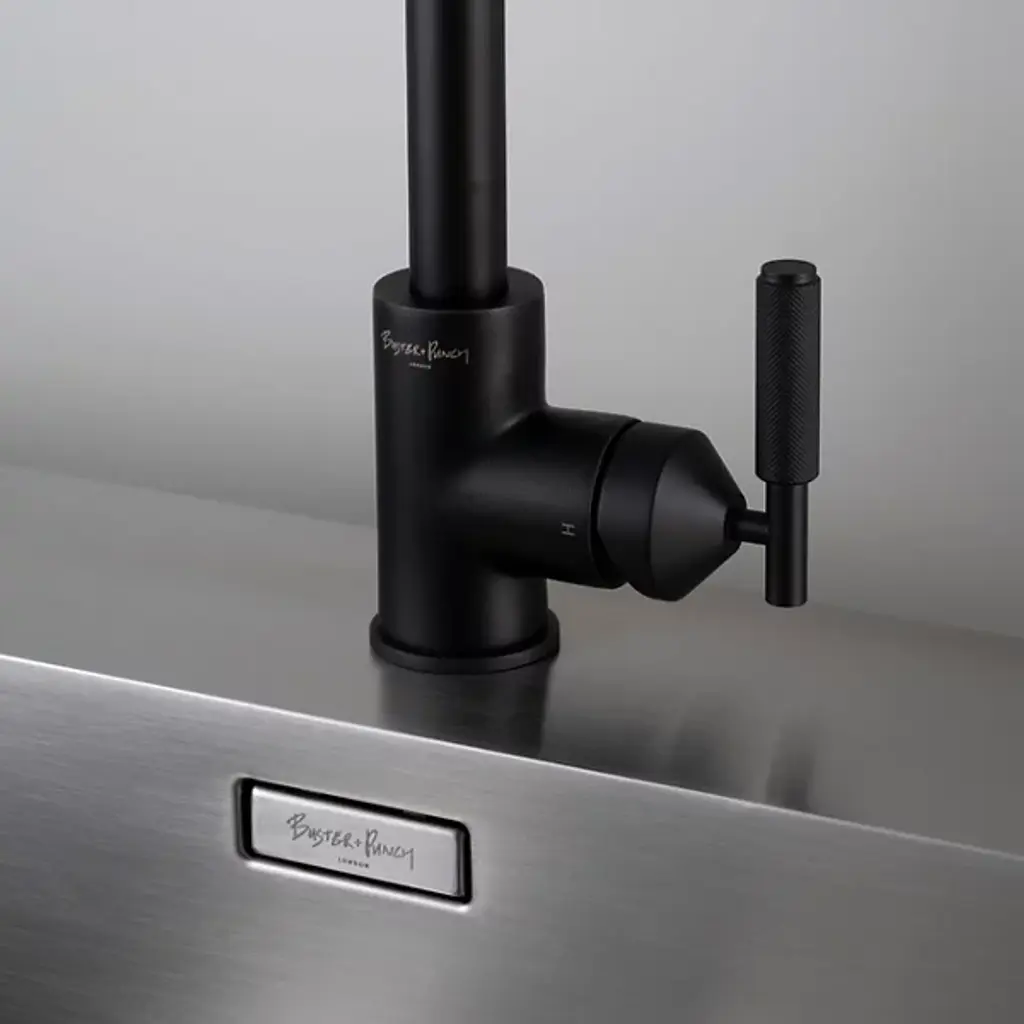 The Cross Mixer Kitchen Faucet from Buster + Punch brings elegance to your kitchen with its transitional aesthetic. Crafted from fine brass, this faucet is not just a functional piece but also a statement of style. The brass is elegantly contoured into a cane-like shape, adding a distinctive and artistic dimension to your kitchen decor. It comes with supplied fixings for convenience. The streamlined handle is vertically oriented to provide precise control.
