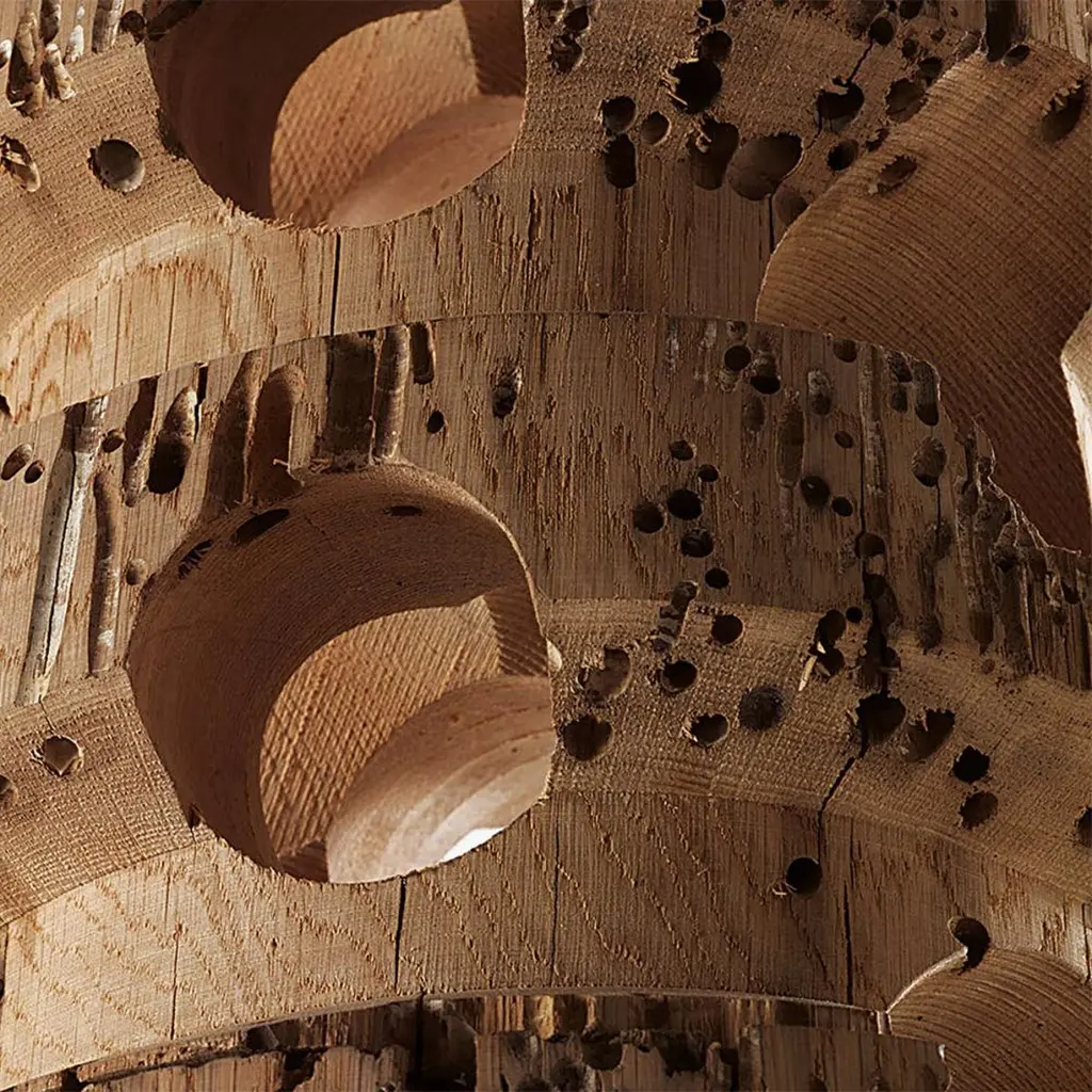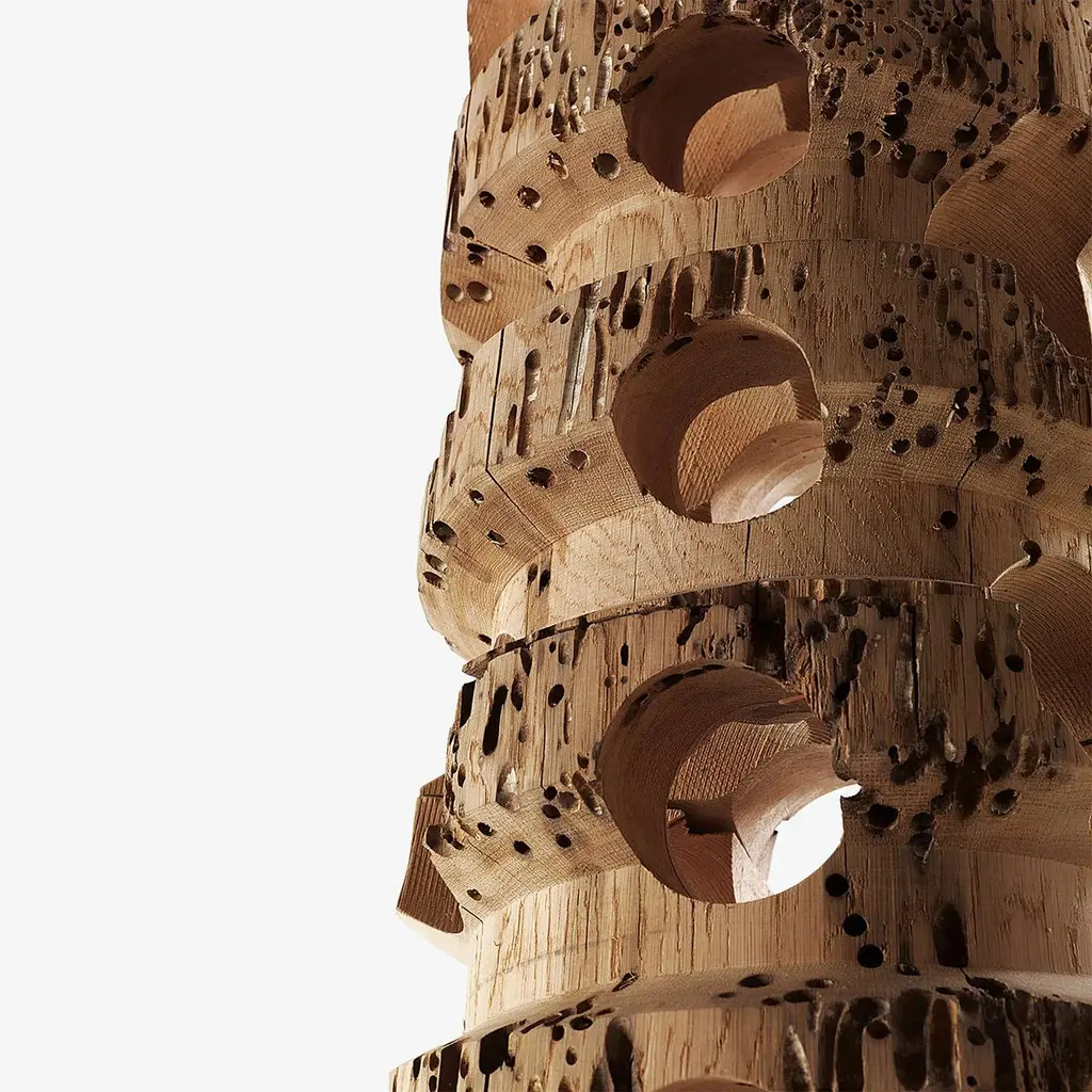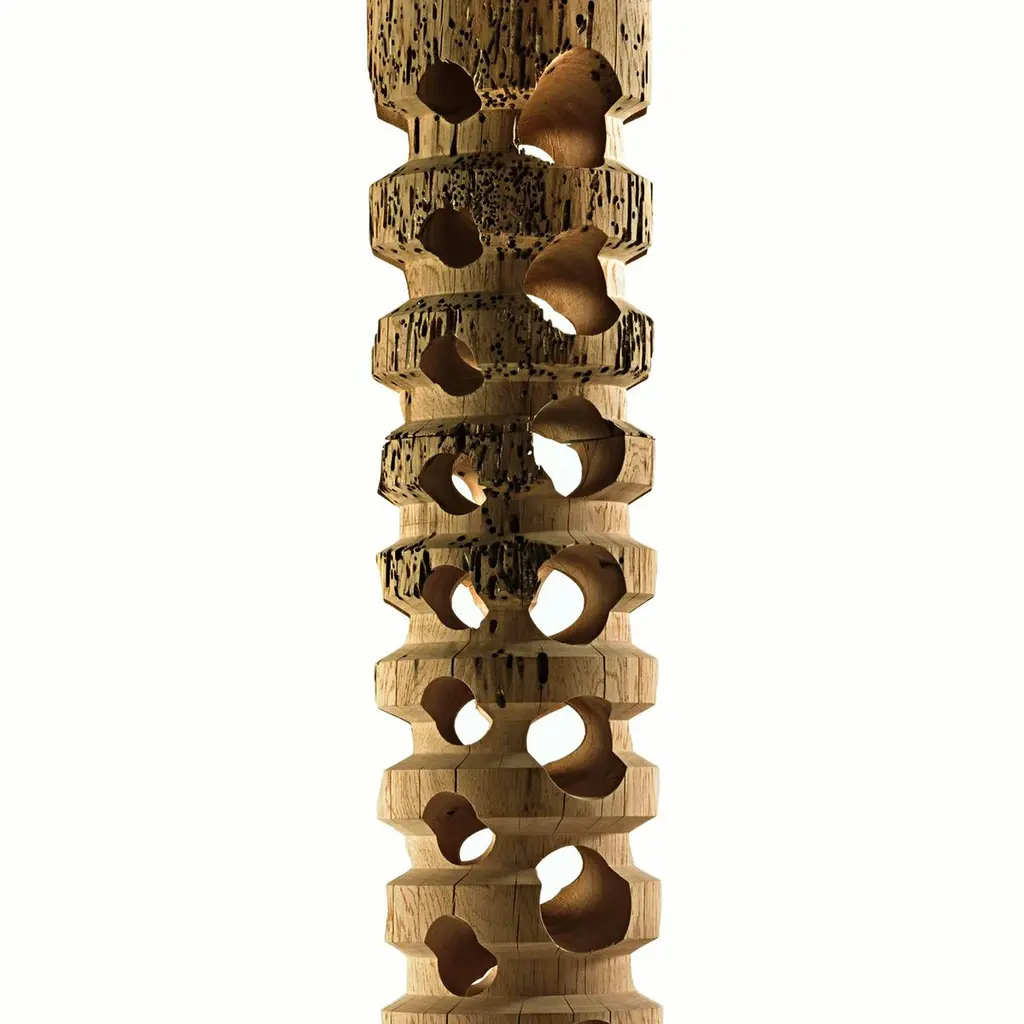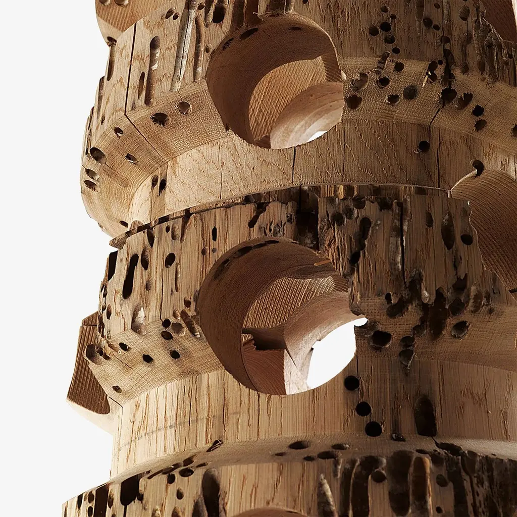 Sculpture crossing raw oak all in solid raw oakfrom Venice canals columns. With iron base.Measure: Base diameter: 90cm.