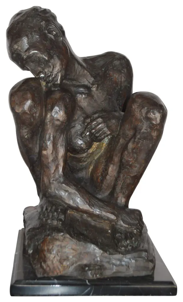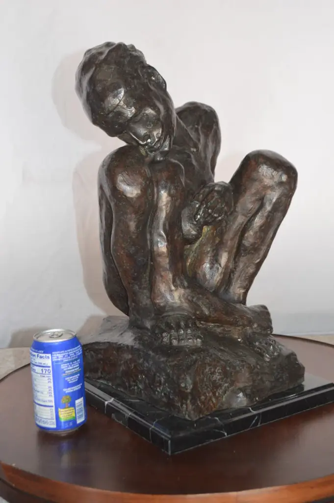 This is a pure Bronze Statue replica of The Crouching Woman by Auguste Rodin. Based on the couple from "Dante''s Inferno." AUGUSTE RODIN (1840-1917). In between Romanticism and Impressionism this self-willed Frenchman created some of the most famous pieces known in the art of sculpting. He was very talented at conveying feeling in his compositions by emphasizing gesture. Also, his rough surface texture with deep hollows added strong shadows and naturalism to the human form. Rodin''s goal, as he put it, was "to render inner feelings through muscular movement." He achieved this aim by joining his profound knowledge of anatomy and movement with special attention to the body''s surfaces, saying, "The sculptor must learn to reproduce the surface, which means all that vibrates on the surface, soul, love, passion, life...Sculpture is thus the art of hollows and mounds, not of smoothness, or even polished planes." Size: 11"L x 16"W x 18"H. Weight is: 44Lb