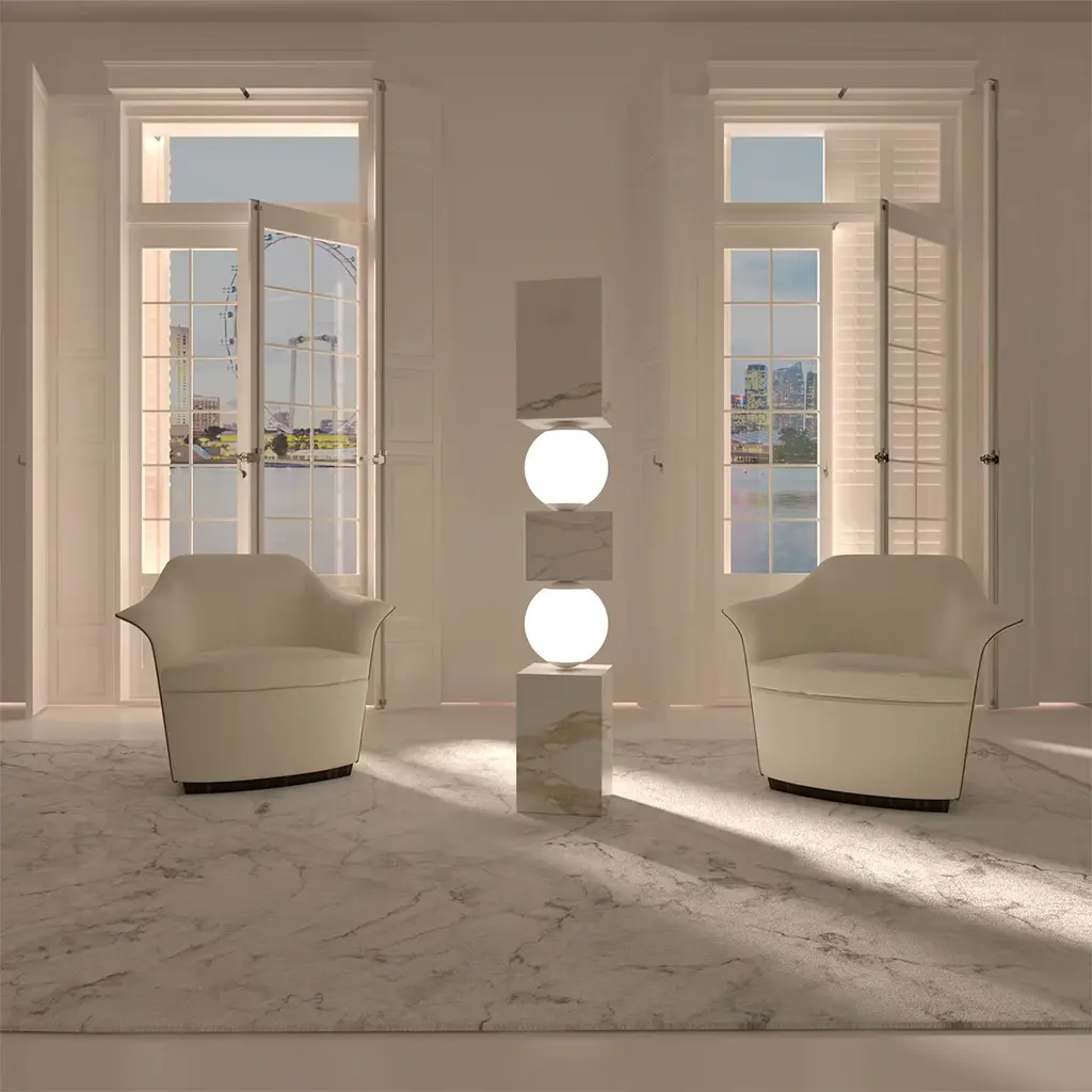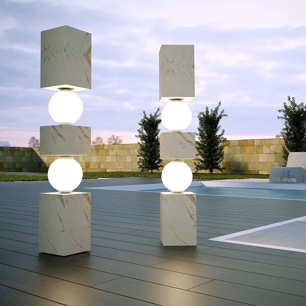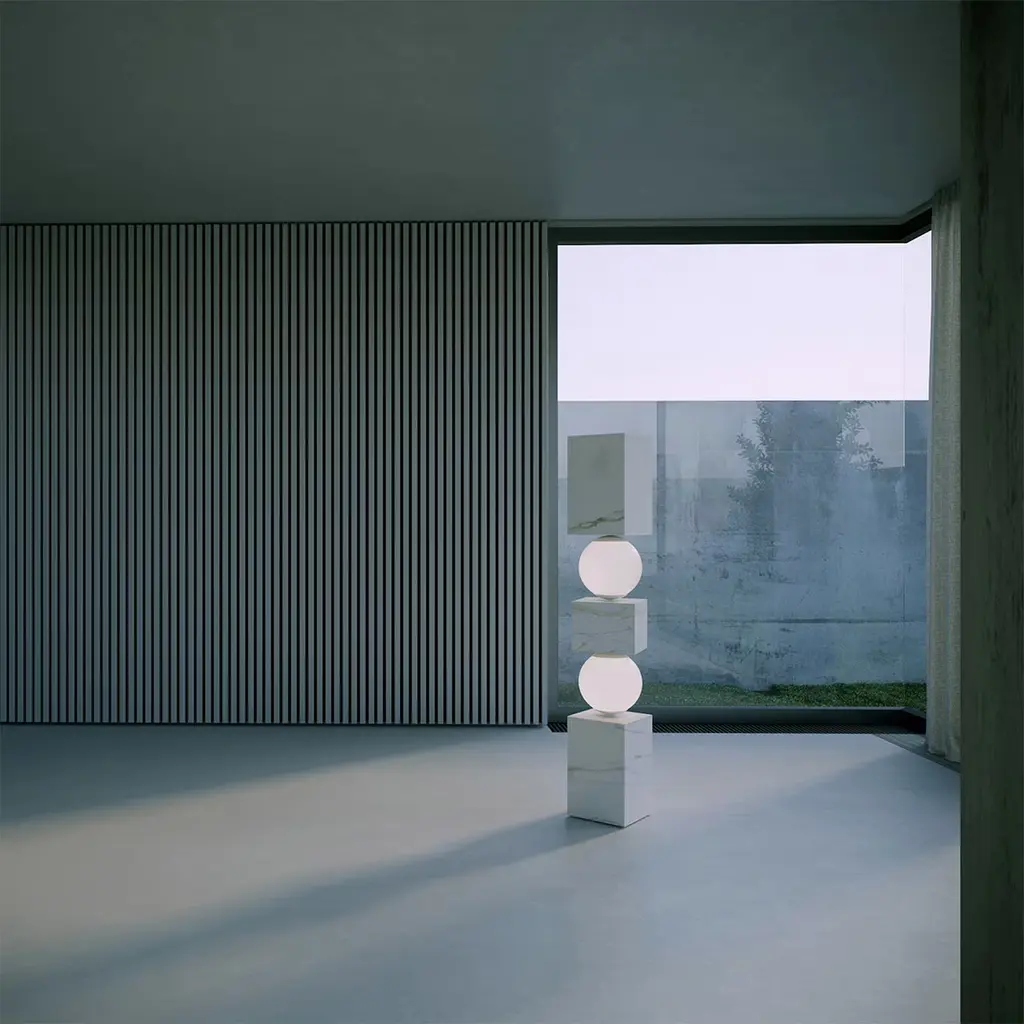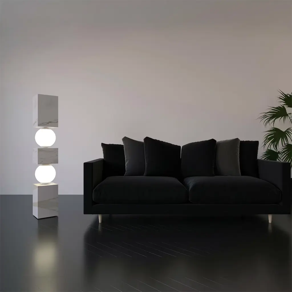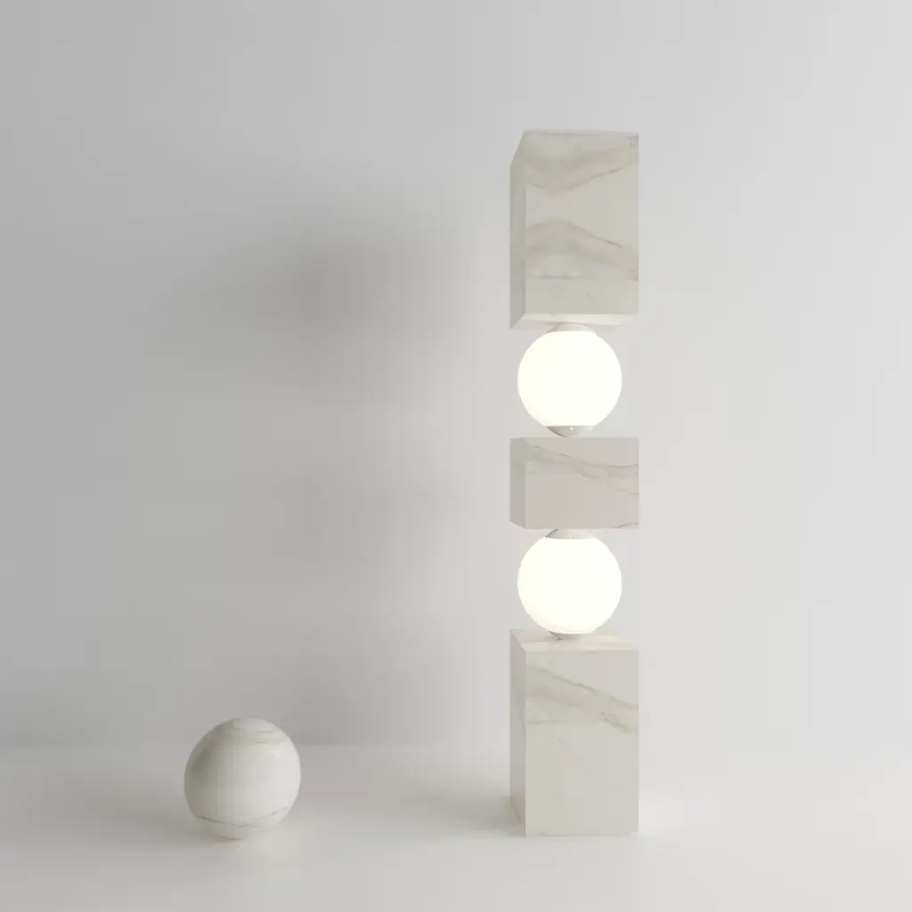 Marvel at the illusion of precarious equilibrium as marble blocks intersect, seemingly defying gravity. Supported by glowing spheres, this sculpture transforms into a stunning lamp, casting an unexpected radiance.