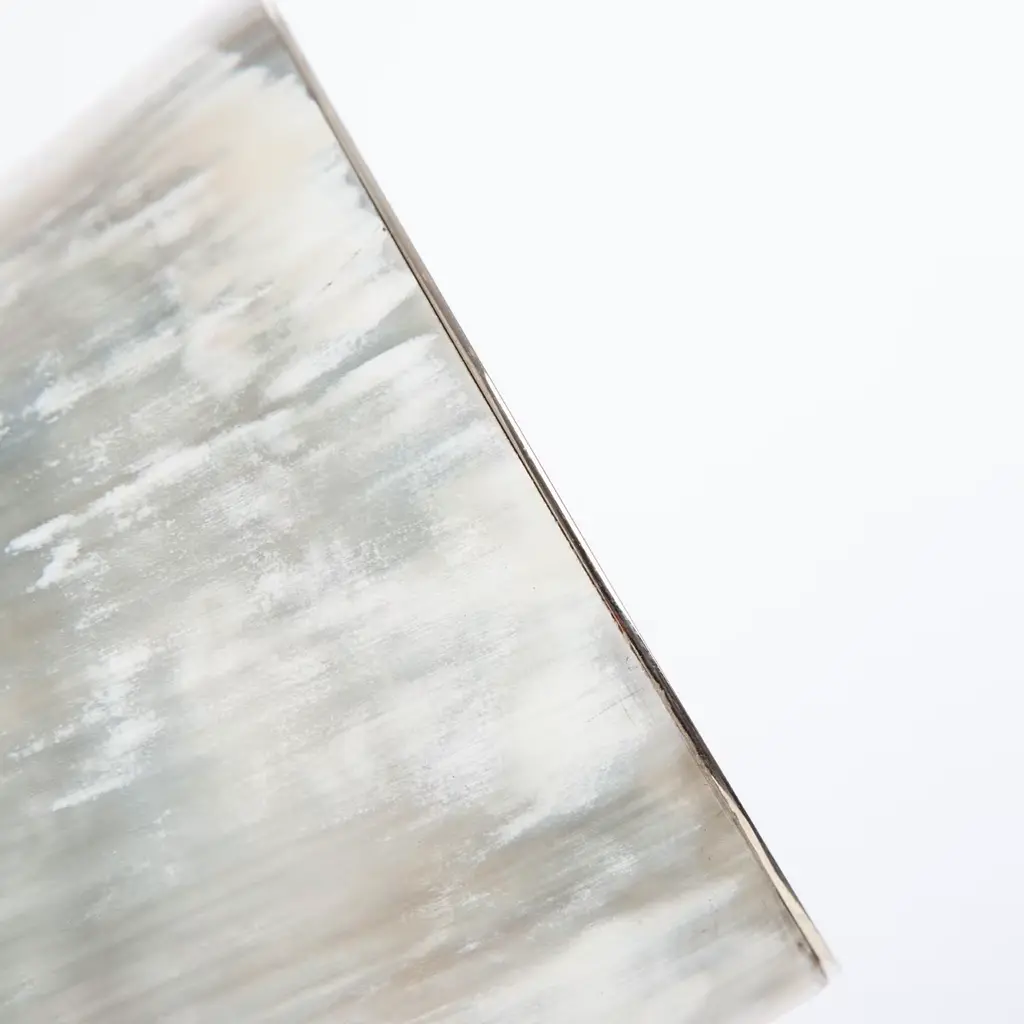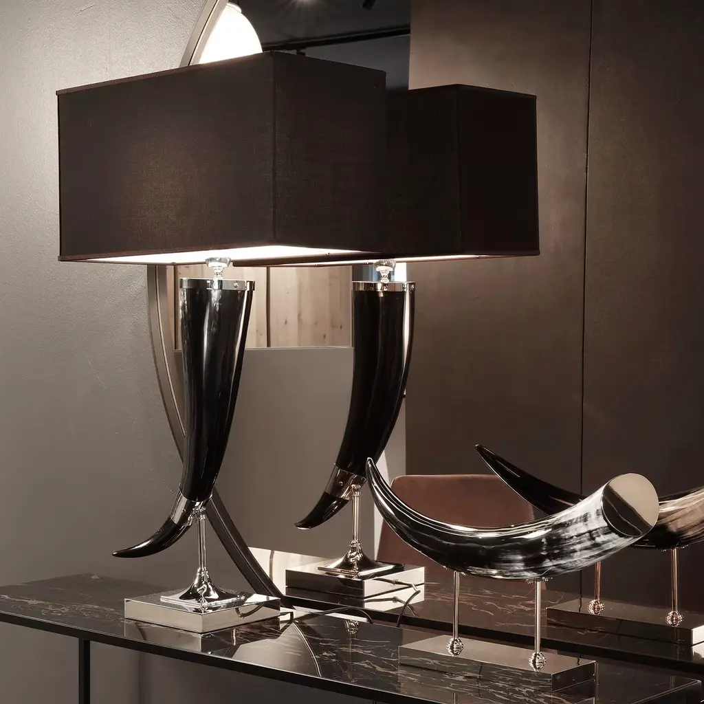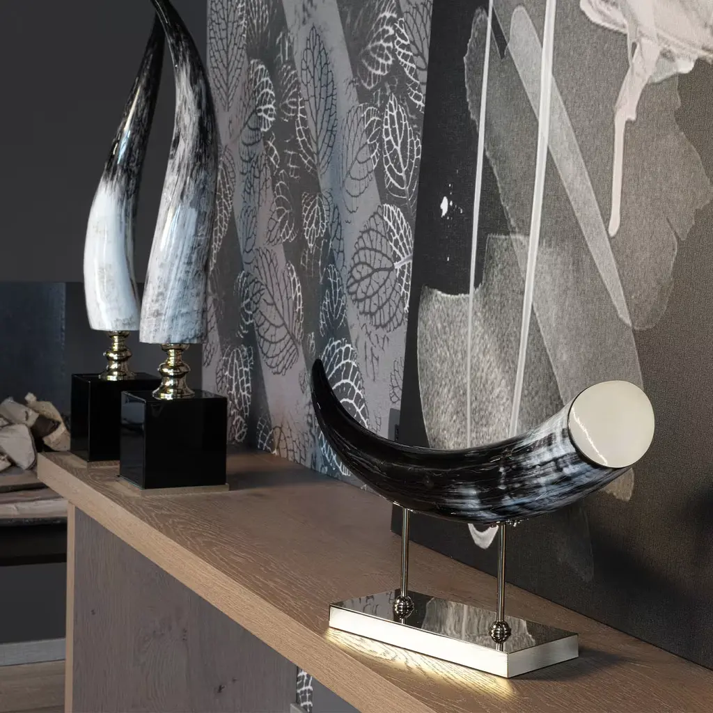 Horn sculpture featuring a sleek black and white veined finish with a glossy surface, mounted on a polished nickel-finish brass base. Its curved form combines natural elegance with modern metallic accents, making it a distinctive decorative piece for contemporary interiors.