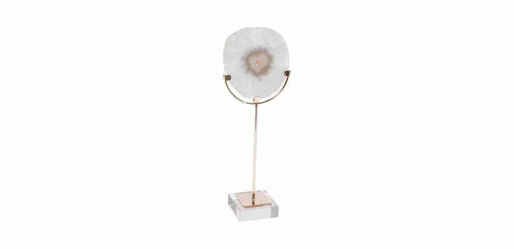 This magnificent accent piece showcases textural depth and a beautiful color palette that will greatly elevate an interior space. Rings of natural cyanite stone form a gorgeous ringed mosaic that showcases alluring shades of blue and green. The piece is supported by a cubic base of marble, matched by a thin marble border that surrounds the cyanite centerpiece. A slender rod of polished brass separates the base from the mosaic, providing a lovely juxtaposition between shiny metallics and rugged natural stone. A gorgeous statement piece on its own, the Cyanite Rings Mosaic Sculpture can also be placed alongside its alternate variant to further elevate the look.