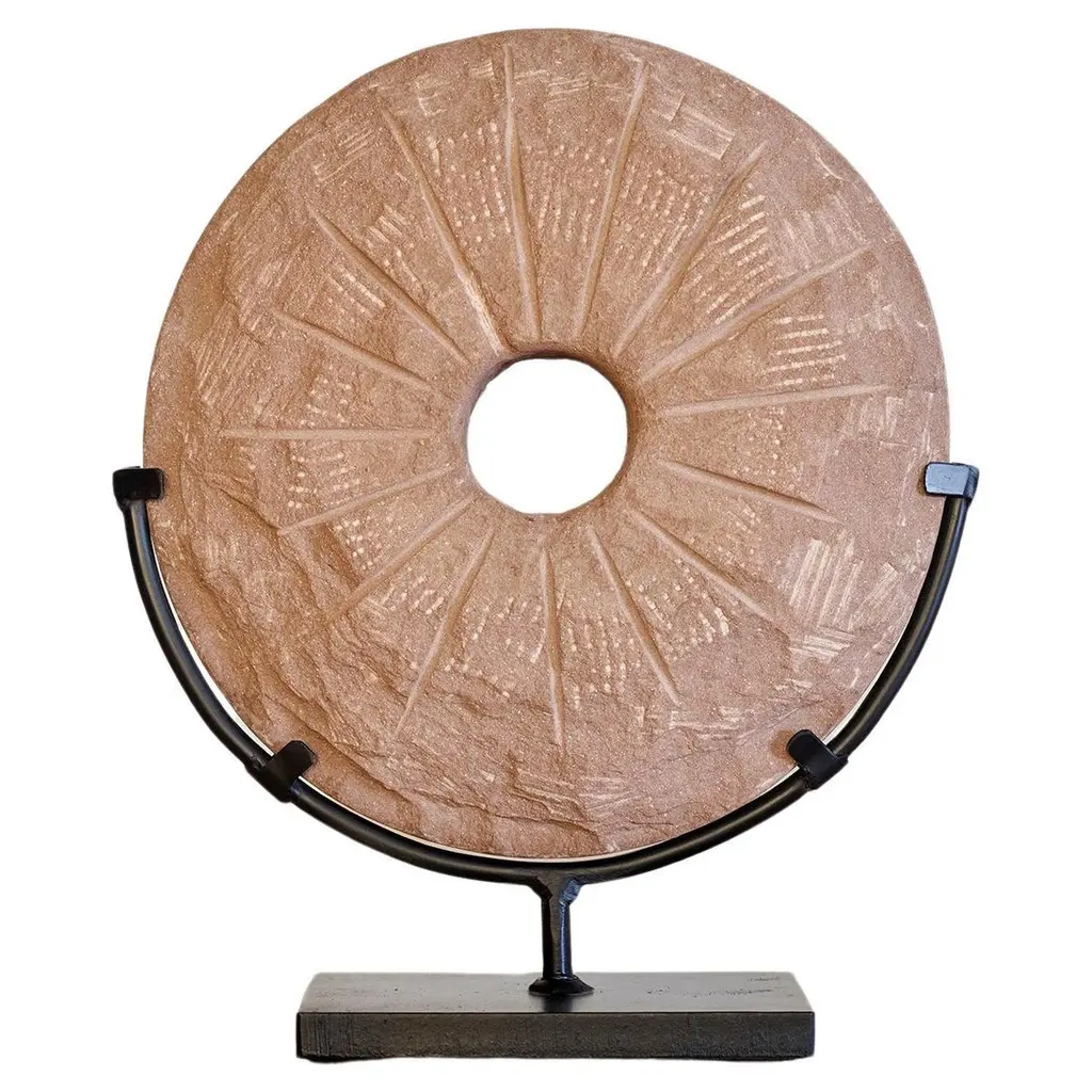 The Daman Brass Disc has a heavily pitted surface that is rougher than a rough-case treatment, which brings the gold sculpture an intense texture. Adding to this effect is the aged brass finish that collects in the larger crevices to create added patina. A design detail of note is how the rectangular marble base is beveled. The Dany Brass Disc is a similar design in a larger size.