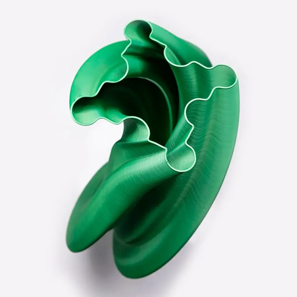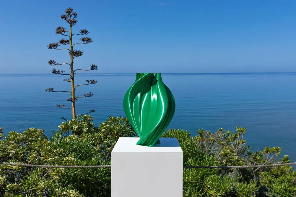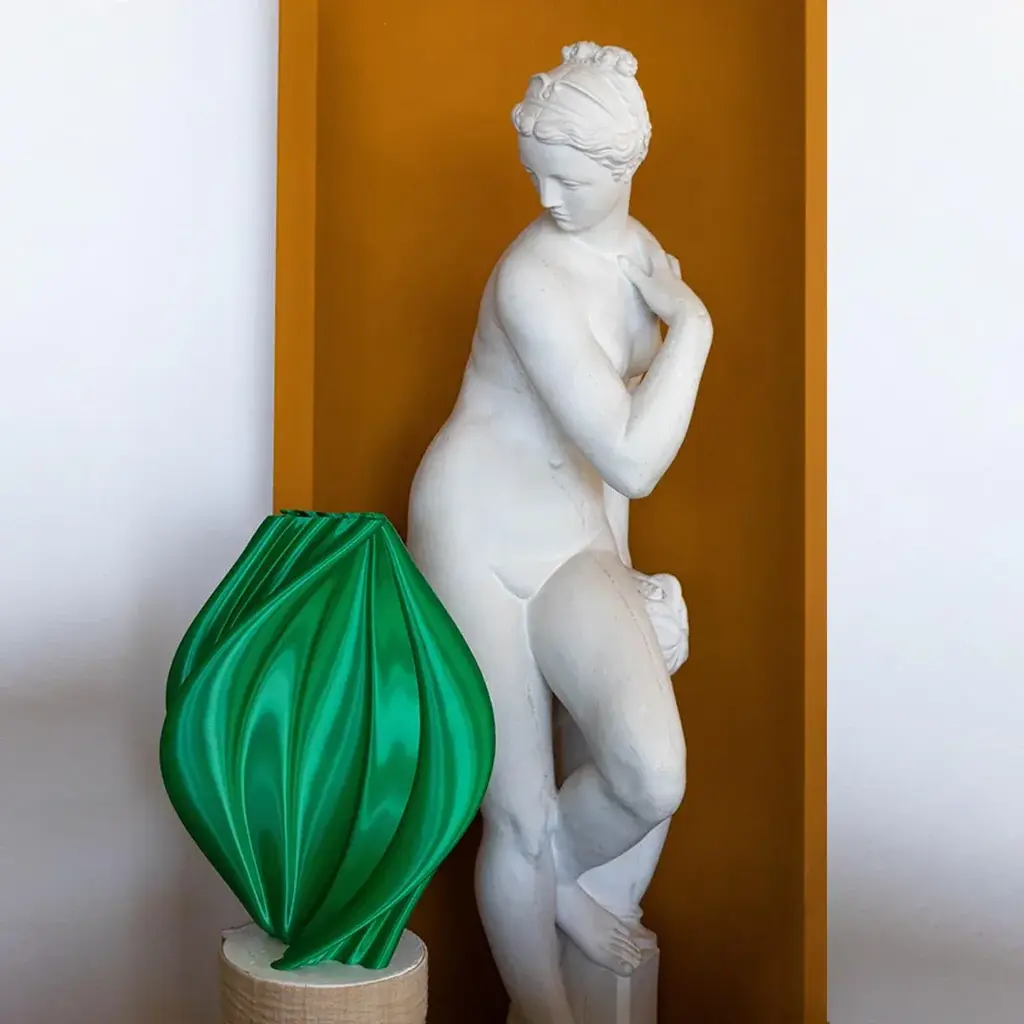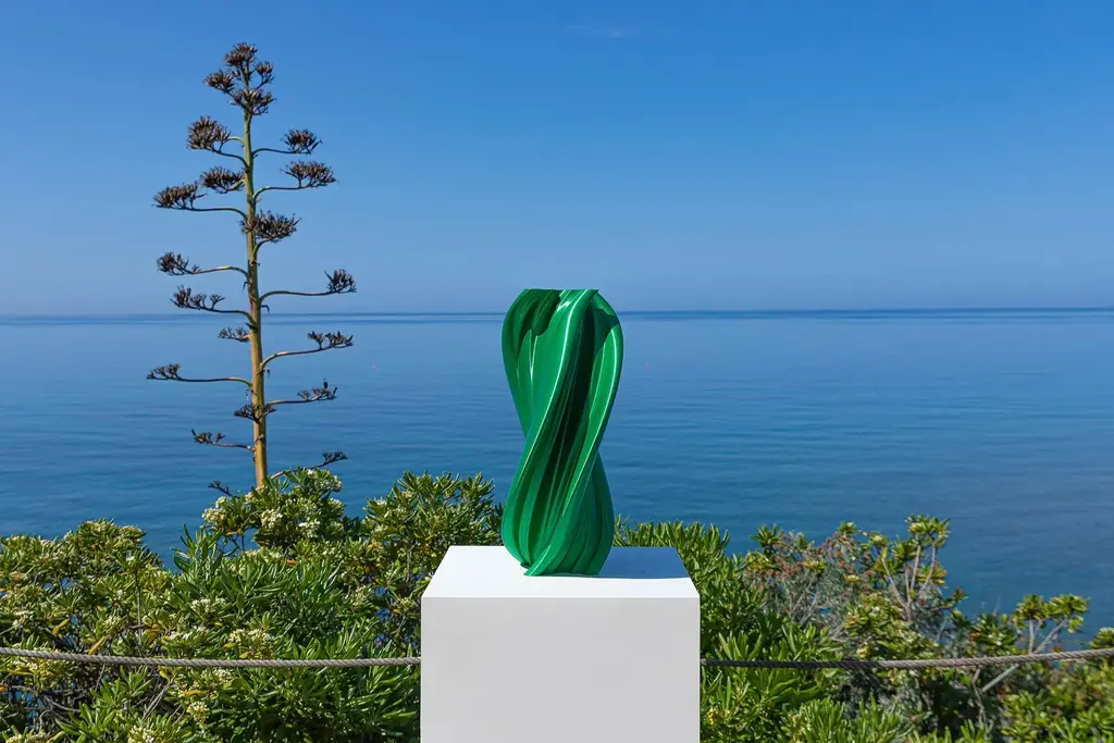 Elegant work with an organic and contemporary design. A majestic and harmonious design, exquisitely defined by sinuous lines that hovering in a soft and relaxing S shape, this spectacular sculpture will raise the appearance of a contemporary interior. An elegant and unique element that takes its name from the classic mythological character Damocle. Created in silk material. Totally ecological and biodegradable this material is obtained from the fermentation of the starch contained in corn. The refined metal and silky effect of the color is bright and bright while it is smooth and regular to the touch. All Dygodesign works are delivered to the customer with their own certificate of sealed authenticity that guarantees its originality, complete biologicality and Italian production. Signed by Maker,Labeled by Maker,Numbered
