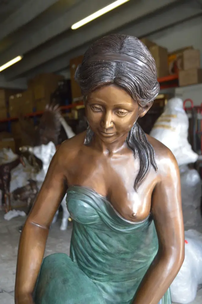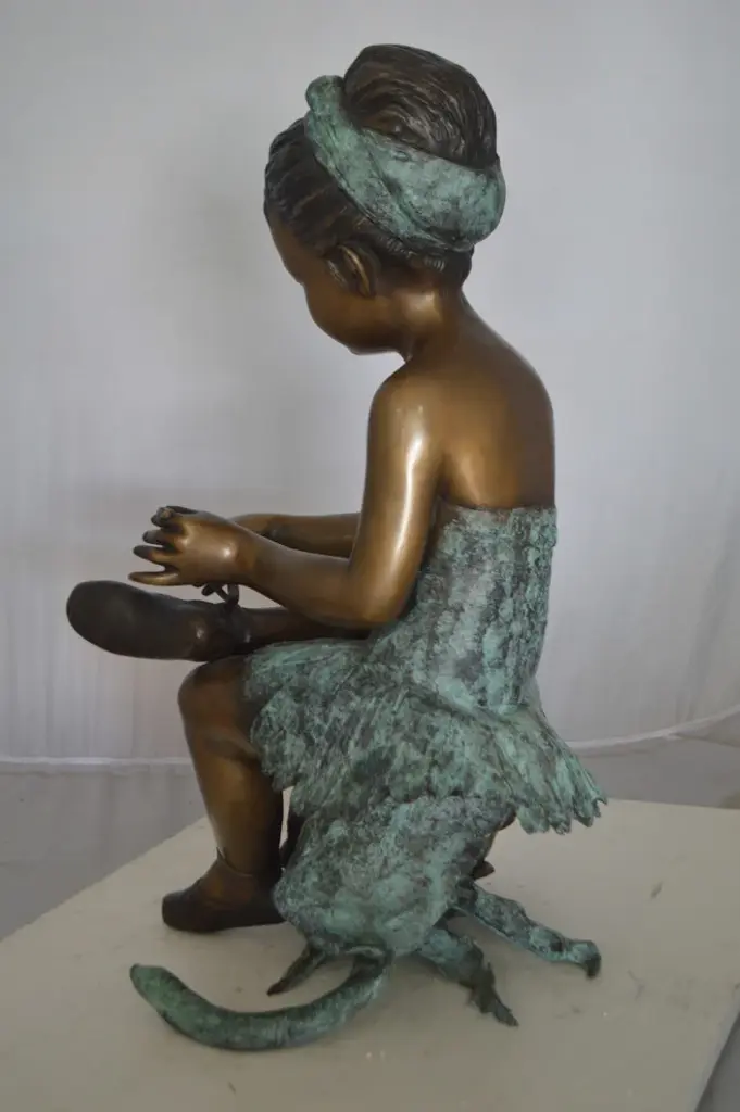 Figure dancers are known for their grace, athleticism, and beauty. All of these components are capture in this beautiful bronze statue of a dancer sitting next to a large Rose tying her dance shoes getting ready for her performance. The sculpture tones are finished in a lacquer patina on a bronze base. This is a perfect addition to a home, and reminds us of the simple things in life. Size: 15"L x 17"W x 26"H. Weight is: 26Lb