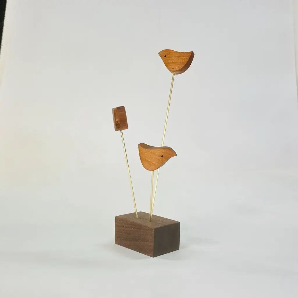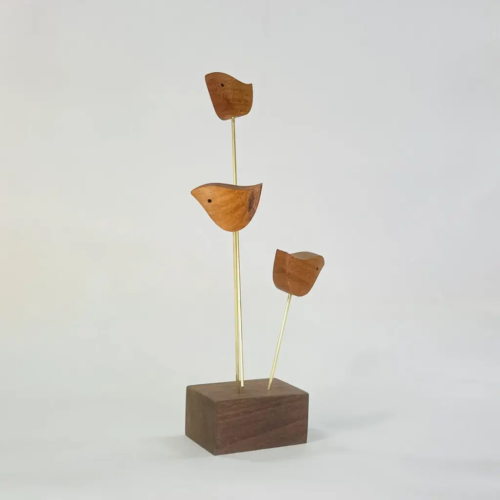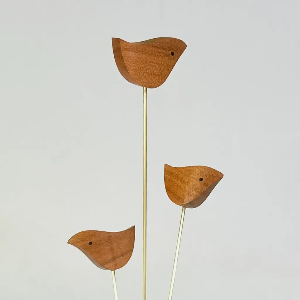 Gotta go back to the office? Take a little Danish/ Mid Century Modern Style Decor with you! These "Three Little Birds" are smaller versions of my Milwerk "Happy Birds" inspired by the wooden bird figurines of Danish Designer Jacob Hermann. Each little handmade bird is sculpted from small pieces of Cherry hardwood leftover from other projects in my shop. (No wood left behind!!!) The birds fly above a Walnut hardwood base via solid brass rods. The rods can be removed from the base giving you the option to display the birds in other settings. Perfect for dressing up your potted plants and succulents! This sculpture has been sanded to a very fine finish and sealed with Danish oil. Creation Year: Made to Order, Please allow 7 business days to process before shipping. Medium: Cherry (Birds), Walnut (Base), Brass (Rods) Because each sculpture is "Made To Order" the grain pattern may vary from the sculpture pictured in this listing. Style: Tiki, Folk art & Mid Century Modern/ Danish Dimensions: 10 1/2" tall x 4" wide x 3 1/2" deep Please refer to the listing photo with soda bottle for an idea of dimensions. Shipping: We gladly ship Internationally! International customers are responsible for any customs, import and/ or VAT fees that may apply. Cross-posted. Milwerk Sculptures are inspired by the style of Mid Century Modern Danish designers like Jacob Hermann and Svend Aage Holm‑Sørensen and American Mid Century designers Charles and Ray Eames. In many pieces, the grain determines the subject and shape of the sculpture bolstering the organic quality of the wood. Each piece is an original, cut and shaped by hand. Each sculpture is signed (engraved) MILWERK with the year of manufacture.