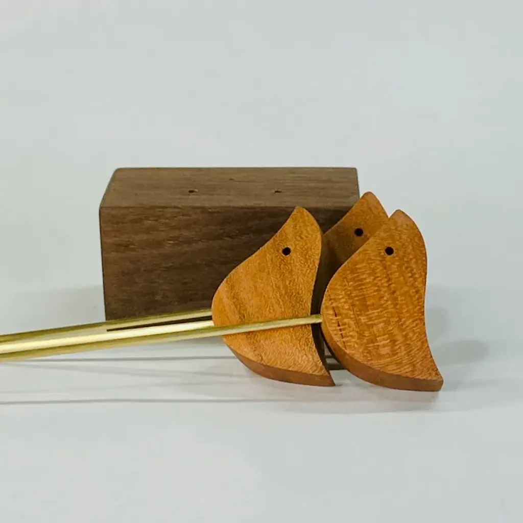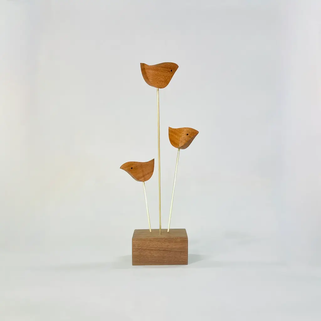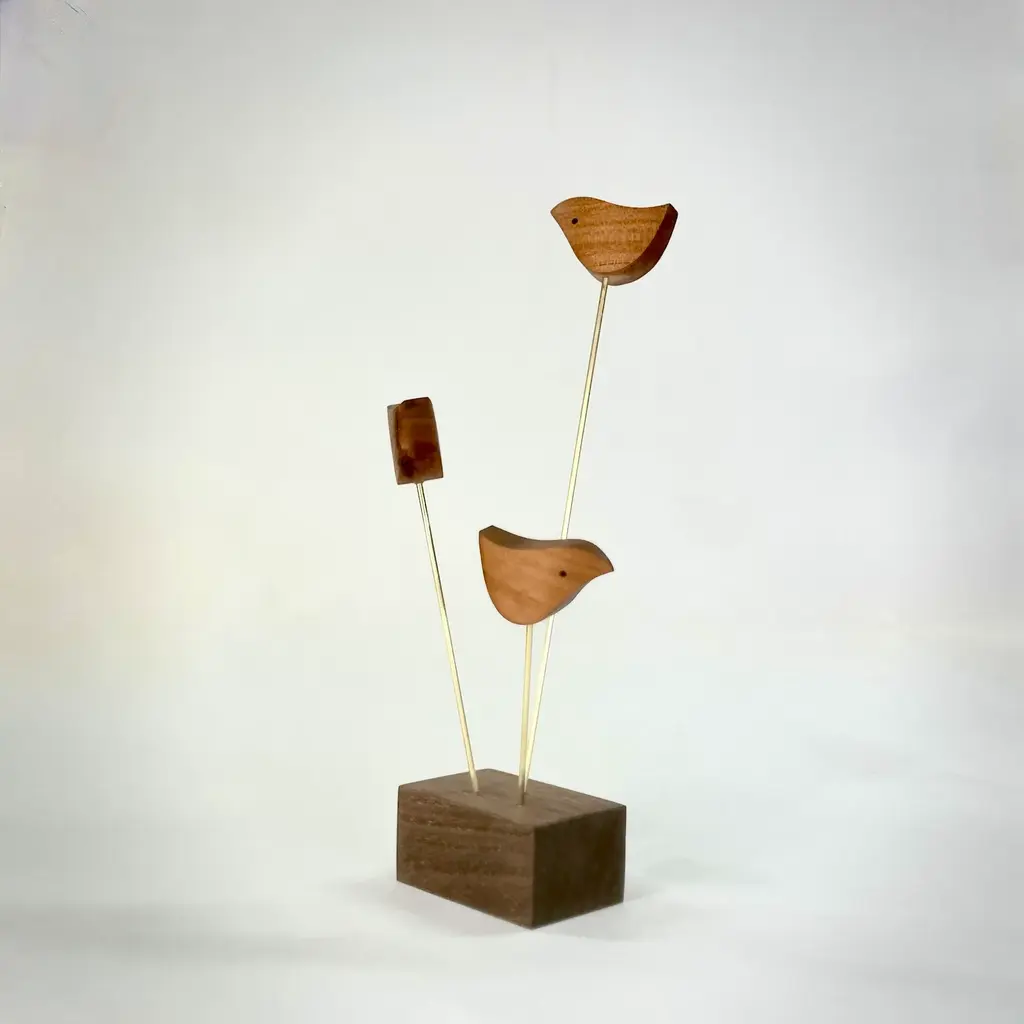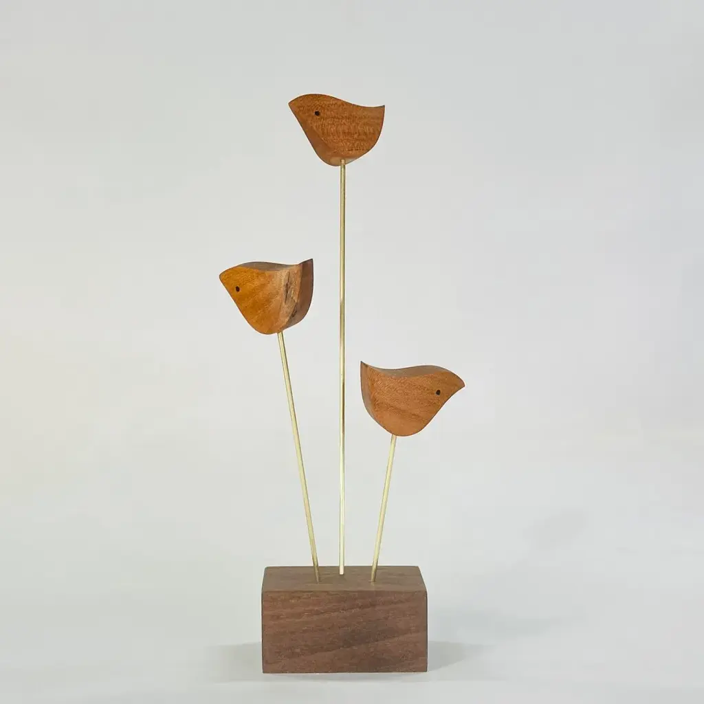 Gotta go back to the office? Take a little Danish/ Mid Century Modern Style Decor with you! These "Three Little Birds" are smaller versions of my Milwerk "Happy Birds" inspired by the wooden bird figurines of Danish Designer Jacob Hermann. Each little handmade bird is sculpted from small pieces of Cherry hardwood leftover from other projects in my shop. (No wood left behind!!!) The birds fly above a Walnut hardwood base via solid brass rods. The rods can be removed from the base giving you the option to display the birds in other settings. Perfect for dressing up your potted plants and succulents! This sculpture has been sanded to a very fine finish and sealed with Danish oil. Creation Year: Made to Order, Please allow 7 business days to process before shipping. Medium: Cherry (Birds), Walnut (Base), Brass (Rods) Because each sculpture is "Made To Order" the grain pattern may vary from the sculpture pictured in this listing. Style: Tiki, Folk art & Mid Century Modern/ Danish Dimensions: 10 1/2" tall x 4" wide x 3 1/2" deep Please refer to the listing photo with soda bottle for an idea of dimensions. Shipping: We gladly ship Internationally! International customers are responsible for any customs, import and/ or VAT fees that may apply. Cross-posted. Milwerk Sculptures are inspired by the style of Mid Century Modern Danish designers like Jacob Hermann and Svend Aage Holm‑Sørensen and American Mid Century designers Charles and Ray Eames. In many pieces, the grain determines the subject and shape of the sculpture bolstering the organic quality of the wood. Each piece is an original, cut and shaped by hand. Each sculpture is signed (engraved) MILWERK with the year of manufacture.