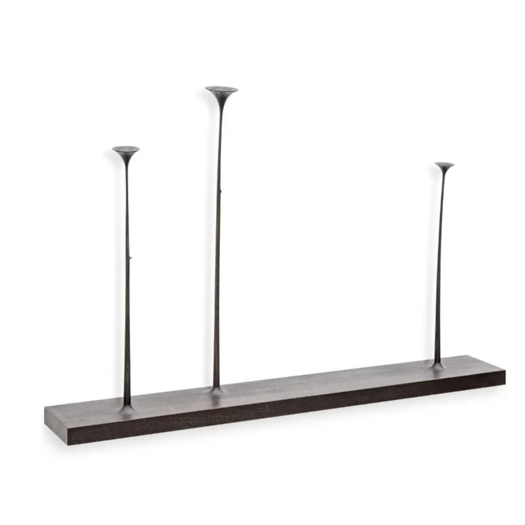 Dark Kukkii sculpture 3 Flowers by Antrei HartikainenMaterials: Black stained oak, natural oil waxed walnutDimensions: W 75 / 60 / 40 cm, D 10 cm, H 34 / 42 cmAlso Available: light color & different flower amountsKukkii (blooms) is a unique collection of slender-stemmed, wooden flowers and plants which, variously grouped, capture the moment of calm and freedom sometimes experienced in nature. The sculptural groups may be positioned on windowsill, or wall mounted as a floating shelf. The sculptures are handcrafted using a variety of techniques. Kukkii sculptures won Product of the Year 2017 award in MUOTO gala, a gala awarding the best Finnish design.ANTREI HARTIKAINEN Is a master cabinetmaker and designer from finland known for his exquisite works in wood. The award- winning pieces, including functional products and pure art works, achieve heights of sensuality, elegance and craftsmanship. These important factors are emphasized in Antrei Hartikainen’s work, which constantly seeks to challenge and blur the traditional categorizations between functional objects and visual arts. Hartikainen’s sculptural approach can be studied through his organic body of work, which simultaneously highlights the inspiration drawn from his material of choice, wood. Antrei hartikainen has shown his works in numerous solo and group exhibitions all over the world. Antrei have been awarded with prize as a Young Designer of the Year 2018 in Finland and shortlisted as Emerging Designer of the Year 2019 by Dezeen awards.