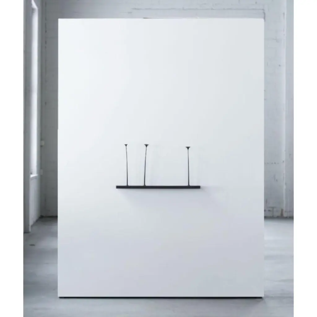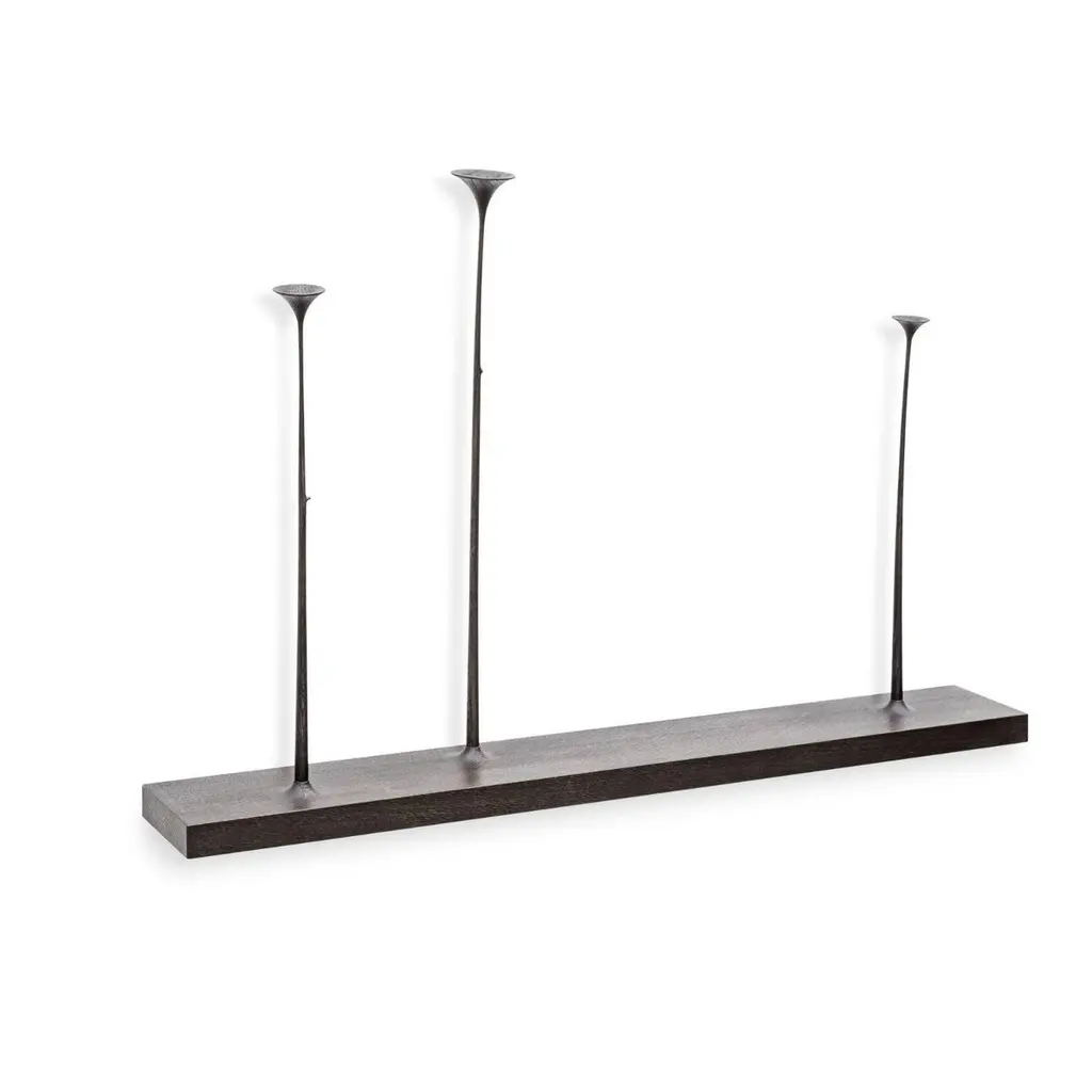 Dark Kukkii sculpture 3 flowers by Antrei HartikainenMaterials: Black stained oak, natural oil waxed walnutDimensions: W 75 / 60 / 40 cm, D 10 cm, H 34 / 42 cmAlso available: light color & different flower amountsKukkii (blooms) is a unique collection of slender-stemmed, wooden flowers and plants which, variously grouped, capture the moment of calm and freedom sometimes experienced in nature. The sculptural groups may be positioned on windowsill, or wall mounted as a floating shelf. The sculptures are handcrafted using a variety of techniques. Kukkii sculptures won Product of the Year 2017 award in MUOTO gala, a gala awarding the best Finnish design.Antrei Hartikainen is a master cabinetmaker and designer from finland known for his exquisite works in wood. The award- winning pieces, including functional products and pure art works, achieve heights of sensuality, elegance and craftsmanship. These important factors are emphasized in Antrei Hartikainen’s work, which constantly seeks to challenge and blur the traditional categorizations between functional objects and visual arts. Hartikainen’s sculptural approach can be studied through his organic body of work, which simultaneously highlights the inspiration drawn from his material of choice, wood. Antrei hartikainen has shown his works in numerous solo and group exhibitions all over the world. Antrei have been awarded with prize as a Young Designer of the Year 2018 in Finland and shortlisted as Emerging Designer of the Year 2019 by Dezeen awards.