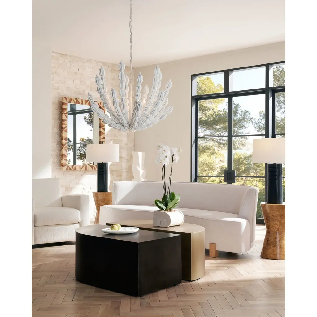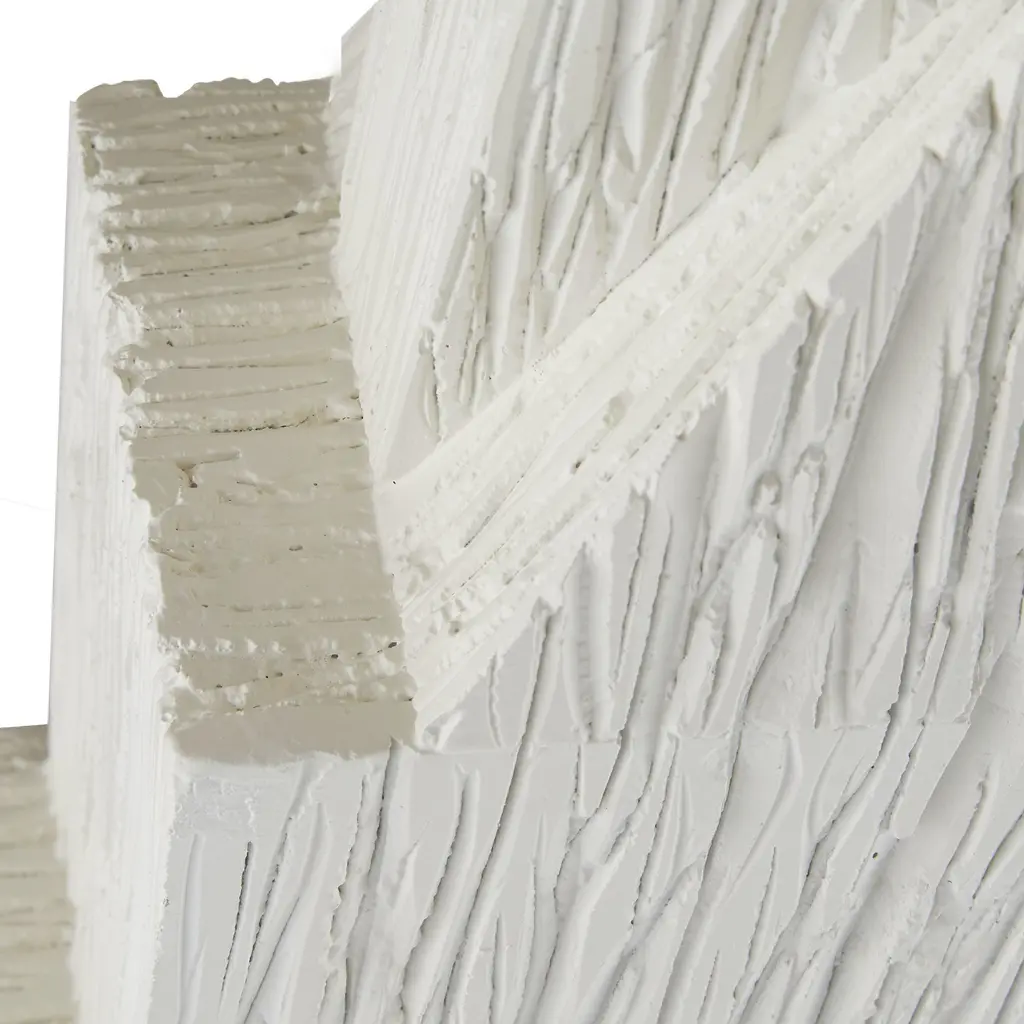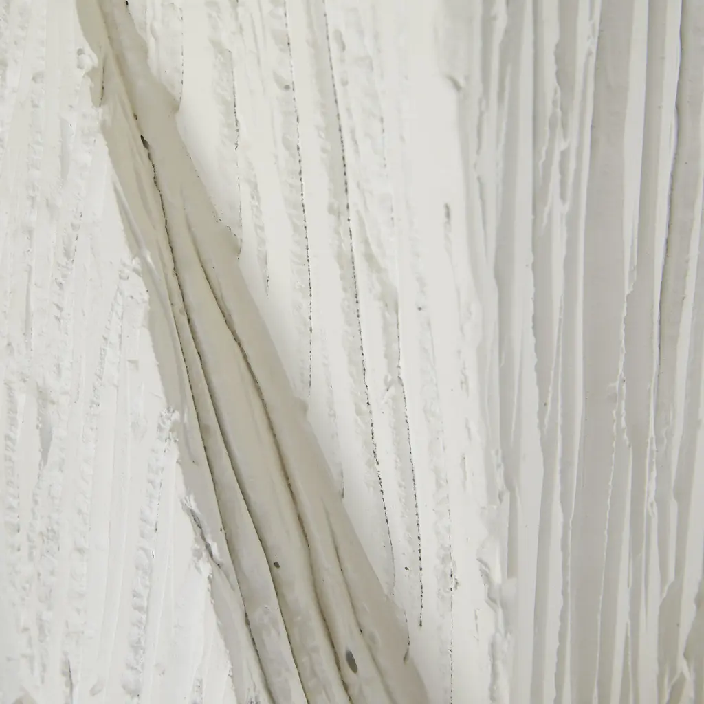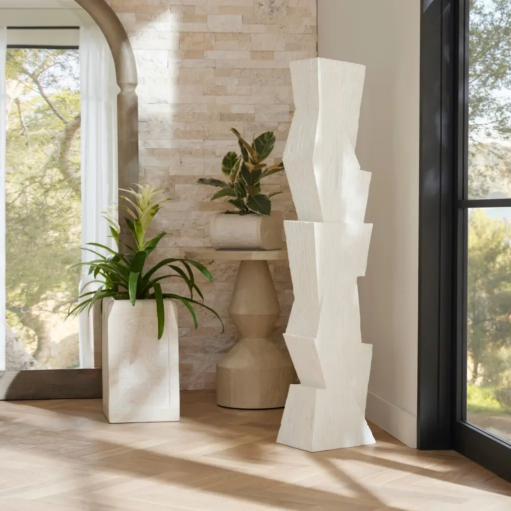 A Totem Of Matte White Resin Is A Commanding Accent Piece For Any Corner Of The Room. Designed To Draw The Eye To Its Geometric Form, A Faux Wood Finish Adds A Dynamic Accent To The Texture On Its Vertical Surface. Finish Will Vary.
