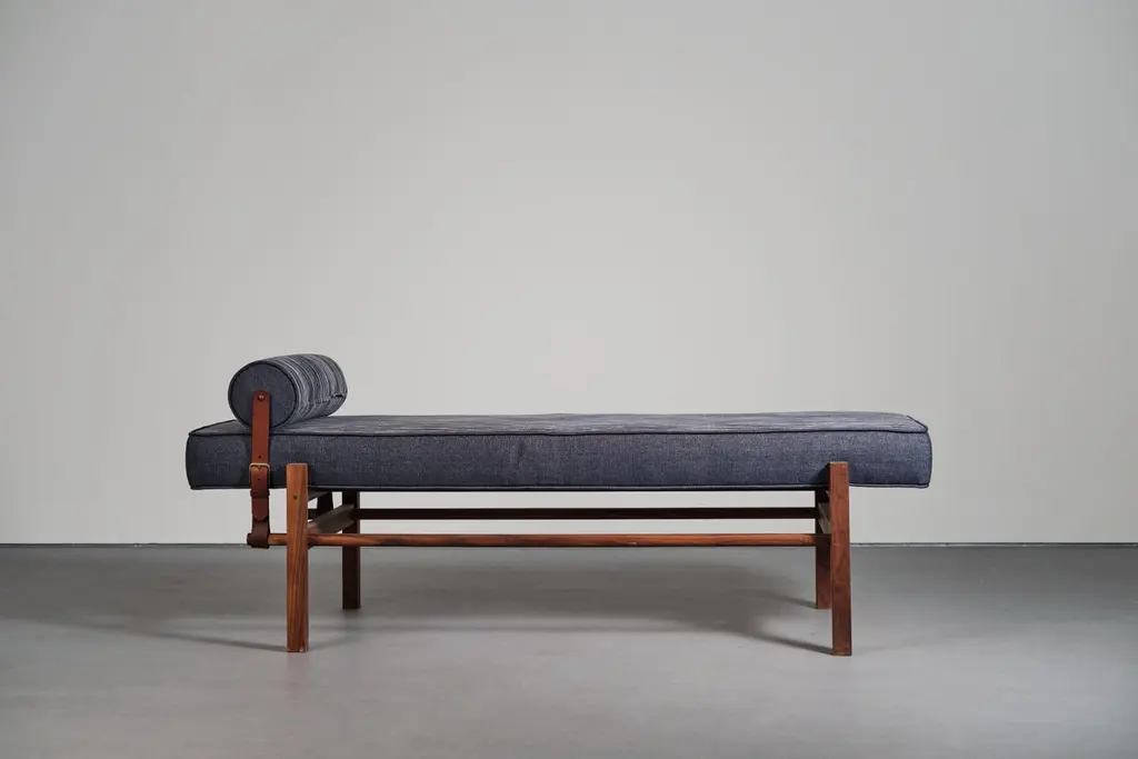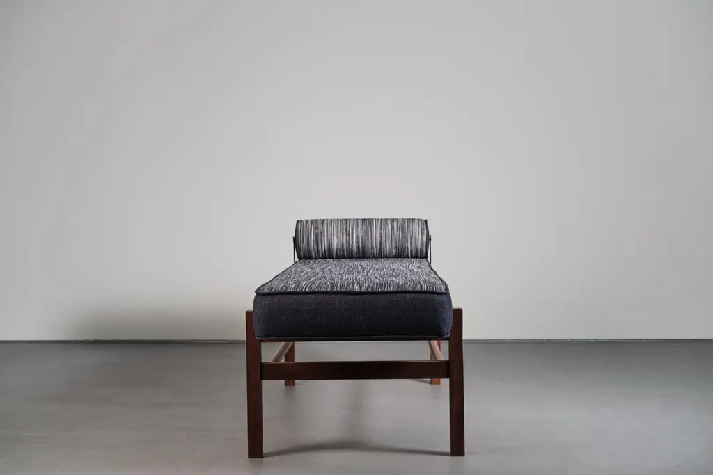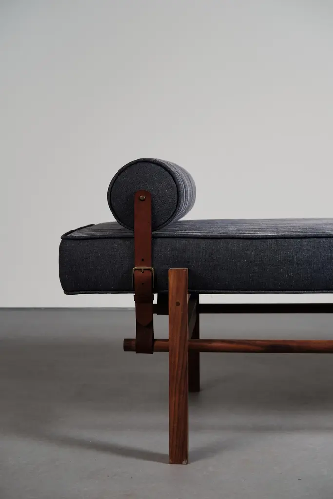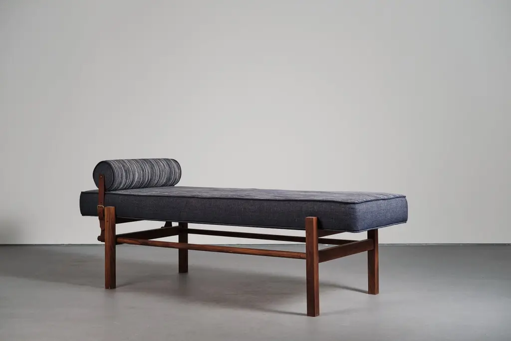 New Handcrafted Daybed in Walnut Wood and Mallorcan Textile by Nico GuevaraThis daybed is the result of a collaboration between Mallorcan textile manufacturer Teixits Riera and the Nico Guevara studio. Both based in Mallorca, they focus on combining tradition and craftsmanship to create a product with a distinctly Mediterranean essence.From the outset, the goal was to develop a piece of furniture that reflects the rural austerity of the island, using natural materials such as wood, fabric, and leather. The simplicity of the structure is designed to honor the artisanal quality of the fabric. A leather belt links the walnut frame to the upholstery, joining the elements and adding character to the piece. The pillow is secured by this belt, creating a subtle balance between the different components.BIO - Nico GuevaraNico Guevara studied industrial design at the Massana School in Barcelona, where he also began his career. He spent several years as part of the design team at the Lottusse footwear brand before working as a freelance product designer, splitting his time between Palma and Barcelona. He has also complemented his design work with teaching.