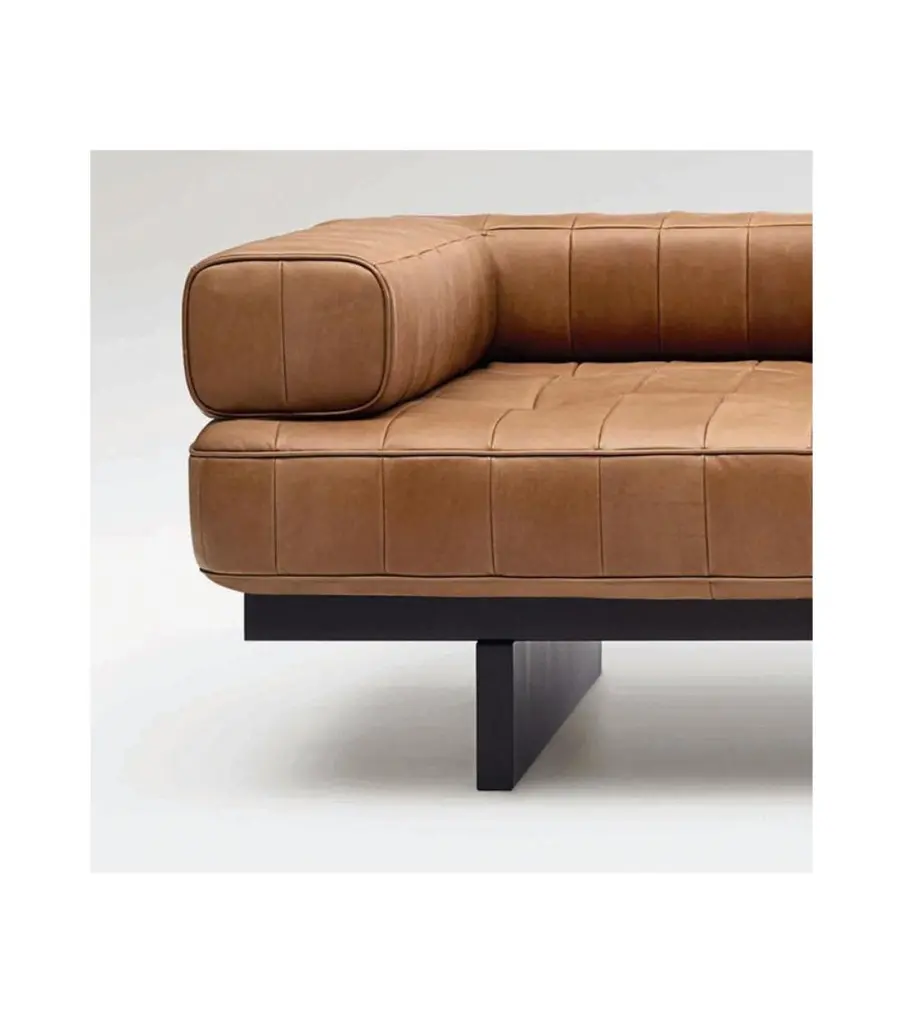 Feet up and just unwind – our DS-80 relocates sleep to the daytime hours, the time when we are supposed to be active and getting things done. Its subtle appearance reminds us to take a relaxing break from our hectic everyday lives once in a while – and that’s certainly nothing to be ashamed of.The modest dimensions of the daybed are a benefit here, as they gently force you to spend some time on your own. Part of the basic furnishings of any upscale interior in the 1920s, the flat daybed has been enjoying a Renaissance for several years now. Our daybed caused a stir more than 30 years ago, with its elaborate patchwork processing and freely placeable back cushions. This timeless Classic has now been gently updated. It is available both as a daybed and as a small lounge sofa, too.The daybed doubles as a lounge sofa The daybed DS-80 has established itself as a timeless Classic by De Sede ever since it was launched in 1969: to this day, the model is a paradigm of highclass leather manufacture andpopular all-over the world.To be honest, we’re not quite sure which we like better: the newly produced models or the 50-year-old sculptures that have acquired a patina of their own. A narrow, high-quality mattress lies atop a frame made of filigree wood slats – the patchwork is sustainably made of just a single hide.Additional Information:Materials: LeatherCategory: Select-NougatType: Nappa leather, lighty pigmentedThickness: 1.2 to 1.4 mmCharacteristics: Meticulous processing preserves the natural quality – with a characteristic pattern of creases, grain and pores. After tanning, it is dyed with a special finish to maintain the natural aura while also offering improved protection. It undergoes visible ageing, lending it an endearing patina.Dimensions: 204 W x 92 D x 58 H cmAvailable in other upholstery options: Living, touch, naturale, coloral.