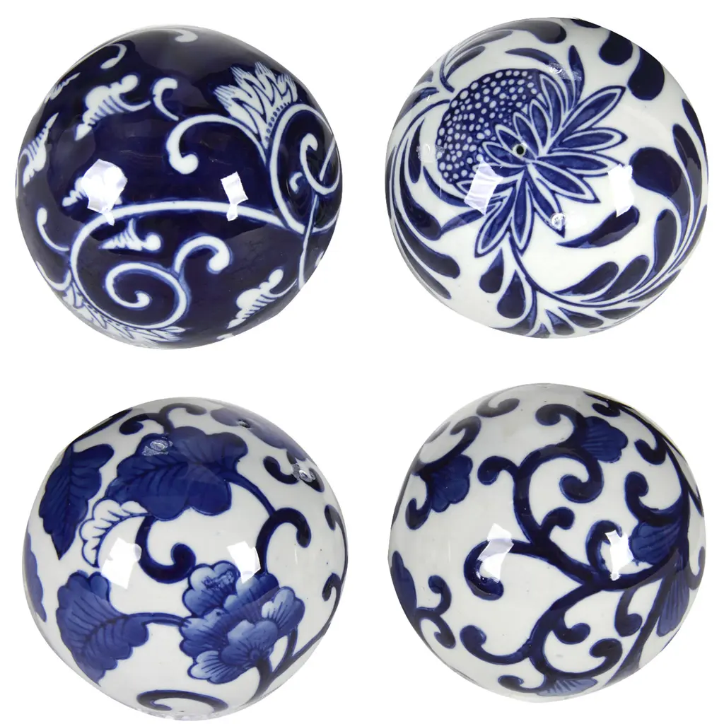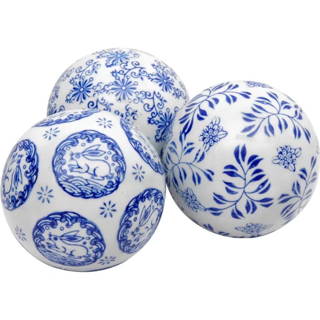 Set of three fine Chinese vitreous porcelain decorative spheres. Contemporary oriental style decorative curios perfect for table top, book case, or architectural display. Finished with authentic Ming dynasty era art designs to serve as intriguing home decor accents.