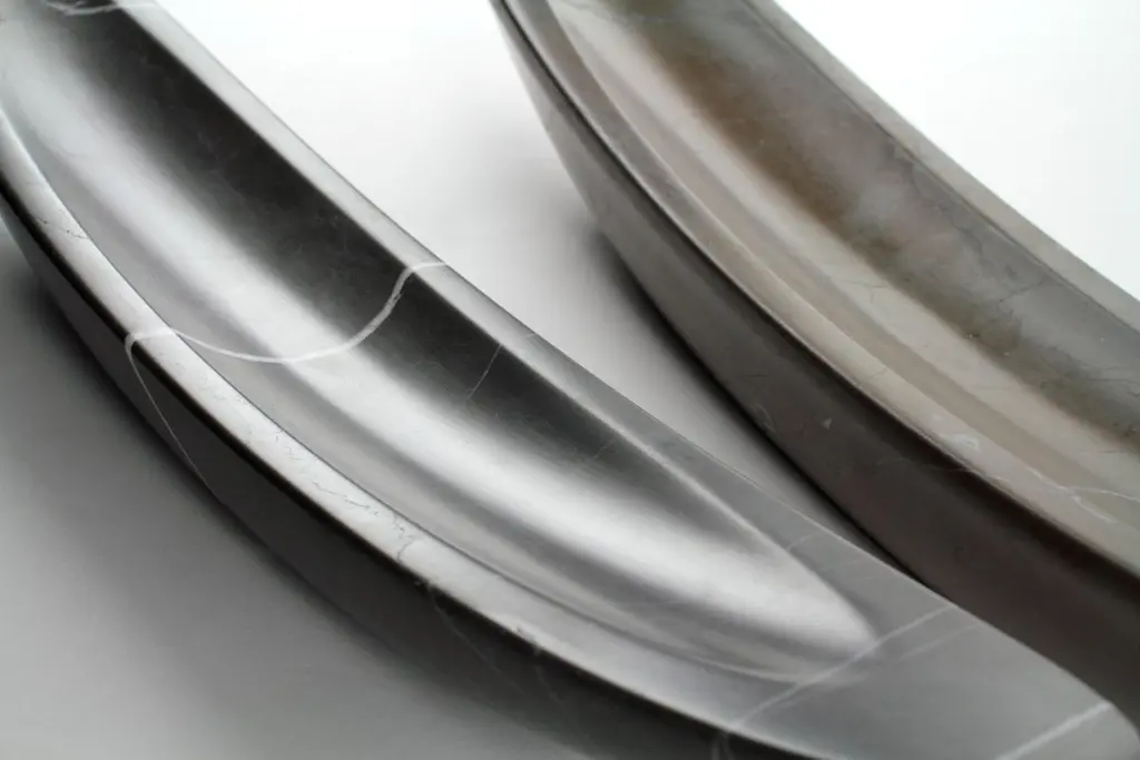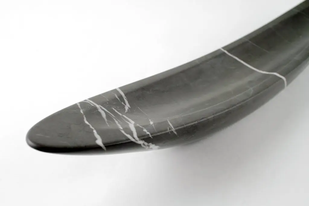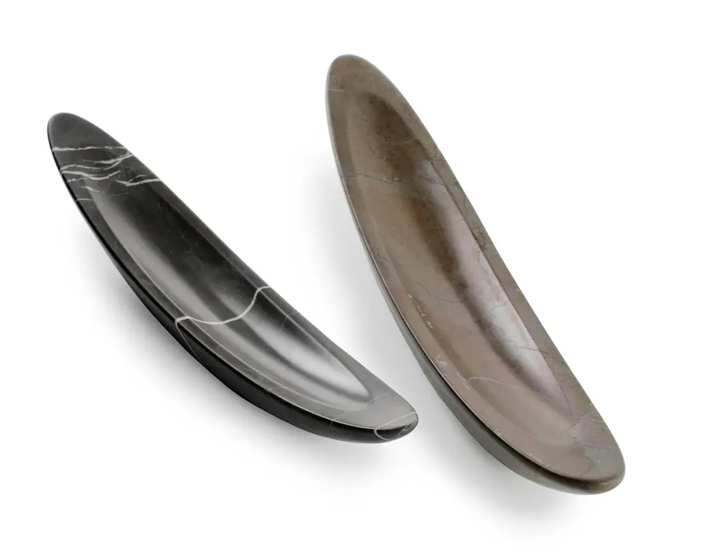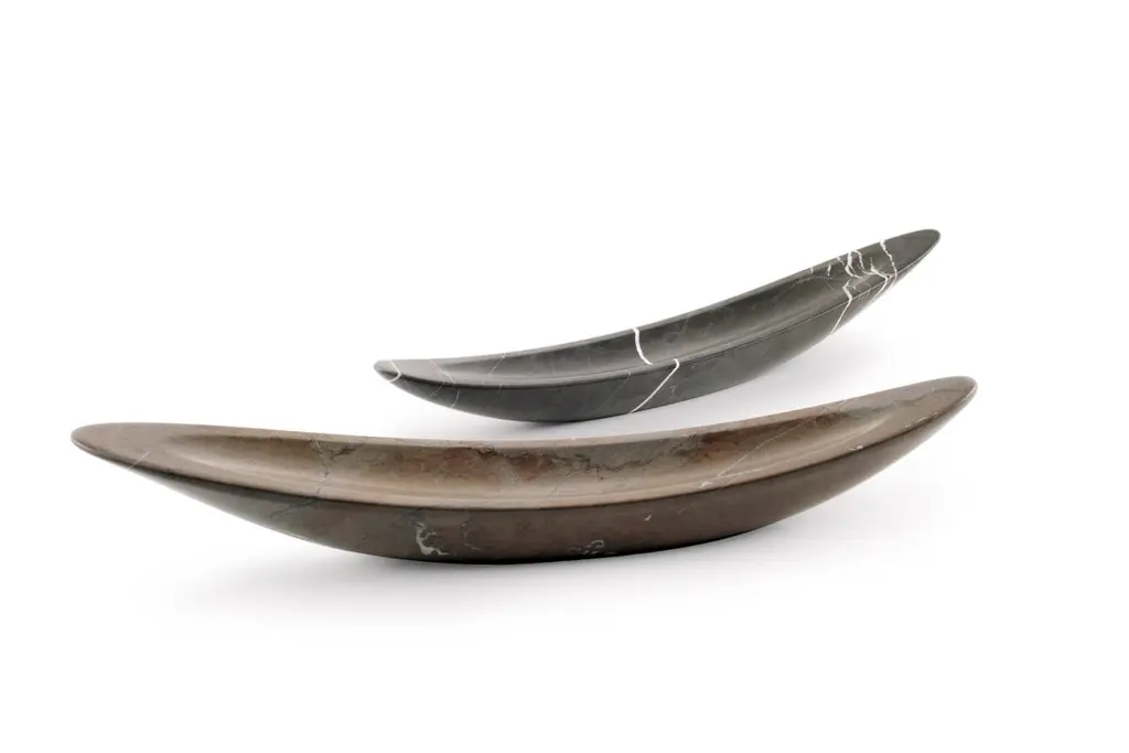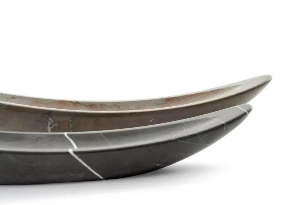 Gondola, big elegant bowl, hand-sculpted from a solid block of Imperial Grey marble.Bowl dimensions: Small L 55, W 12, H 9.5 cm.Also available: Large L 65, W 13, H 11 cm.Available in different marbles. 100% handmade in Italy.Quartzite is a natural material, every piece is unique as each quartzite block is different in veins and color shades. All of our creations are handmade by Italian artisans and can slightly vary in shape and size. This is to be considered as a guarantee of a handmade object. All Pieruga objects are made of precious and natural marbles and onyx. Marble is sensitive to acid-based liquids, especially a prolonged contact with substances such as wine, lemon, vinegar, fruit juices, cola and alcohol can stain the surface.Cleaning should be carried out with a soft sponge, water and neutral detergent. Do not use metallic or abrasive sponges, do not wash in the dishwasher, do not use in the microwave. The color of the marble after washing can undergo variations due to the humidity trapped in the surface’s micro-pores. Once fully dried it will regain its original color. The brass inlays tend to oxidize over time, to make them return to shine again use a soft cotton pad soaked in a solution of water and traditional Marseille soap, gently rub over the brass inserts and rinse the surface thoroughly. We are against the use of chemical products, all Pieruga objects are processed and polished through long manual processes without the use of polishing liquids.Pieruga proudly creates elegant accessories and complements in marble through artisanal processes, bringing into dialogue ancient techniques of sculpture with advanced technologies. 100% handmade in Italy.Our mission is a clear signal of opposition to the enormous waste that occurs in the extraction and processing of large blocks of marble, tons of material are discarded and thrown, in disfigurement to the generosity of our mountains.Rediscovering the ancient art of manual sculpture we give new life to even the smallest fragment of marble, bringing to light its millenary beauty that is lost in more than 2000 years of architecture and sculpture.Pieruga marble is a new brand by Barberini & Gunnell.The Atelier Barberini & Gunnell was founded by the architects and designers Francesco Barberini and Nina A. Gunnell The artworks by Barberini & Gunnell are regularly shown at international art fairs, such as PAD London, PAD Genève, PAD Monaco, Salon Art + Design New York, Art Miami.IMPORTANT INFORMATION REGARDING SHIPPING:We carefully pack all artworks in strong wooden crates to ensure safe transport. This service is done directly in our atelier and is complimentary. All of our artworks travel with a shock watch system in order to monitorate rough handling by shippers and movers.