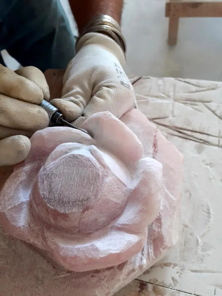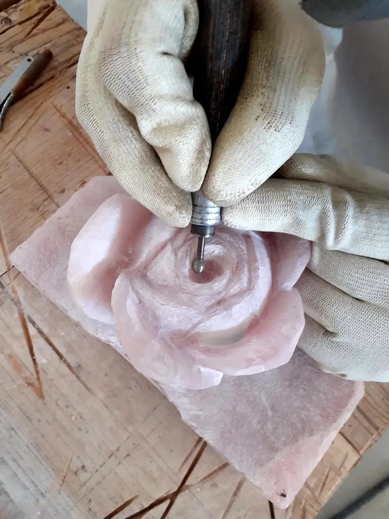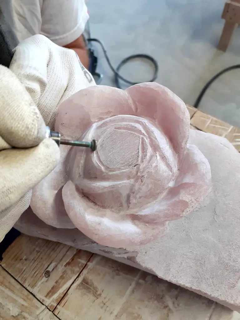 Rose blossom sculpted entirely by hand starting from a solid block of white statuary marble.Dimensions: D 12 x H 12 cm. Available in different marbles, onyx and quartzite. Each rose is hand signed and numbered by the artists (engraved), 100% hand made in Italy and comes with a "Certificate of Authenticity "Quartz is a natural material, every piece is unique as each quartz block is different in veins and color shades. All of our creations are handmade by Italian artisans and can slightly vary in shape and size. This is to be considered as a guarantee of a handmade object. All Pieruga objects are made of precious and natural marbles and onyx. Marble is sensitive to acid-based liquids, especially a prolonged contact with substances such as wine, lemon, vinegar, fruit juices, cola and alcohol can stain the surface.Cleaning should be carried out with a soft sponge, water and neutral detergent. Do not use metallic or abrasive sponges, do not wash in the dishwasher, do not use in the microwave. The color of the marble after washing can undergo variations due to the humidity trapped in the surface’s micro-pores. Once fully dried it will regain its original color. The brass inlays tend to oxidize over time, to make them return to shine again use a soft cotton pad soaked in a solution of water and traditional Marseille soap, gently rub over the brass inserts and rinse the surface thoroughly. We are against the use of chemical products, all Pieruga objects are processed and polished through long manual processes without the use of polishing liquids.Pieruga marble is a new brand by Barberini & Gunnell.The Atelier Barberini & Gunnell was founded by the architects and designers Francesco Barberini and Nina A. Gunnell.The artworks by Barberini & Gunnell are regularly shown at international art fairs, such as PAD London, PAD Genève, PAD Monaco, Salon Art + Design New York, Art Miami.IMPORTANT INFORMATION REGARDING SHIPPING:We carefully pack all artworks in strong wooden crates to ensure safe transport. This service is done directly in our atelier and is complimentary. All of our artworks travel with a shock watch system in order to monitorate rough handling by shippers and movers.