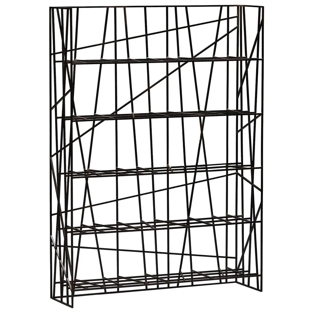 This bookcase is a striking modern sculpture that will make a bold statement in any contemporary interior. Crafted of metal sheets with different textures, obtained with detailed laser-cut work, and welded together in a unique geometric composition, this piece features five long shelves. Customization available in a wide range of bold and vibrant colors. A leather shelf top measuring L 31.5 x W 33.9 can be added on request, ask the Concierge for details and pricing.