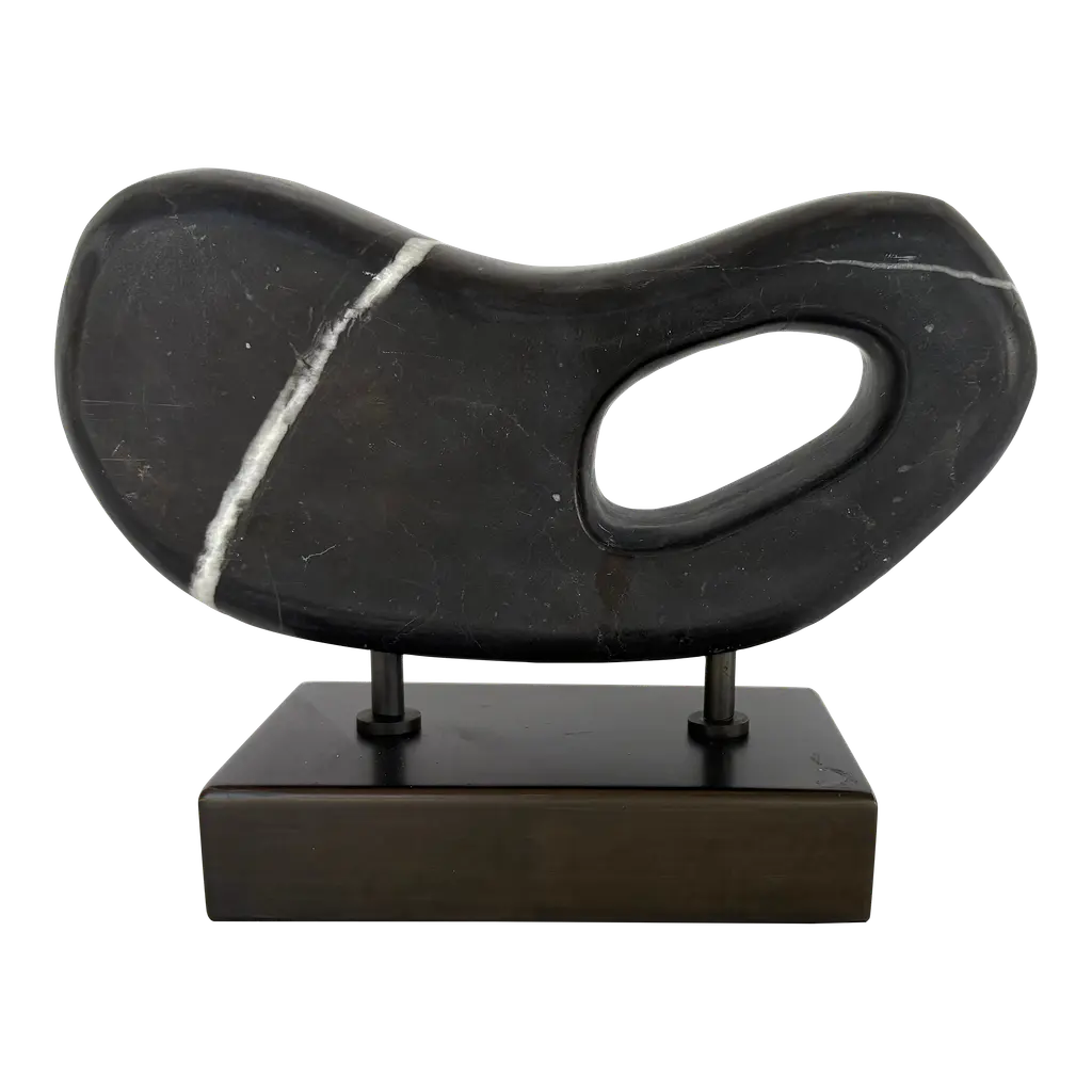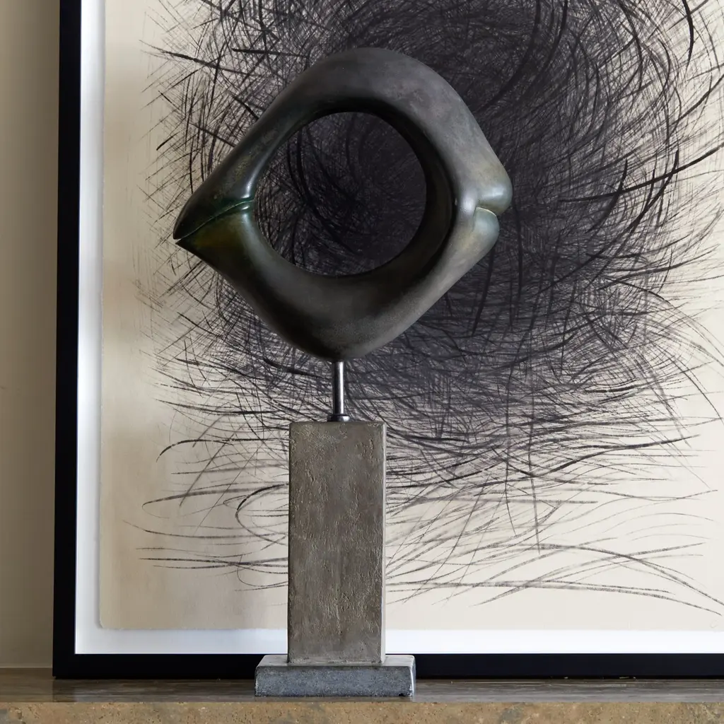 The Delphina sculpture is a smooth abstract adaptation of a tidal wave crashing in on itself. The smooth, calm exterior is contrasted by a raked texture interior. A bronze finish is applied to sand cast iron atop a granite base, keeping the sculpture rooted in elegance with an artistic flair. Place on a bookshelf, side table or console table to inspire meaningful conversation.