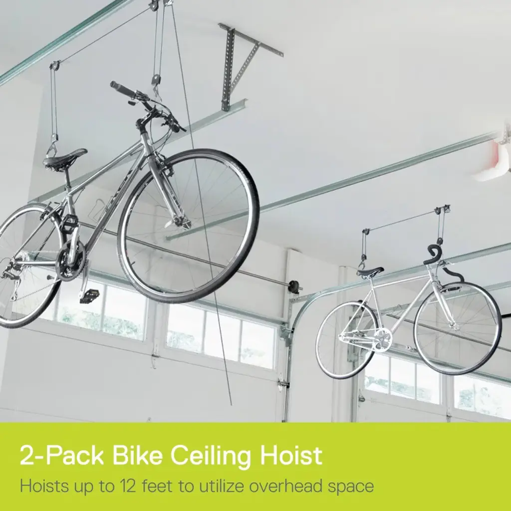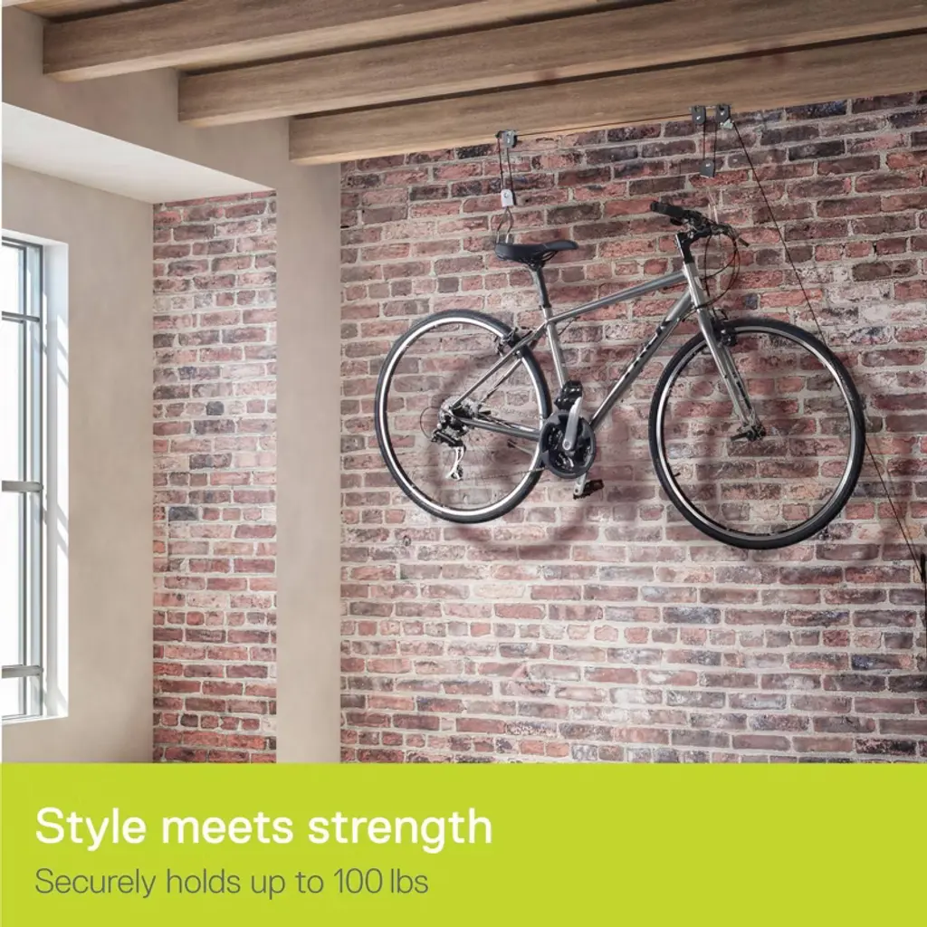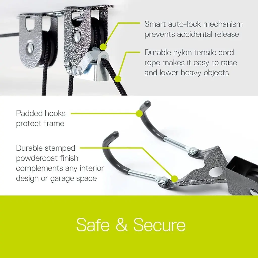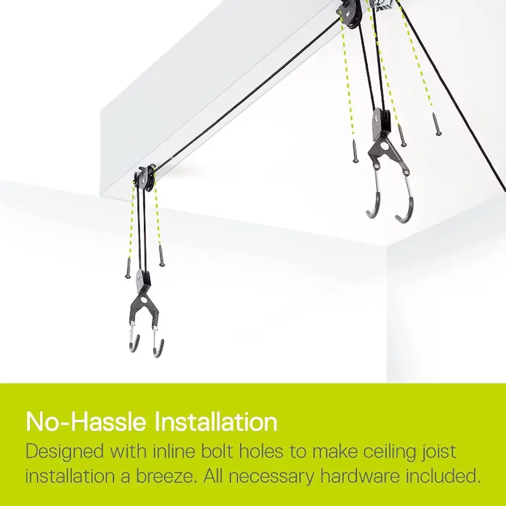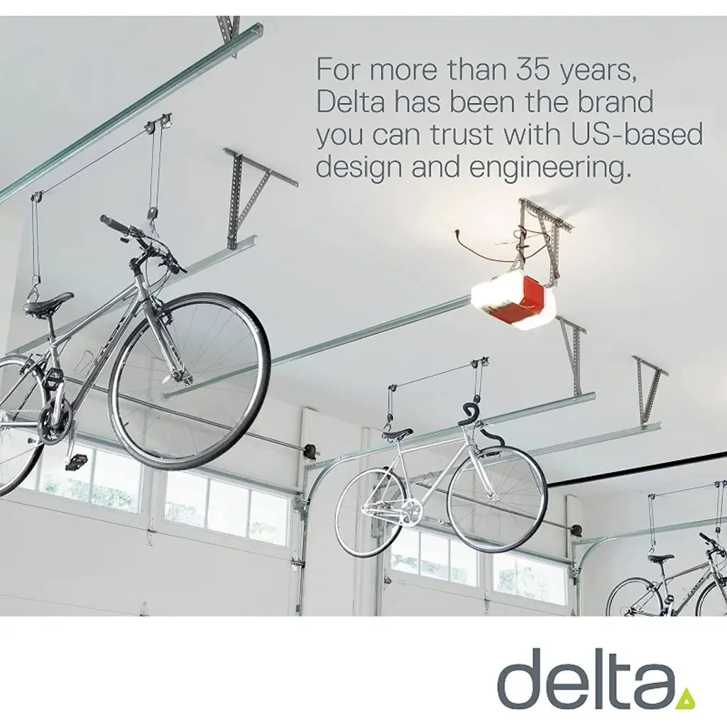 Tired of the endless struggle to organize your garage space and access your bikes, kayaks and other large items? We have the solution you've been waiting for. The Delta Bike Hoist Pro Garage Bike Storage and Kayak Storage system is designed to simplify your life, maximize your garage space, and ensure your gear is stored safely and efficiently for the long term.No one wants to spend hours dealing with complicated setups. Our Bike Hoist Pro is the answer to stress-free installation. This innovative system comes pre-assembled, eliminating the need for tedious rope threading and pulley alignment. Enjoy the convenience of indoor bike storage without the headaches.We understand that your gear comes in all shapes and sizes. Our sliding pulleys provide a customized fit for any style bike or kayak. Plus, we've taken safety to the next level with a built-in auto-locking mechanism. You'll experience both convenience and peace of mind with our garage ceiling storage racks.Quality and durability are at the heart of our bike lift. Crafted from robust steel, it's designed to withstand the weight of your bikes, kayaks, and more. The heavy-duty screws ensure it remains securely mounted to your ceiling joists, while the premium nylon tensile cord won't degrade over time. You can trust that this system will be your reliable storage partner for the long term.In addition to your bikes, our system creates ample space to elevate and secure items up to 100 lbs effortlessly. We've included straps for canoes, kayaks, and other items taking up precious floor space. Now neatly organized, your garage will live up to its storage potential.