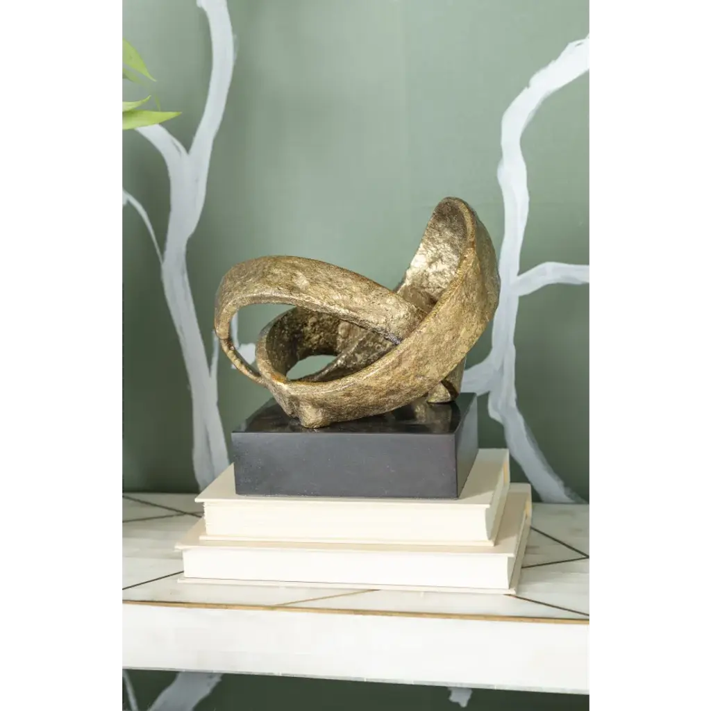 With the Demi Statue, our artisans have miraculously made solid iron appear weightless and pliant, twisting and encircling itself in a way that defies its nature. The abstract rendering, finished in gold leaf with a raw, hammered texture, is inspired by the masters of the modernist movement, such as Barbara Hepworth and Henry Moore. Displayed atop a thick black marble base, the Demi melds with your room's ambiance, while sparking plenty of interest itself.