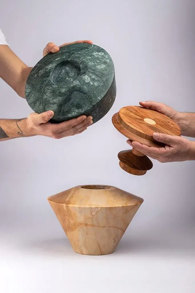 A collection made of Biancone, Red Alicante, Guatemala Verde, Siena yellow, Emperador and cherry wood elements made with manual lathe; Two companies in the Neapolitan area that center production excellence, the search for materials, the unique and valuable processing. Infinite solutions are obtained that determine crossed destinies, different forms and perceptions of our state of being. A Collection made of Trani Biancone, Alicante Red, Guatemala Green, Siena Yellow, Emperador and Cherry Wood Elements made with Manual Lathe; Two Companies in the Neapolitan area that focus on production excellence, The Search for Materials, The Unique and Precous Workmanship. Infinite Solutions Are Obtained That Determines Crosted Fates, Different Forms and Perceptions of our State of Being.