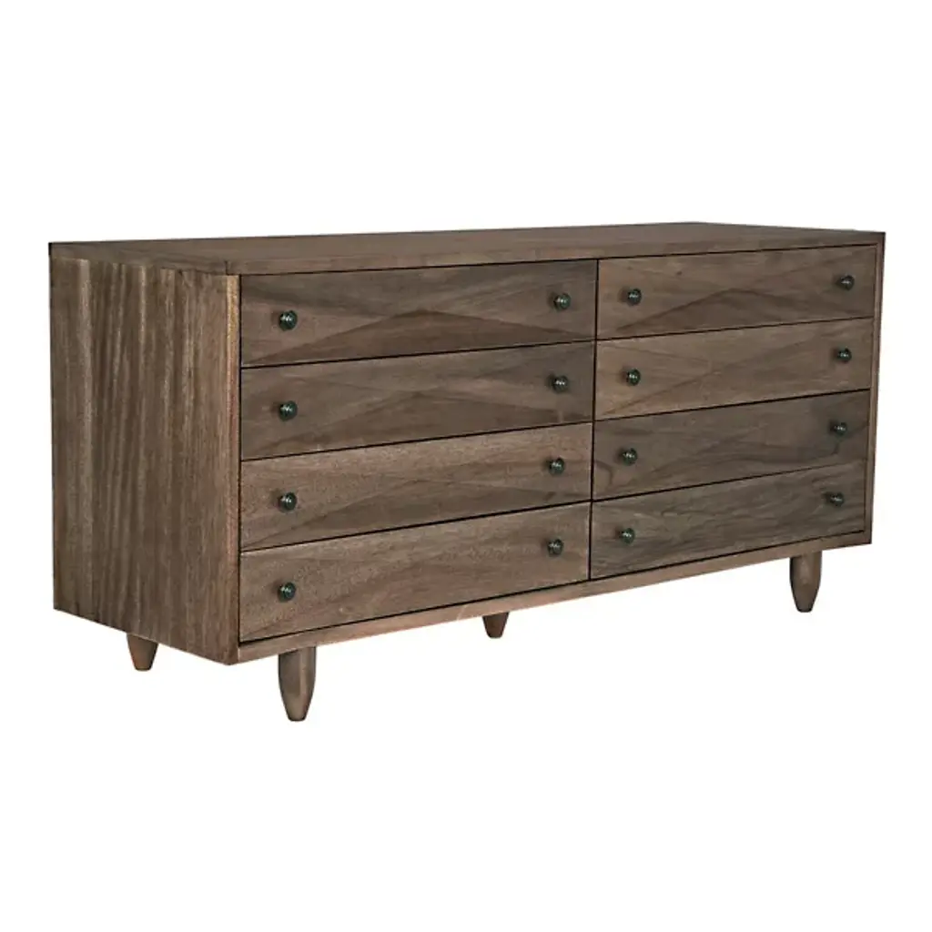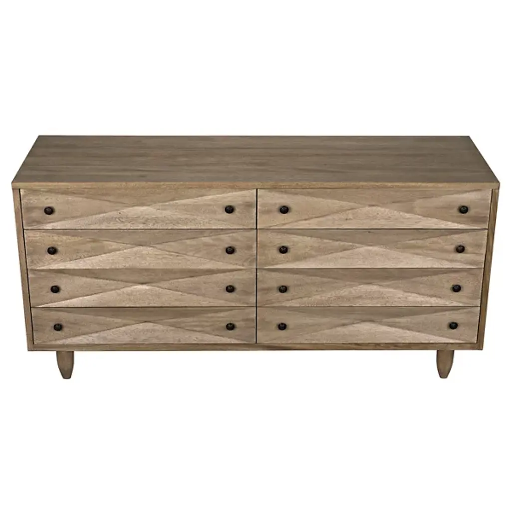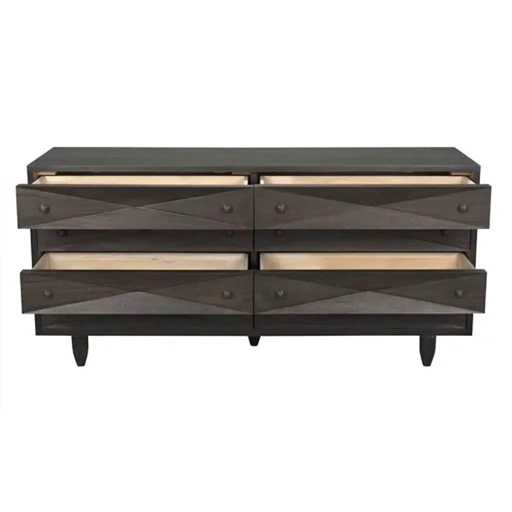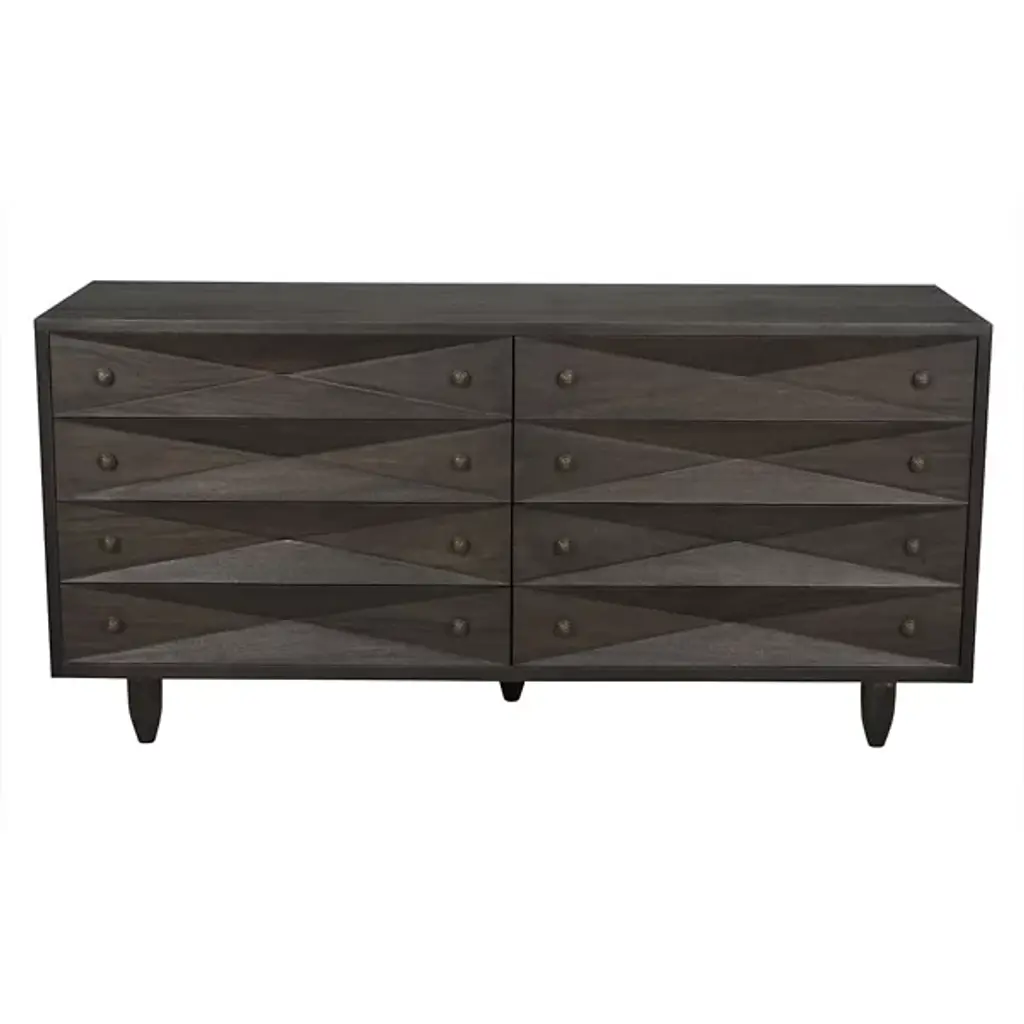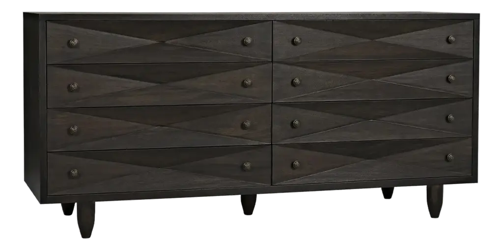 The Diamond Double Chest Dressers from Noir elevate simple storage into textural sculpture through bold diamond-shaped carvings that flow across each of the eight drawer fronts. Every carved element catches light differently, creating dynamic surface play while maintaining geometric order across the walnut composition. The rich finish intensifies each carved valley and ridge, while black metal pulls provide functional accents without competing with the carved details. Simple tapered legs elevate the substantial case, proving that a repetitive pattern can achieve maximum visual impact through skilled handwork.