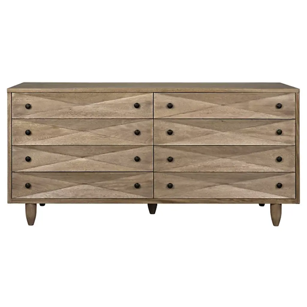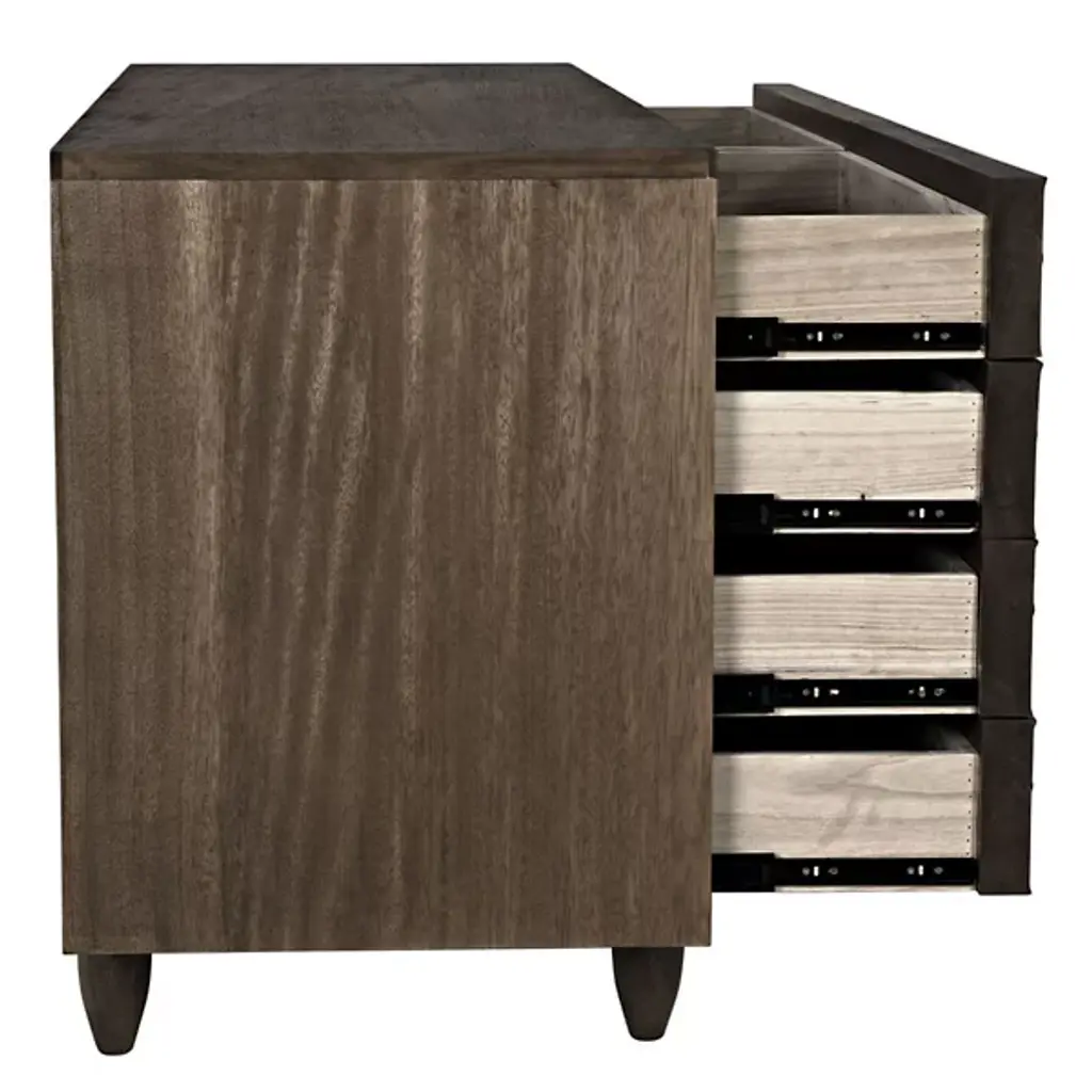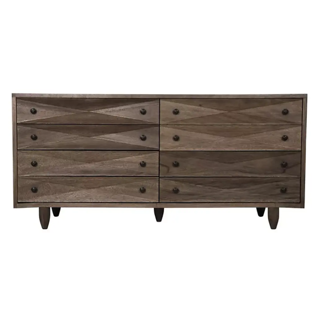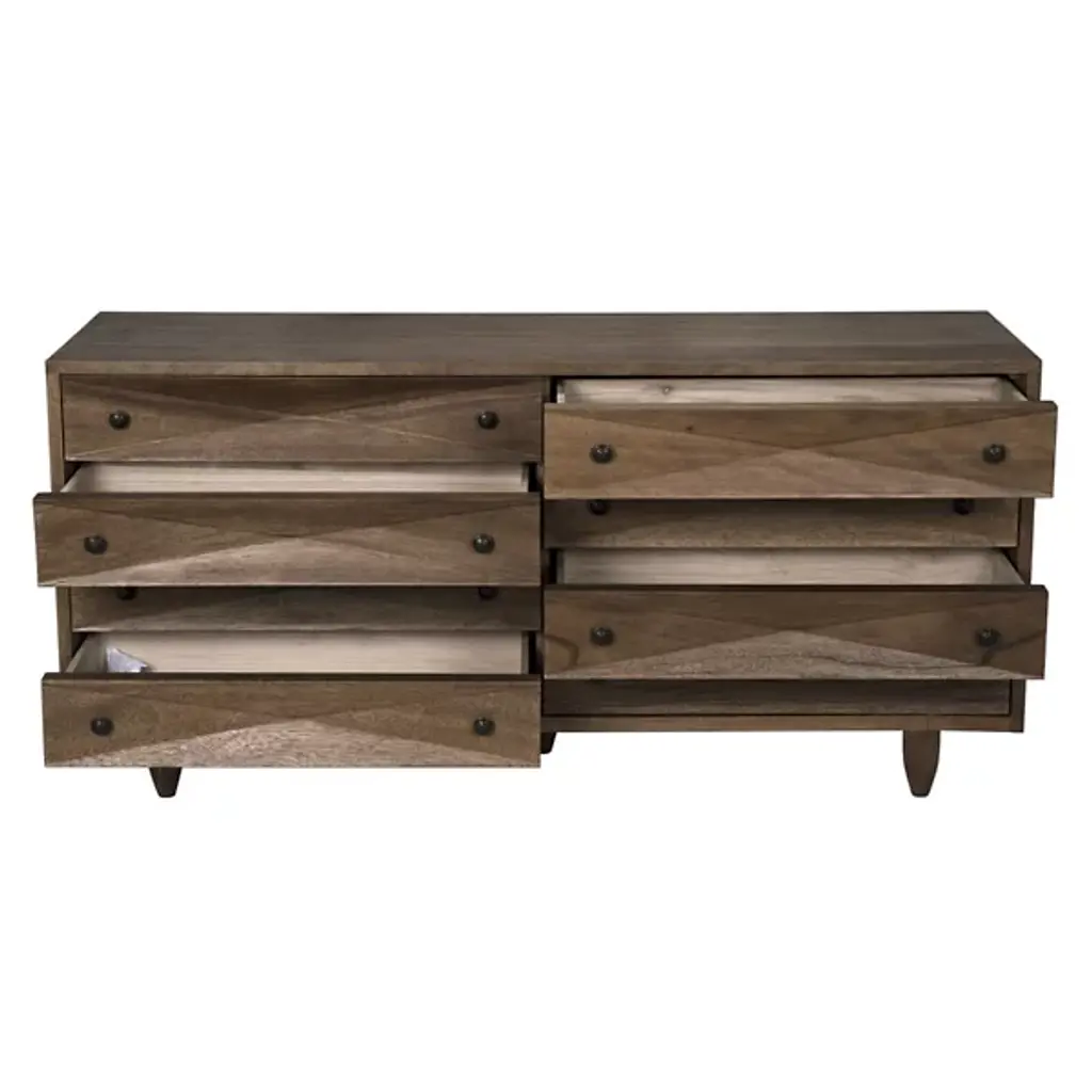 The Diamond Double Chest Dressers from Noir elevate simple storage into textural sculpture through bold diamond-shaped carvings that flow across each of the eight drawer fronts. Every carved element catches light differently, creating dynamic surface play while maintaining geometric order across the walnut composition. The rich finish intensifies each carved valley and ridge, while black metal pulls provide functional accents without competing with the carved details. Simple tapered legs elevate the substantial case, proving that a repetitive pattern can achieve maximum visual impact through skilled handwork.